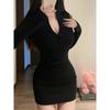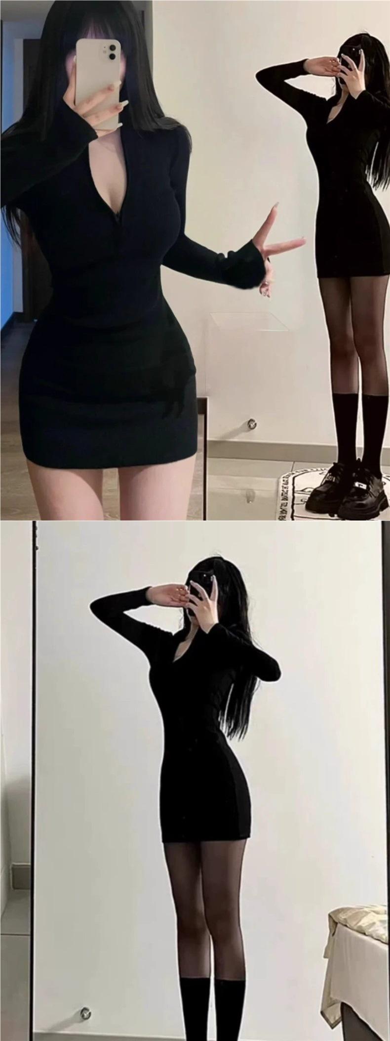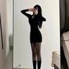 Vestido Preto Justo Sexy Modelador Manga Longa Feminino Verão 2025 Novo Estilo Roupa Íntima Saia Curta Bodycon