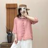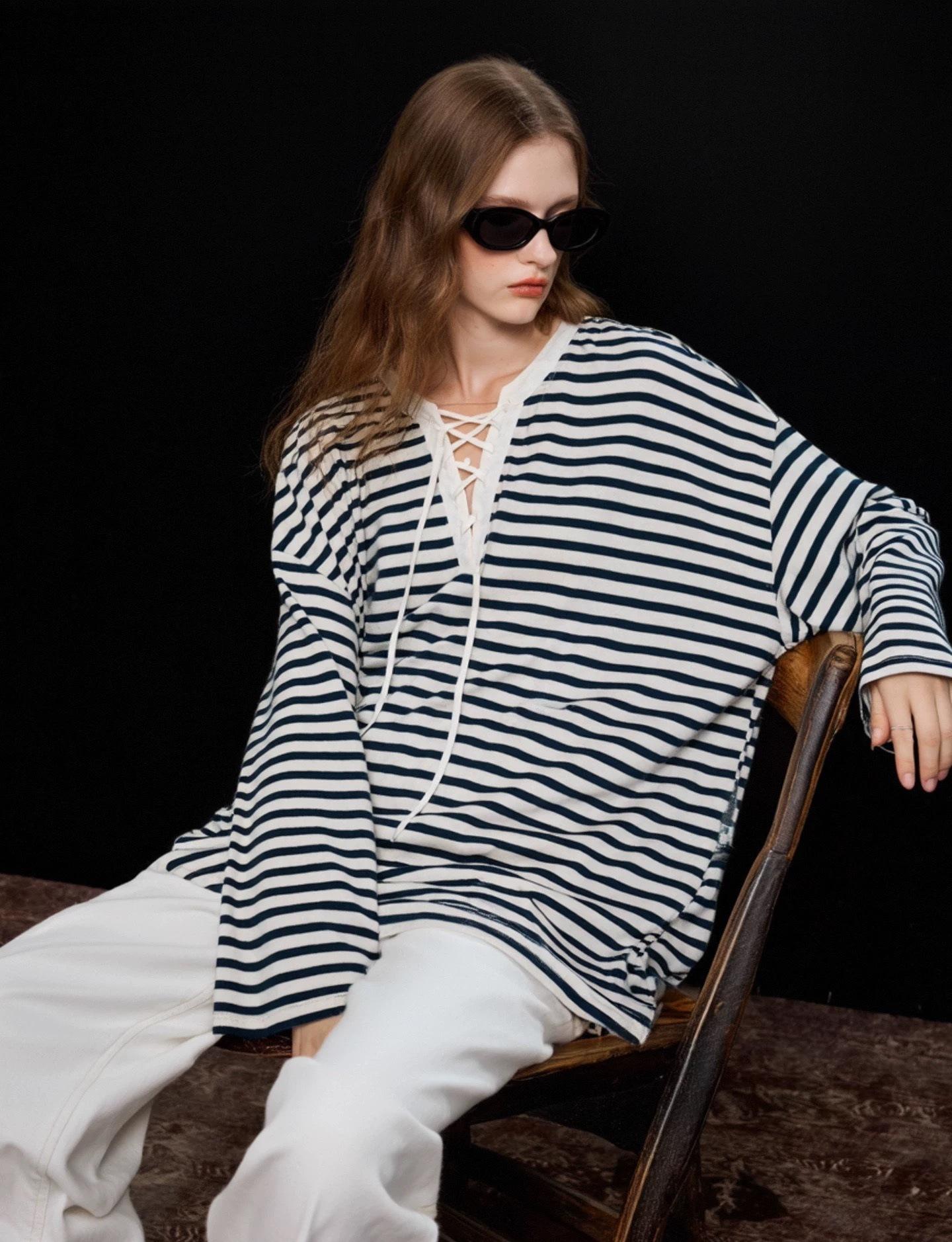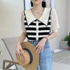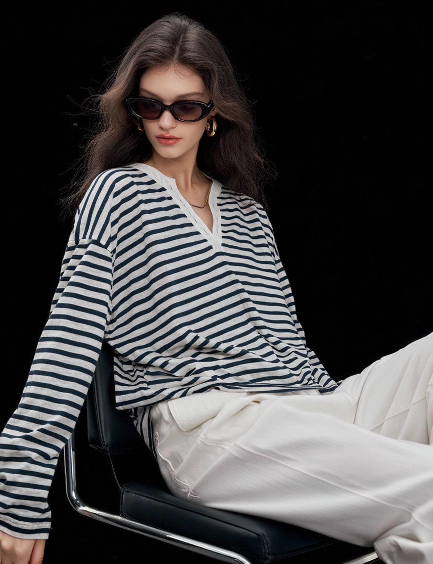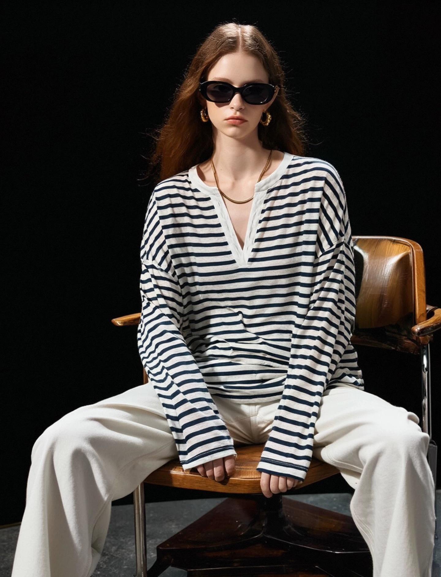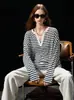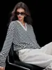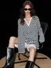 Camiseta Listrada Solta de Meio Botão Francês Mulher 2025 Início do Outono Novo Protetor Solar Temperamento Cardigã Top
