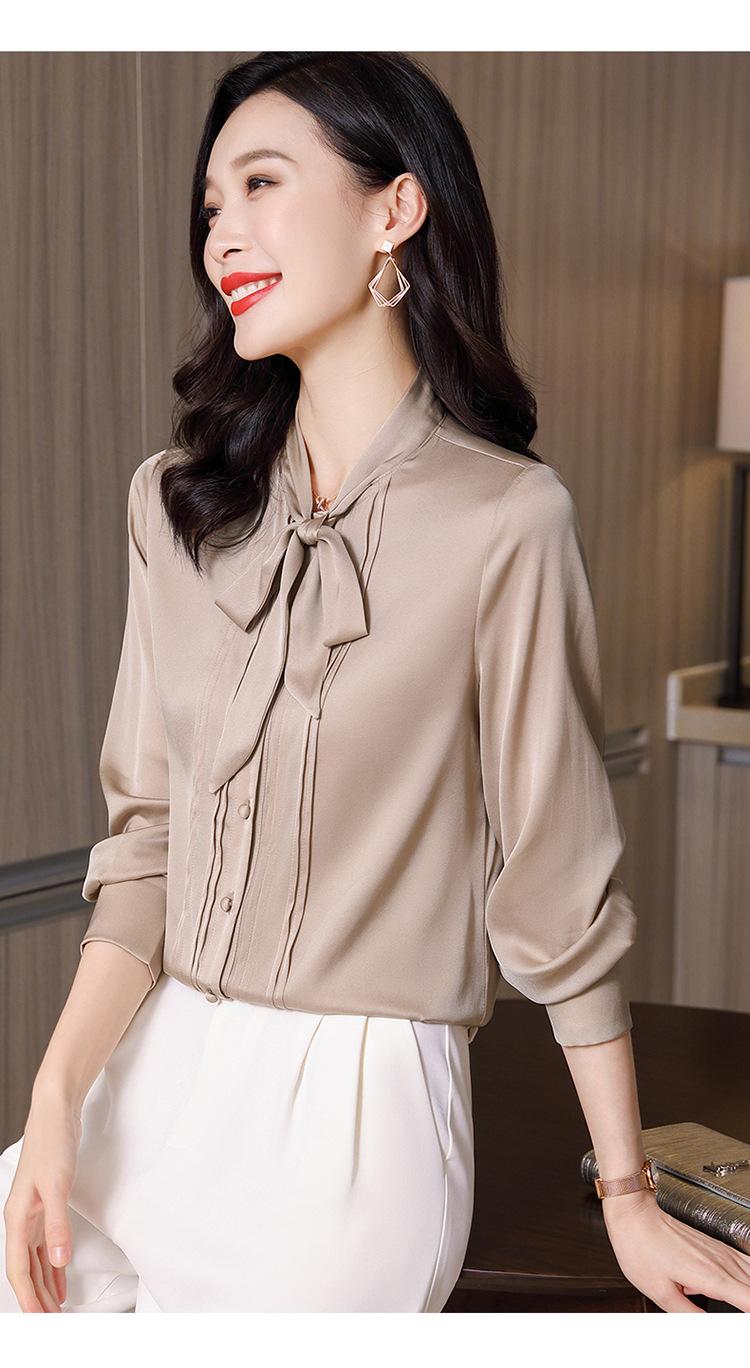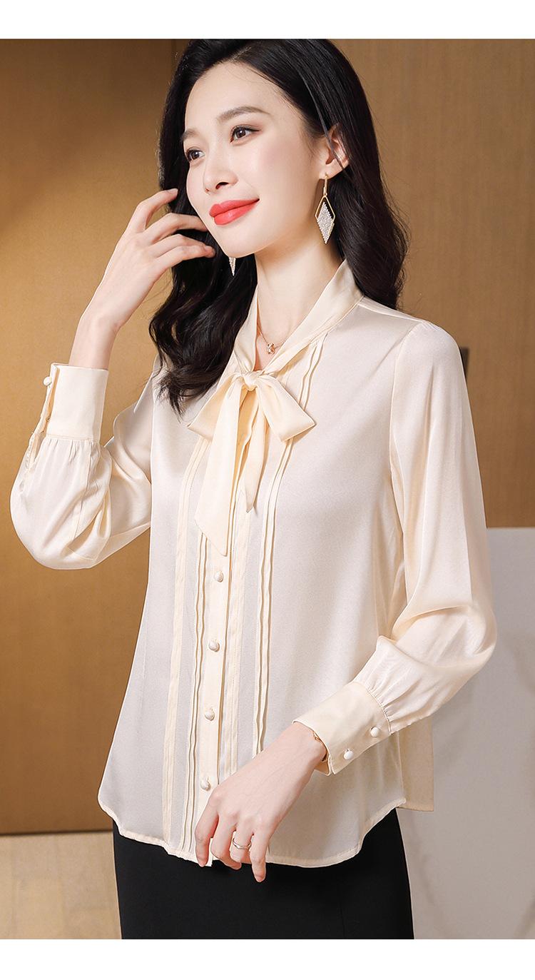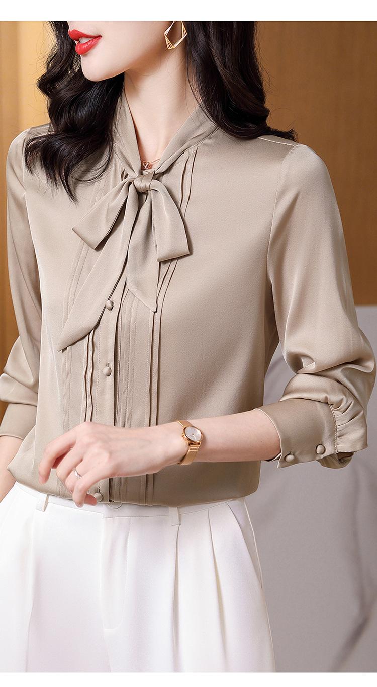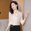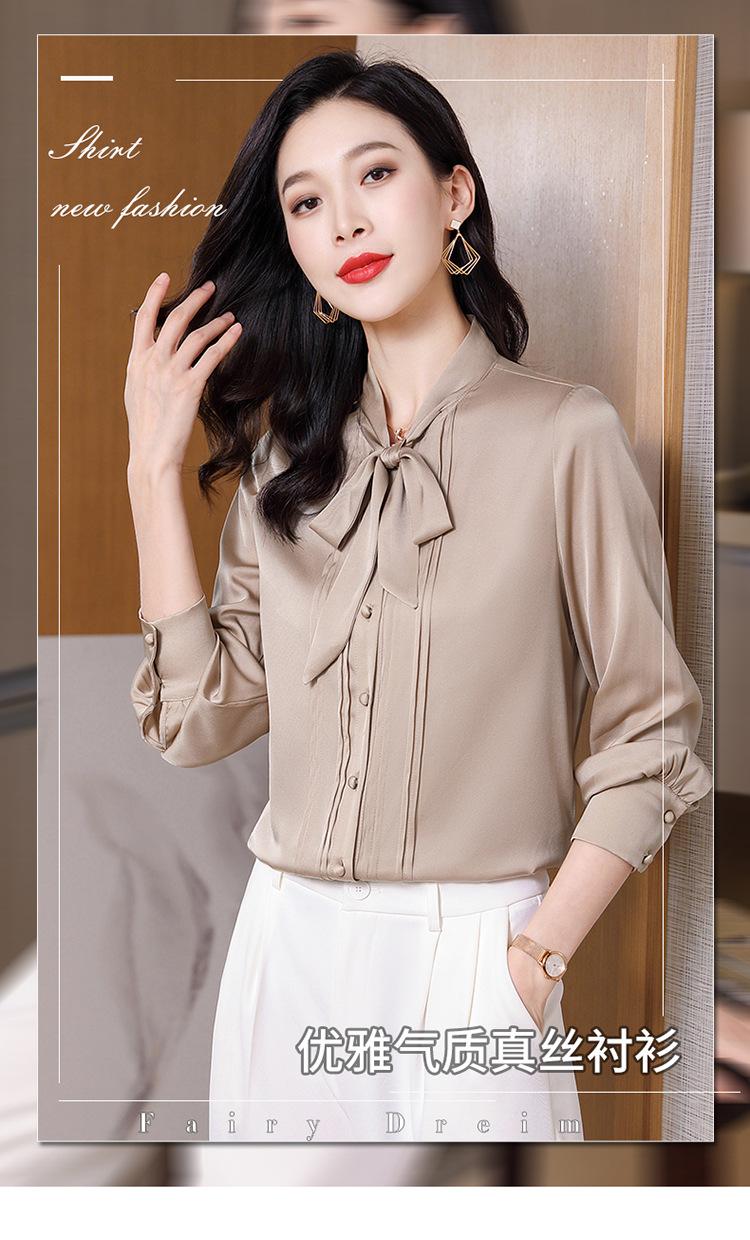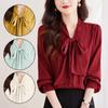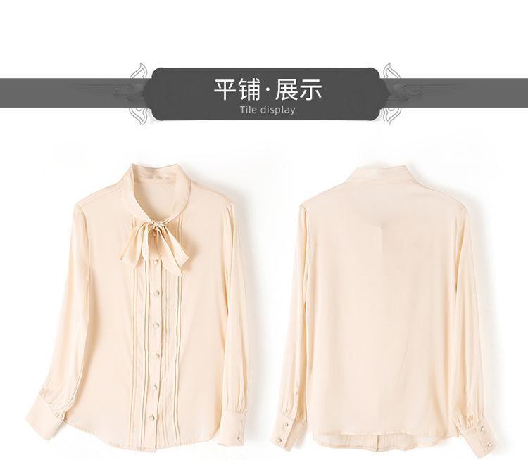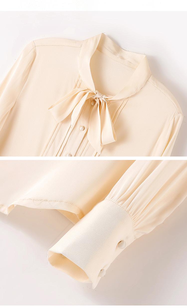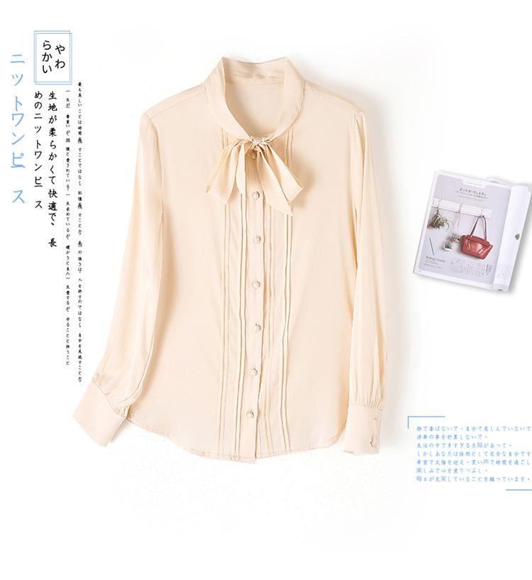 Camisa Nova de Primavera e Outono de Seda Pesada de Alta Qualidade para Mulheres, Camiseta de Seda de Amora com Laço de Fita de Manga Comprida
