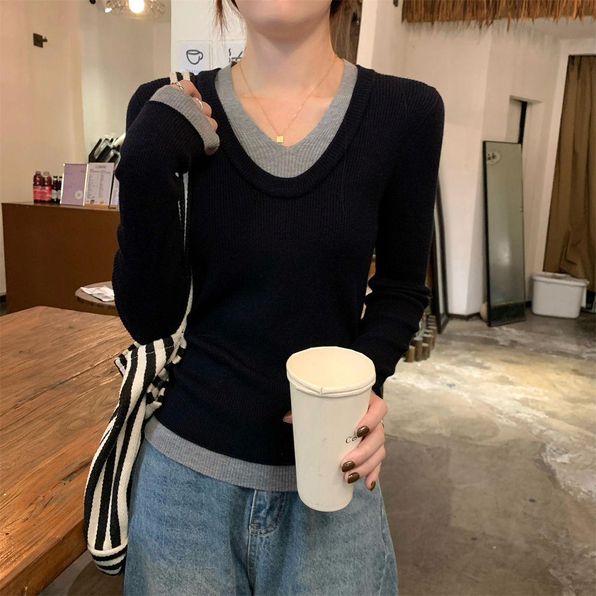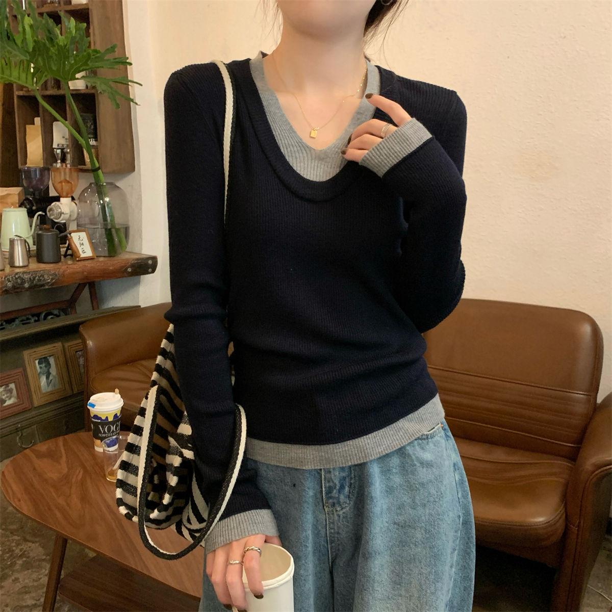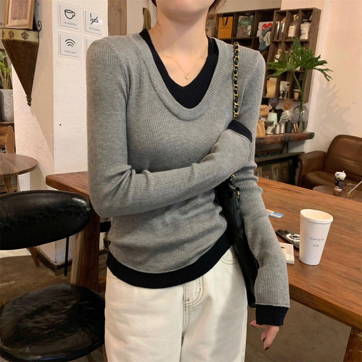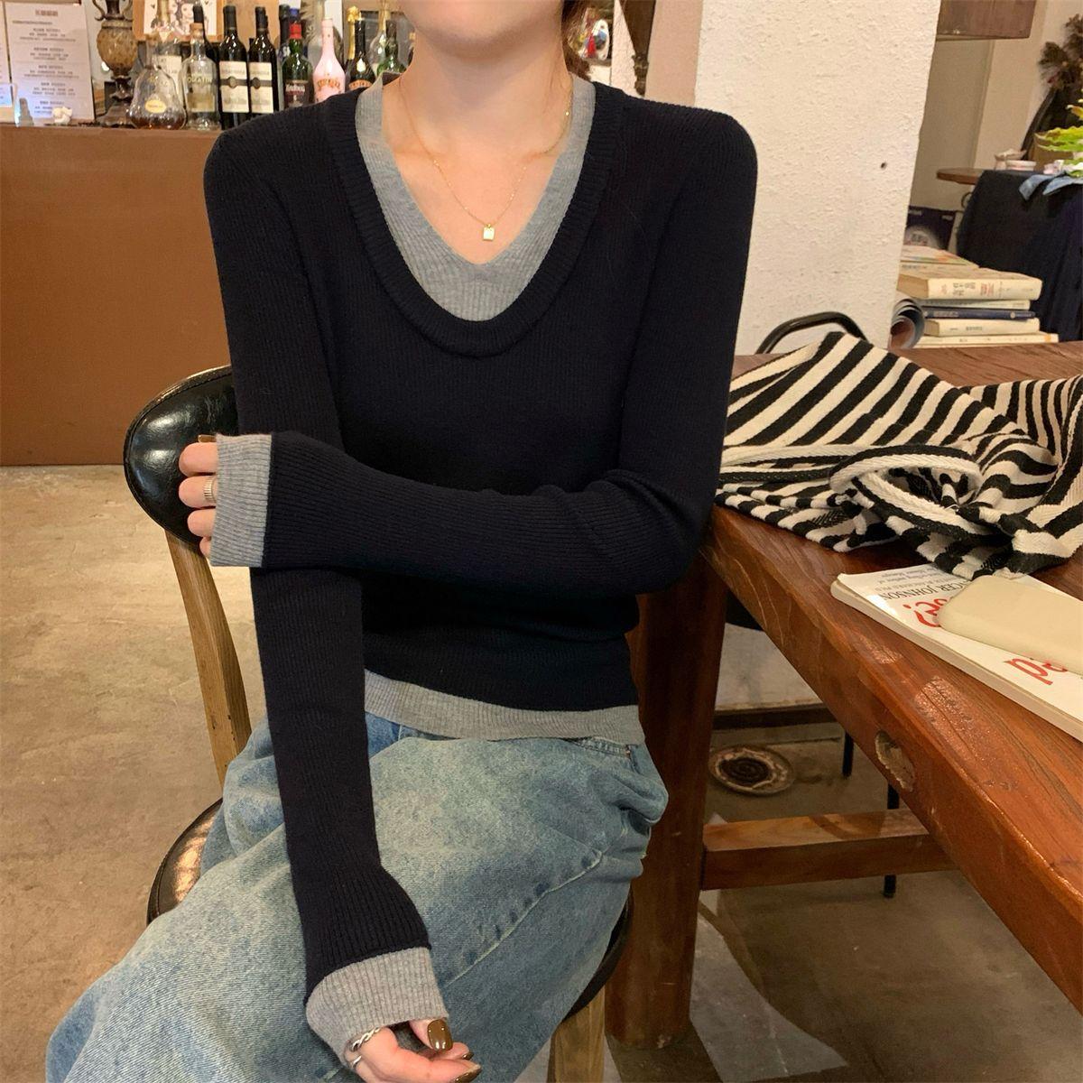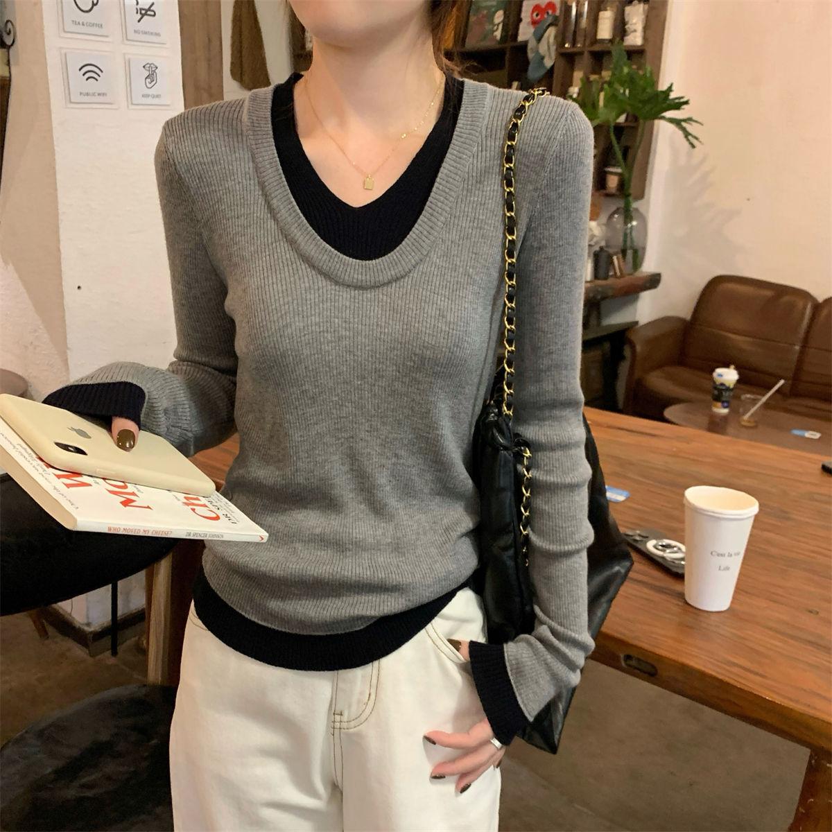 Tricô feminino versátil estilo coreano com design de duas peças falsas, novo para outono e inverno, modelagem slim, afunilando a cintura, cobrindo a barriga, top moderno