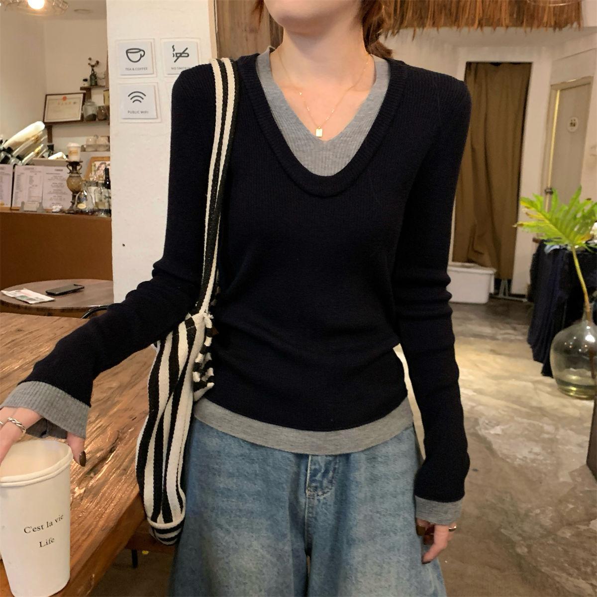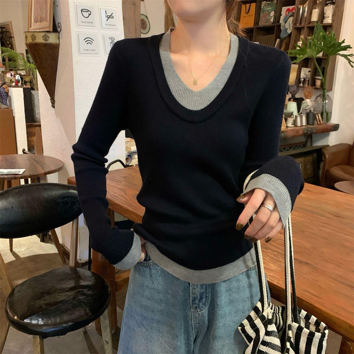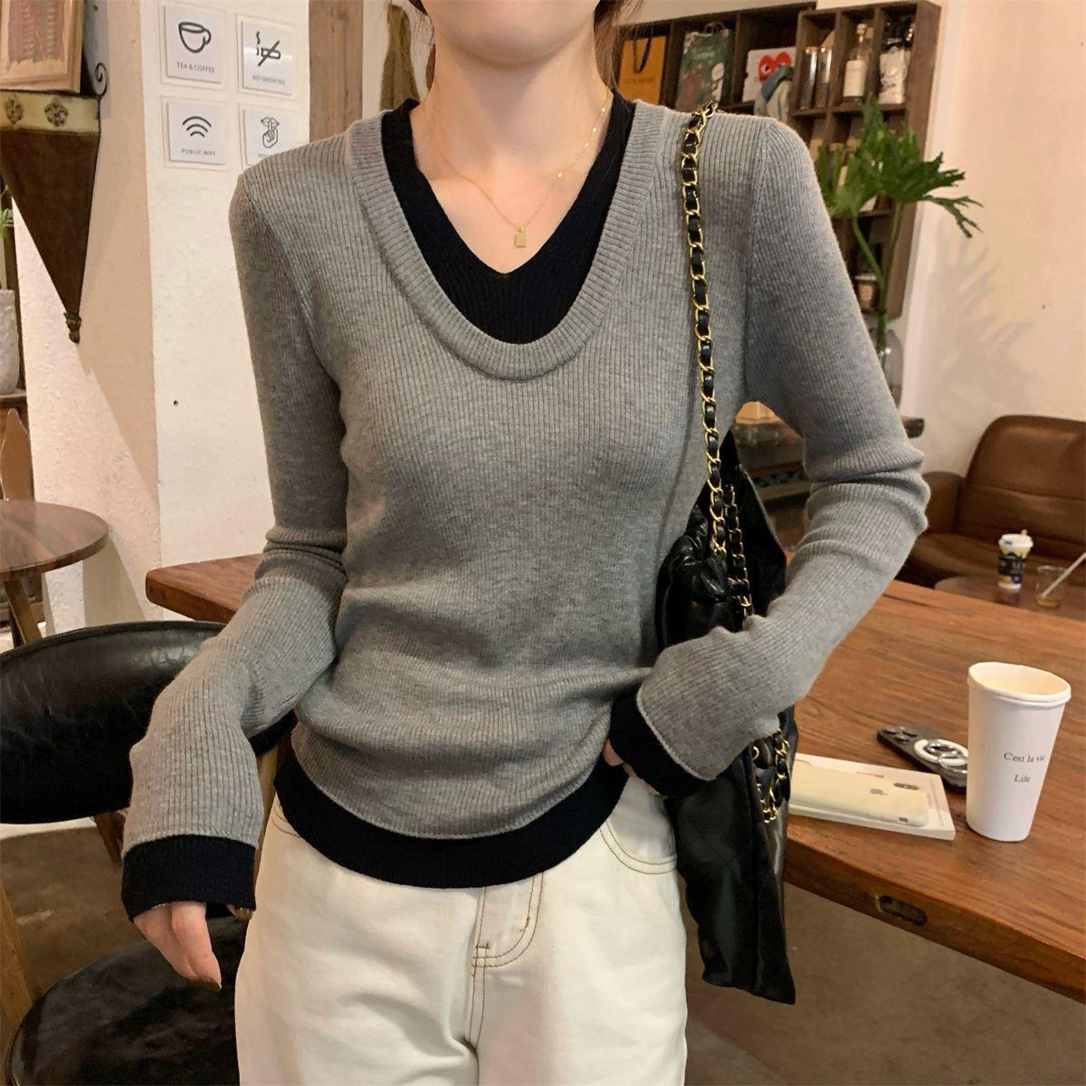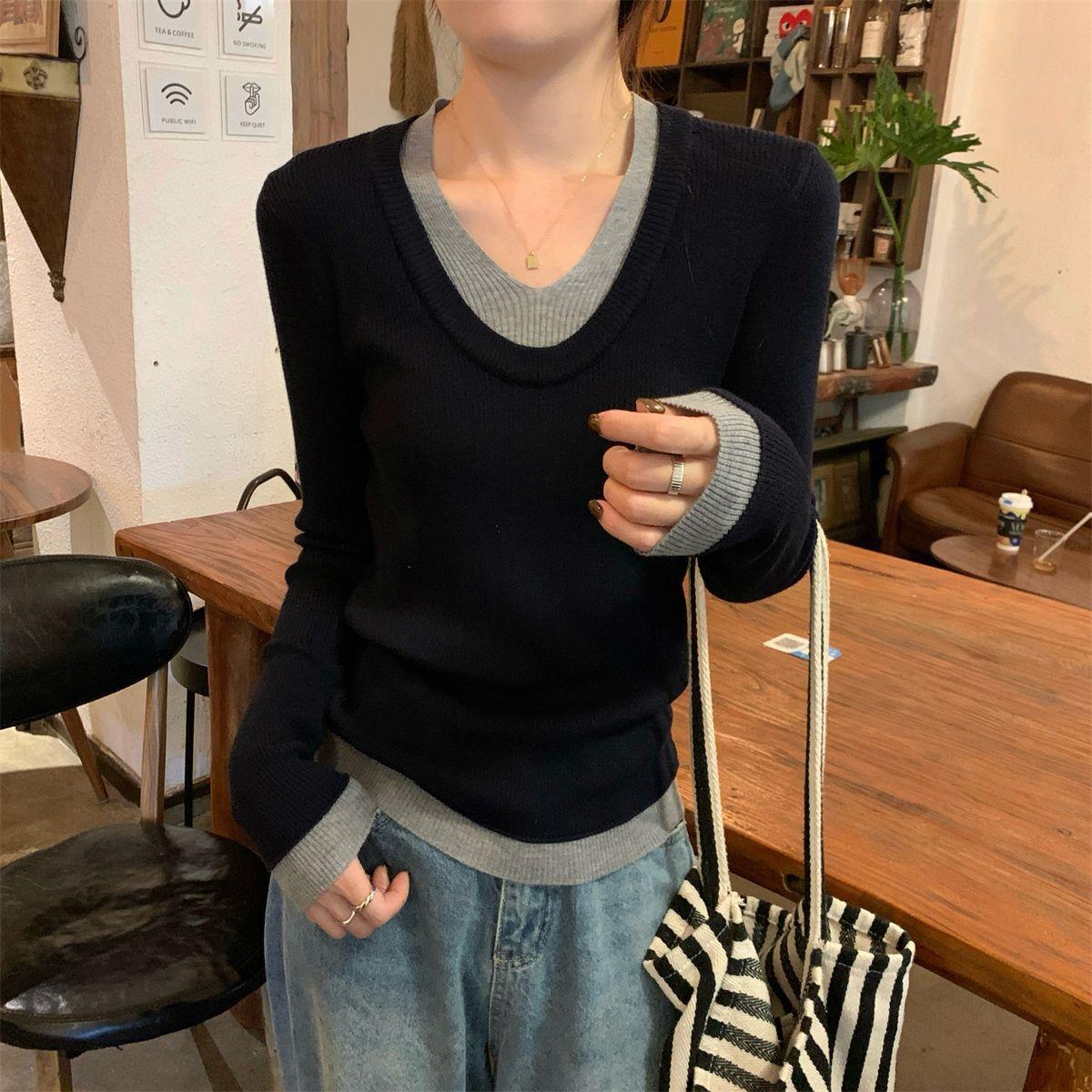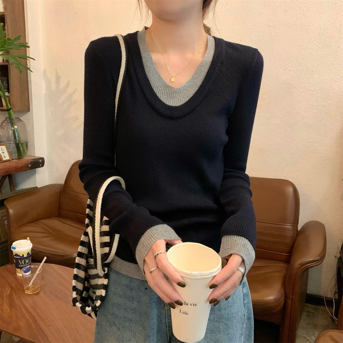 Tricô feminino versátil estilo coreano com design de duas peças falsas, novo para outono e inverno, modelagem slim, afunilando a cintura, cobrindo a barriga, top moderno