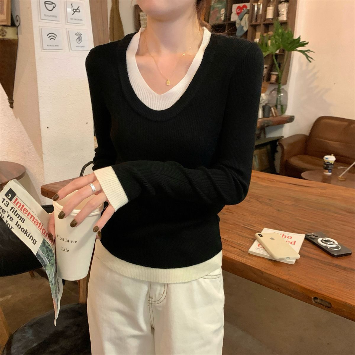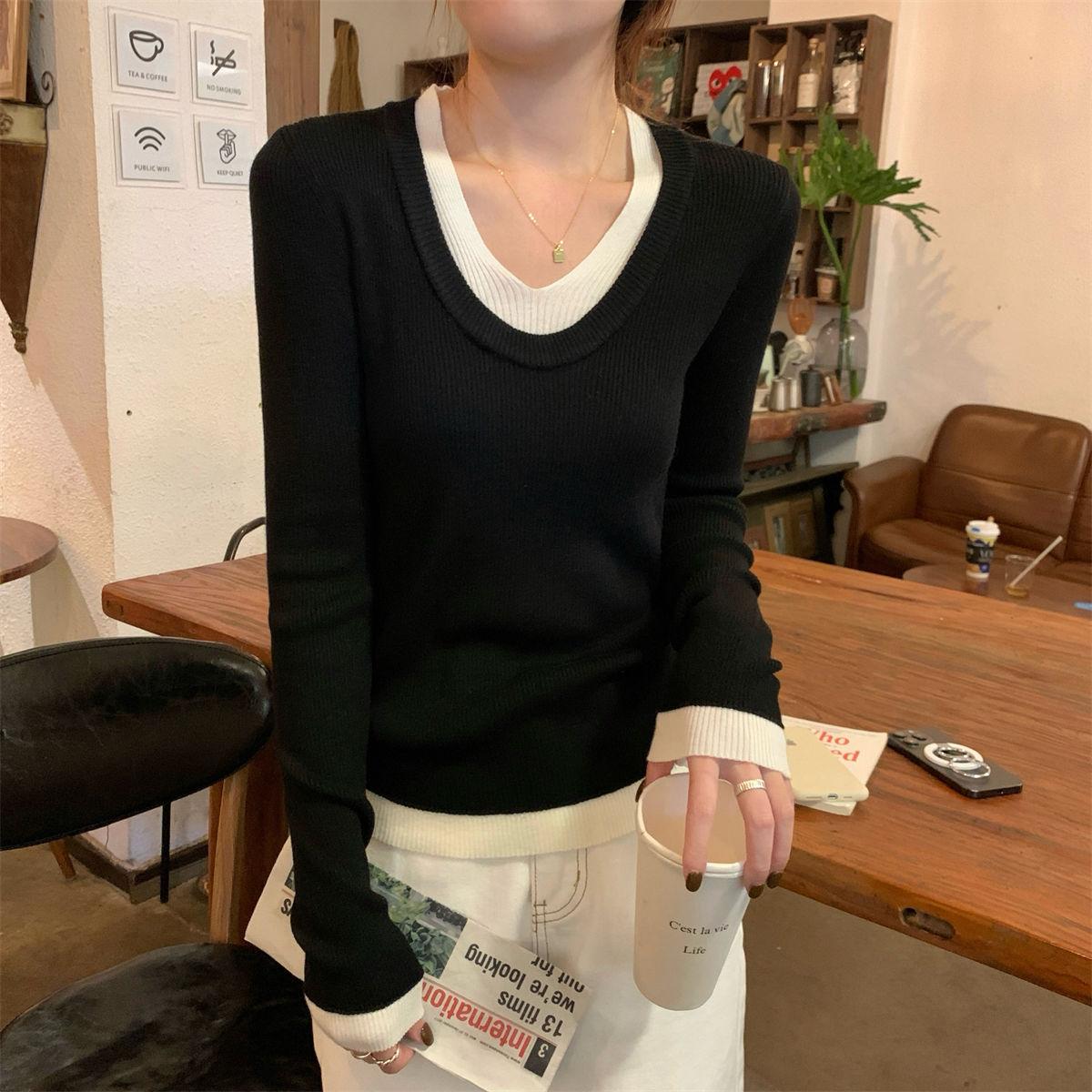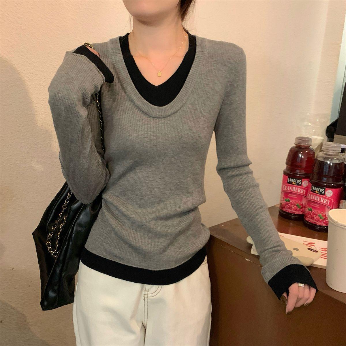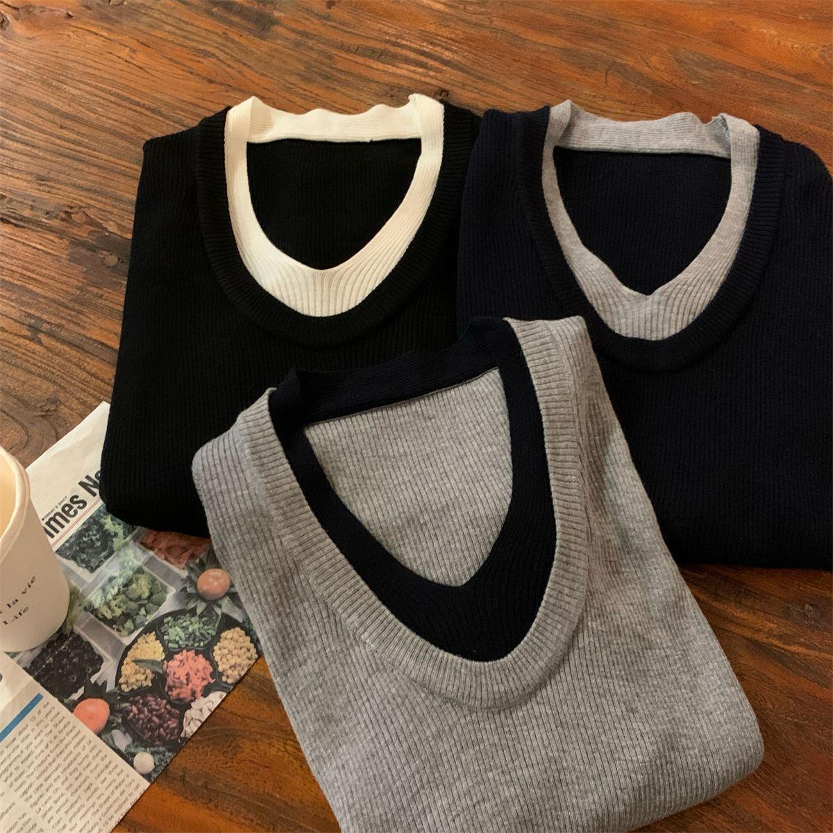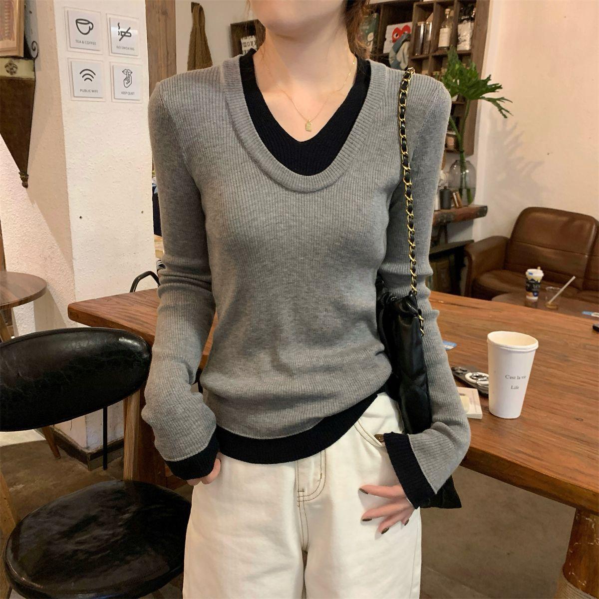 Tricô feminino versátil estilo coreano com design de duas peças falsas, novo para outono e inverno, modelagem slim, afunilando a cintura, cobrindo a barriga, top moderno