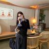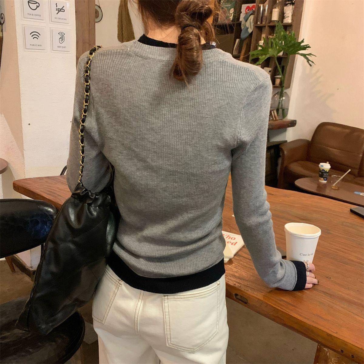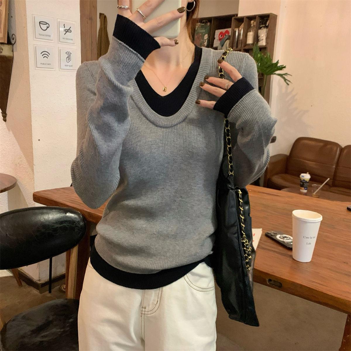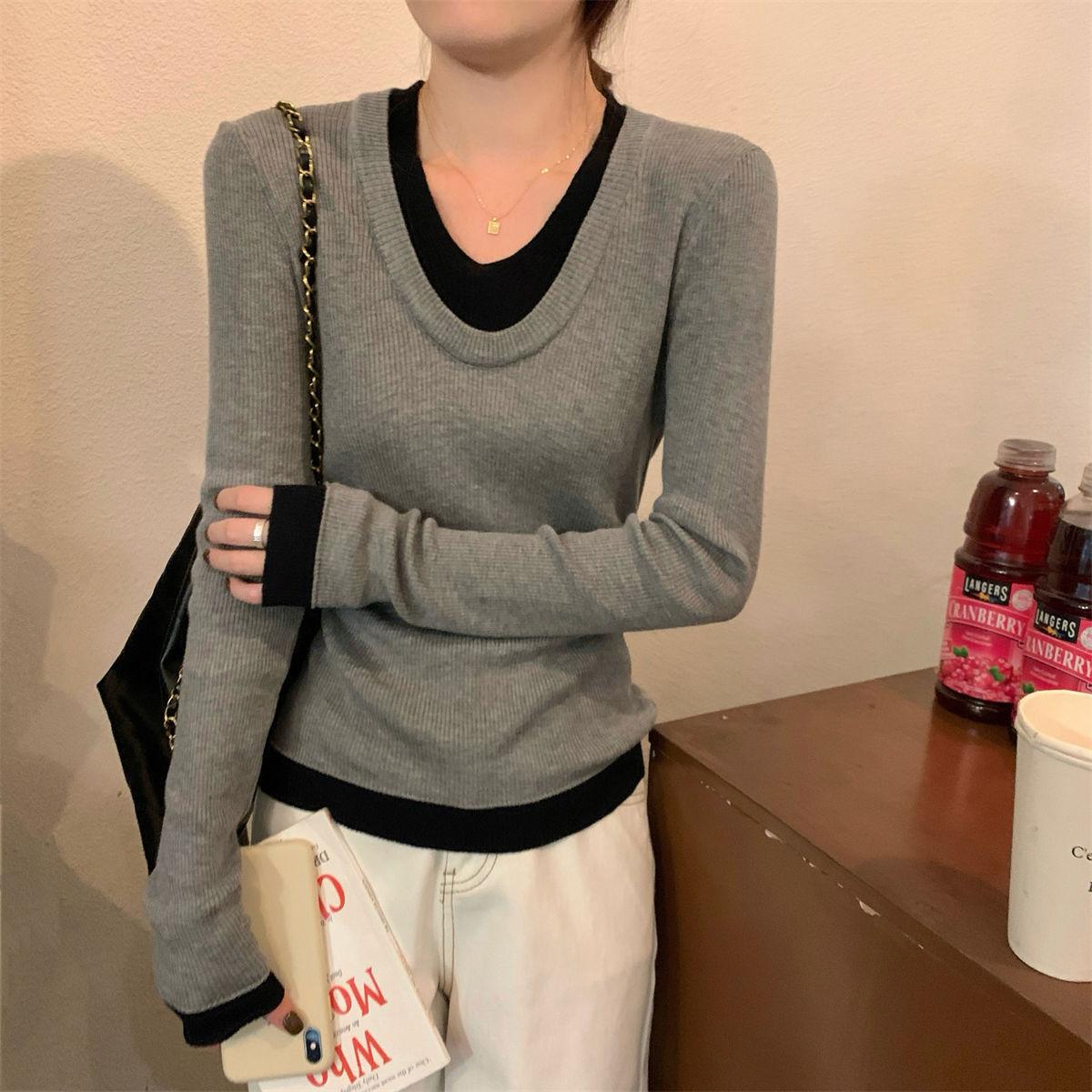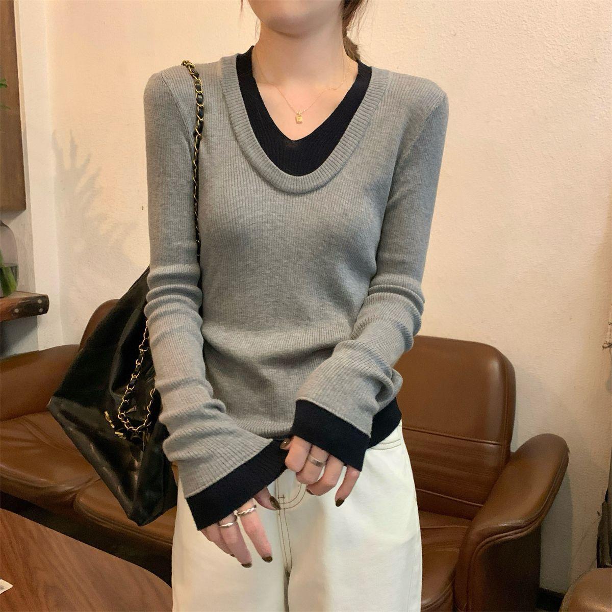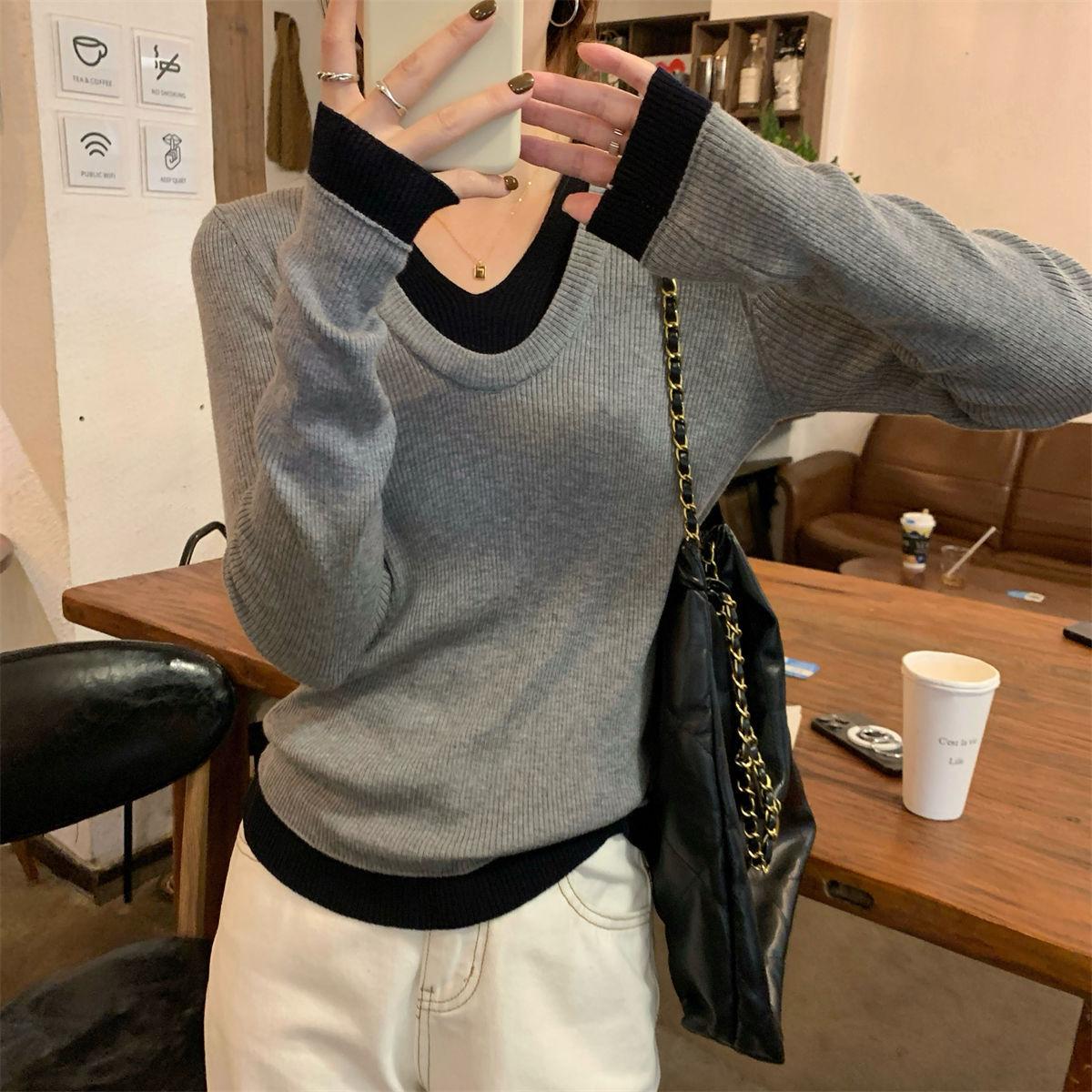 Tricô feminino versátil estilo coreano com design de duas peças falsas, novo para outono e inverno, modelagem slim, afunilando a cintura, cobrindo a barriga, top moderno