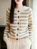 2025 Novo Cardigã de Tricô de Lã Pura Outono e Inverno Feminino Gola Redonda Listrado em Blocos de Cor Solto Manga Longa Abotoado Jaqueta Grossa