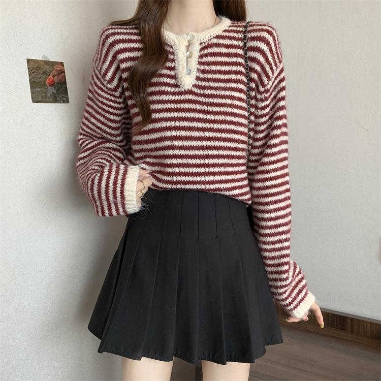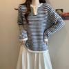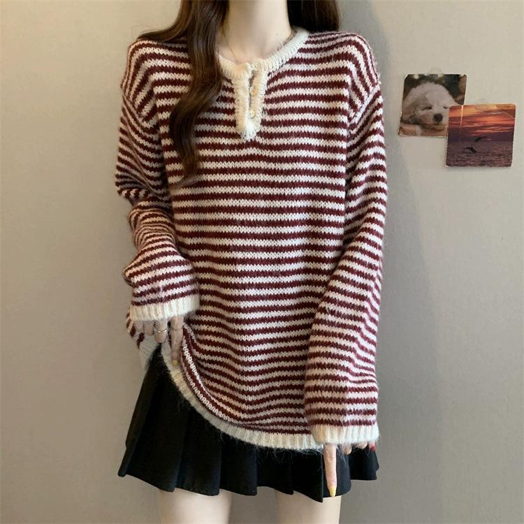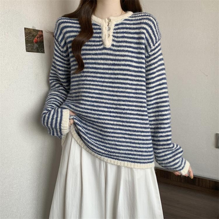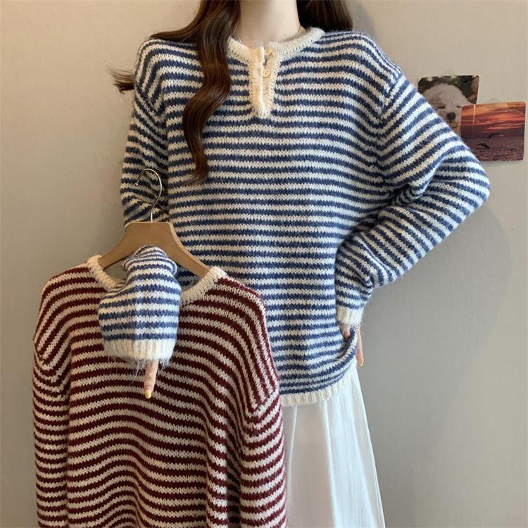 Suéter de malha retrô listrado de alta qualidade estilo coreano feminino 2025 outono/inverno novo pulôver versátil moderno de manga longa