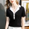Polo patchwork branco e cinza 2025 manga curta feminino verão gola americana camiseta feminina design emoção casal manga média