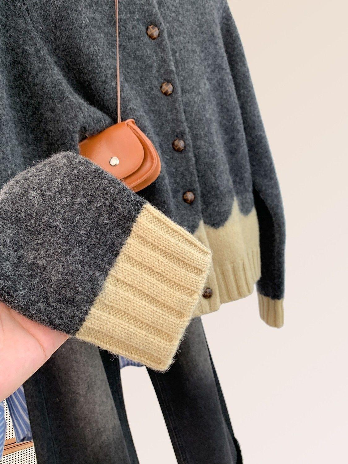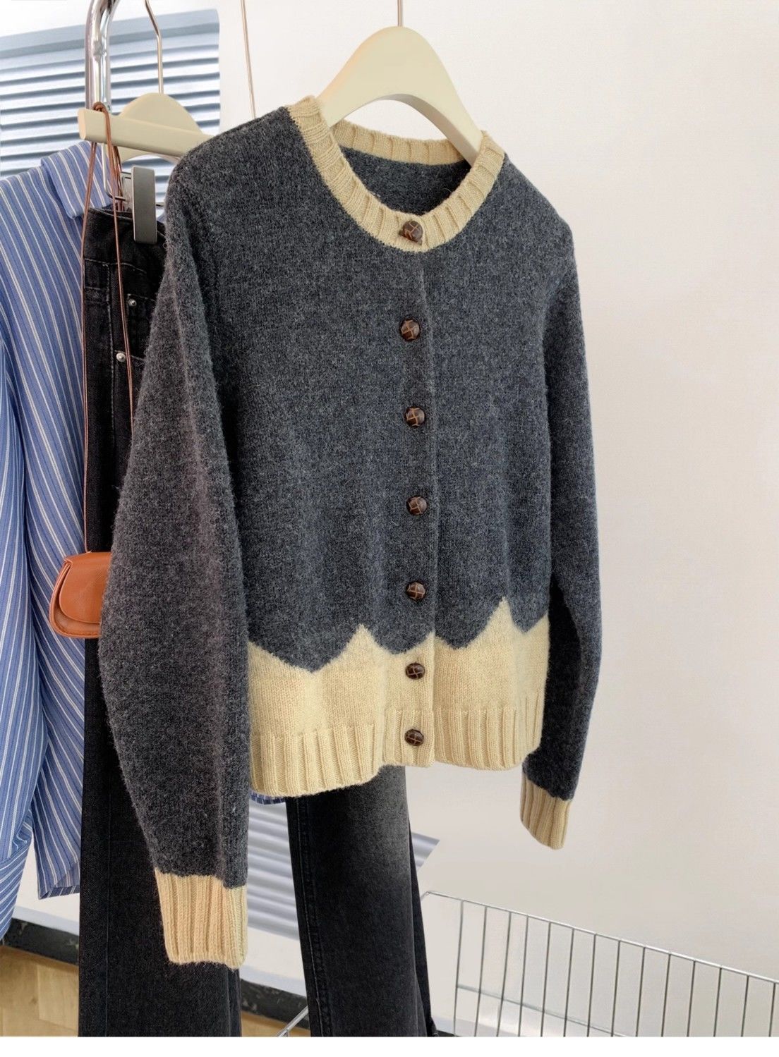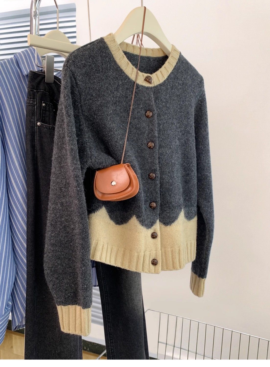 Outono Novo Cardigã Em Tricô Feminino Fashionable Com Gola Redonda Emagrecedor Ombro Reto Cardigã Patchwork Bloco de Cores High-End 2025
