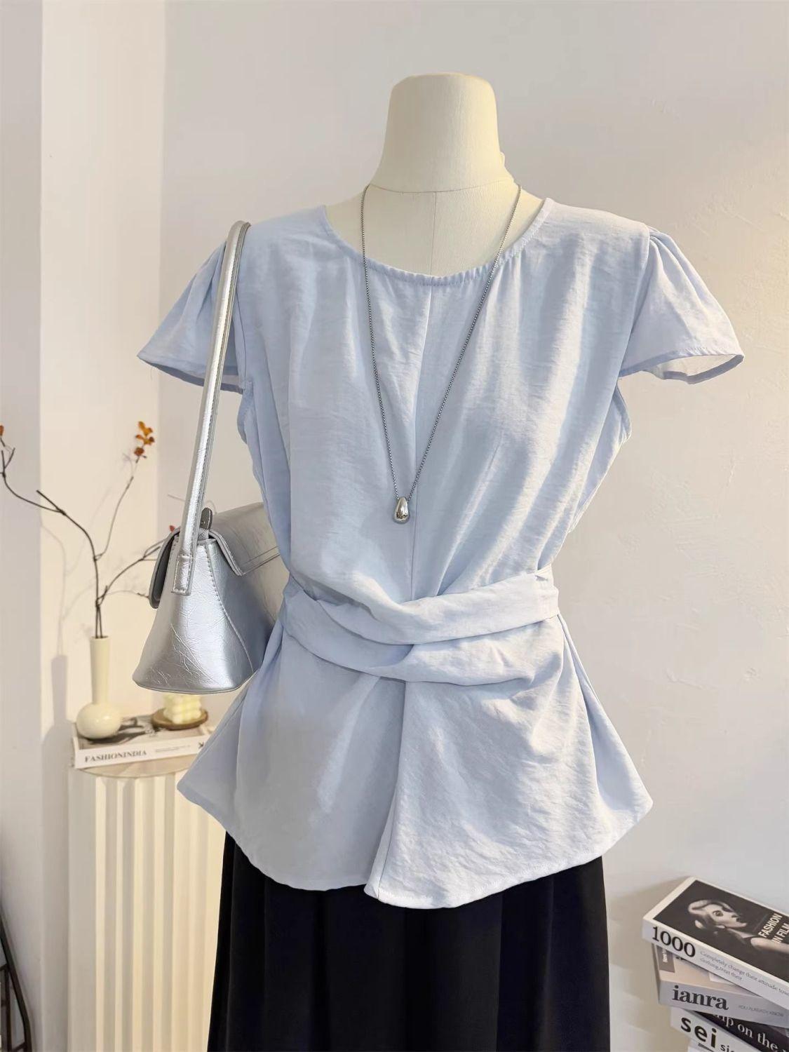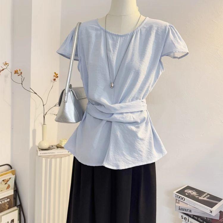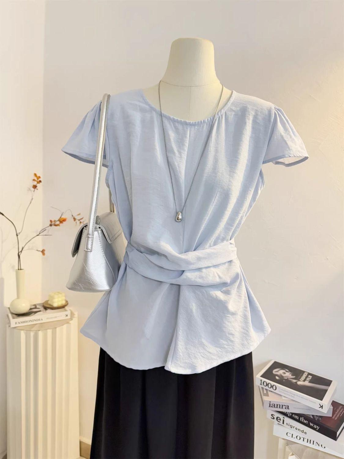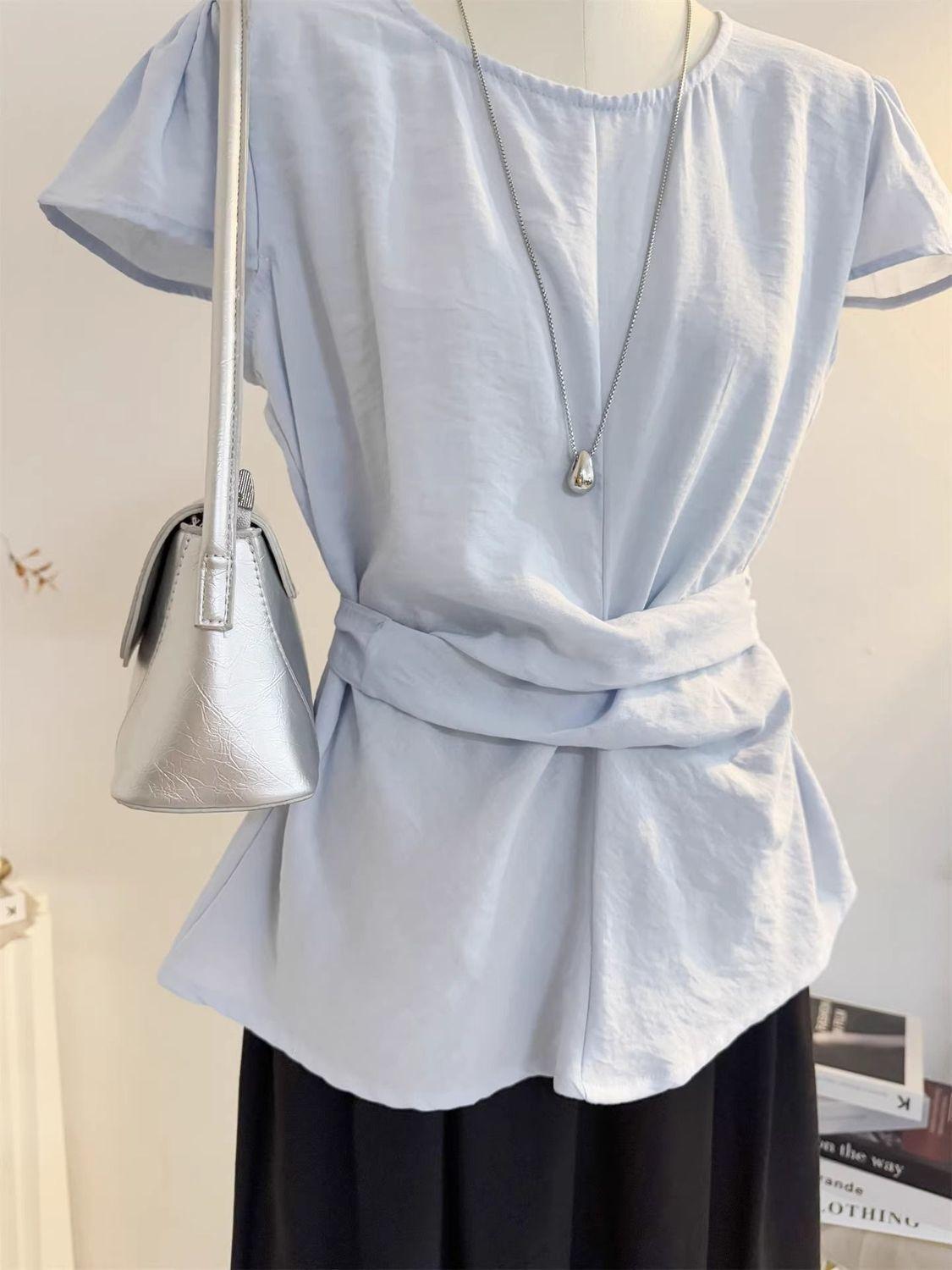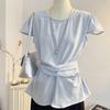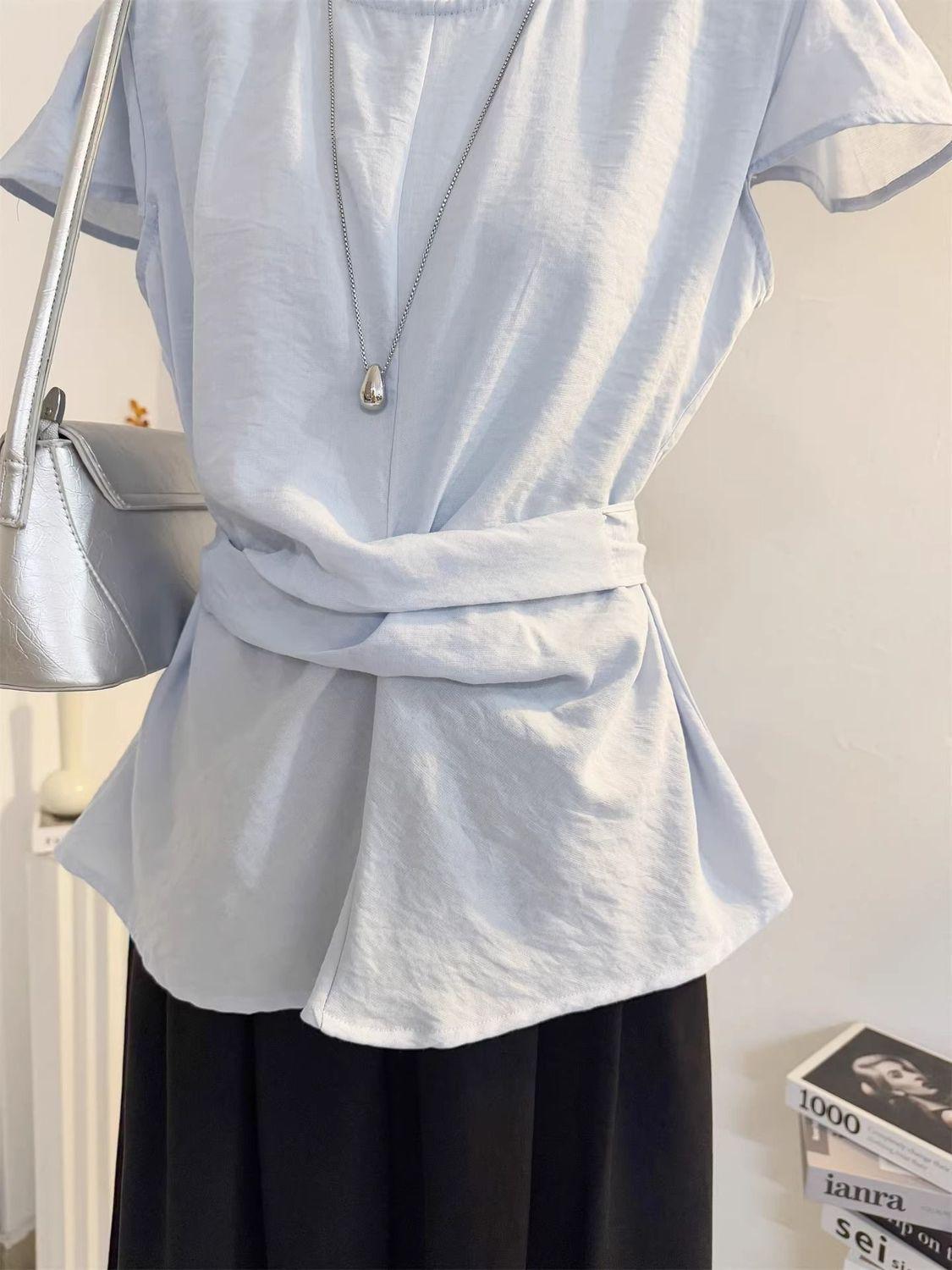 Design Sense Camisa Azul de Manga Curta com Amarração Cruzada na Cintura Feminina Verão 2025 Temperamento Gola Redonda Blusa Francesa Top