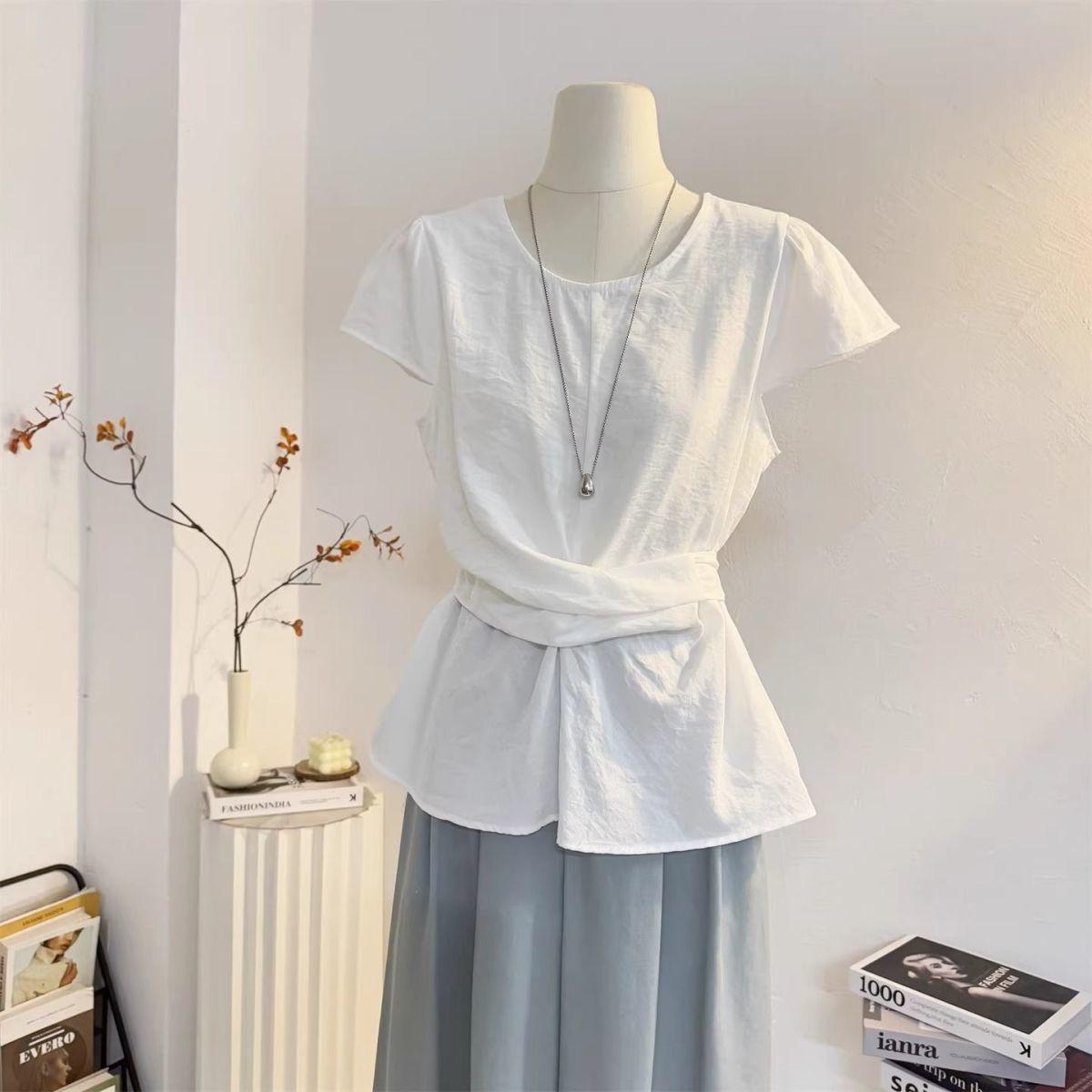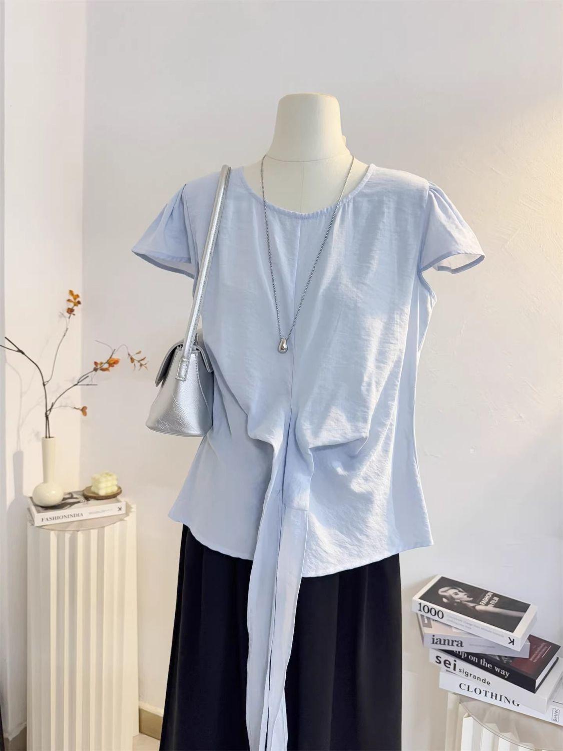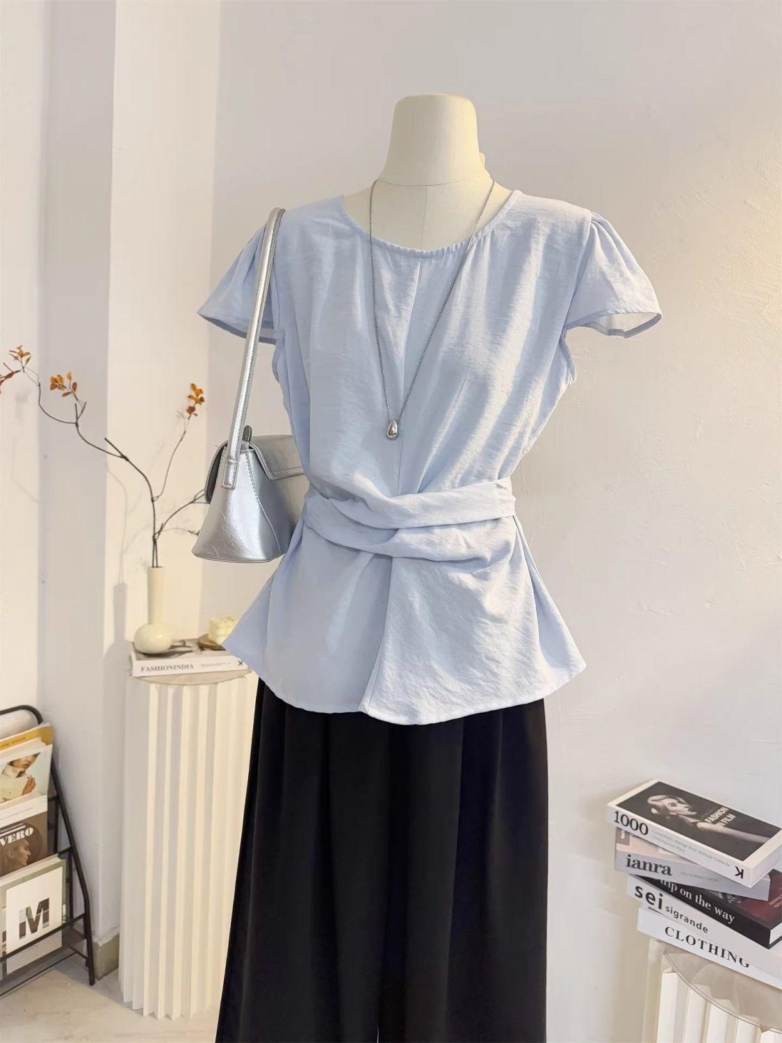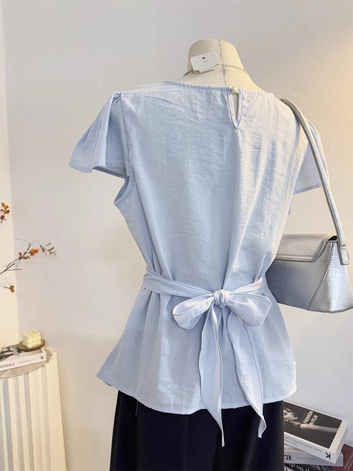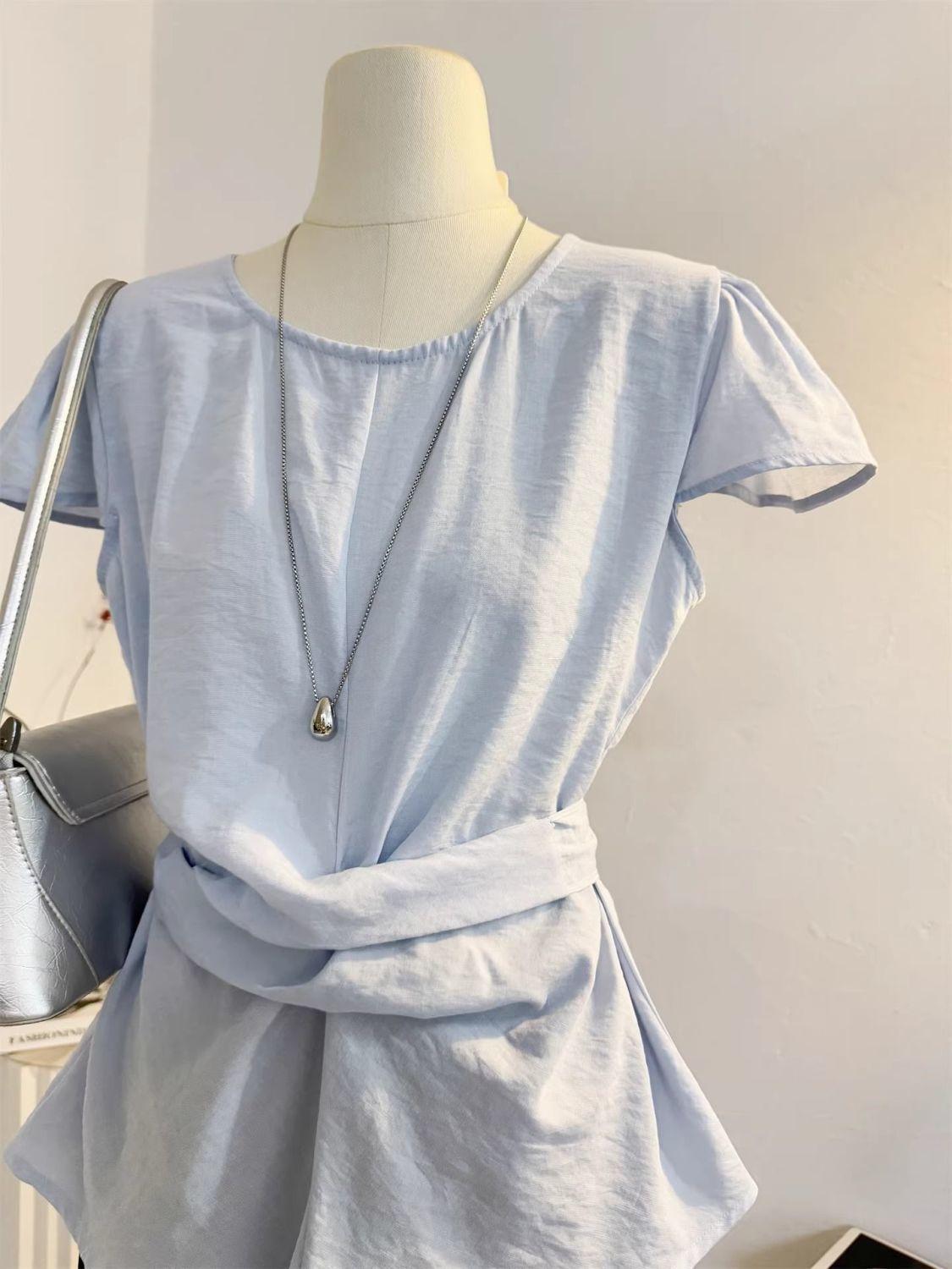 Design Sense Camisa Azul de Manga Curta com Amarração Cruzada na Cintura Feminina Verão 2025 Temperamento Gola Redonda Blusa Francesa Top