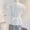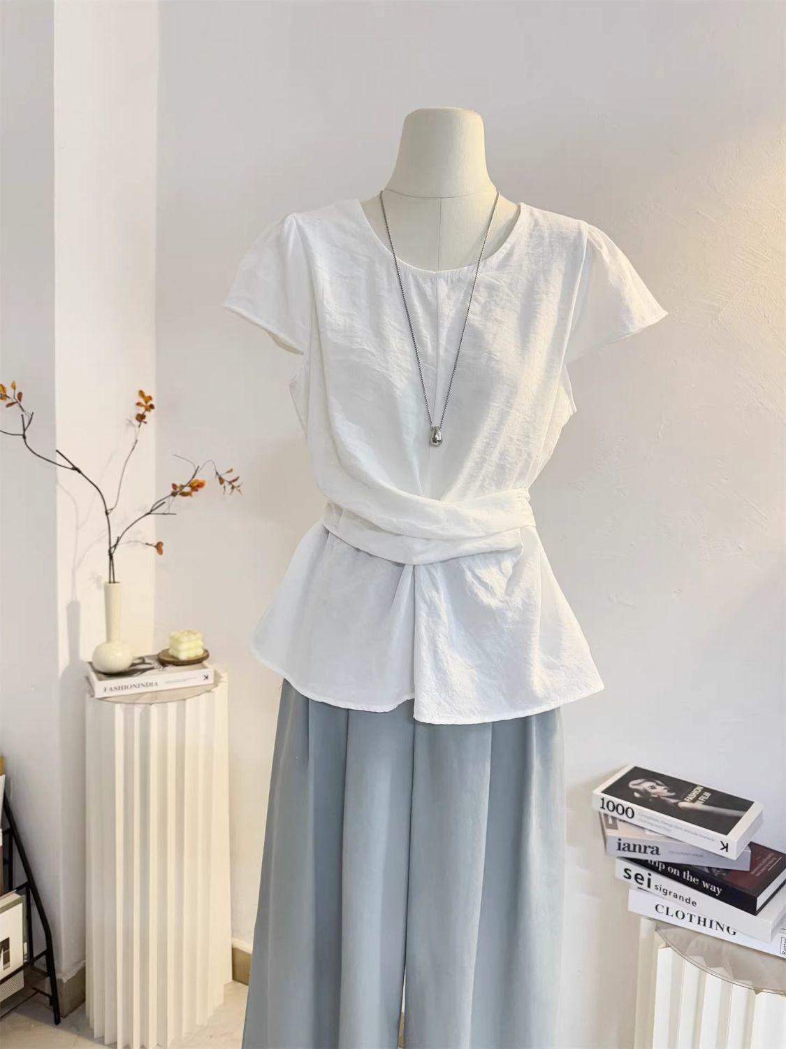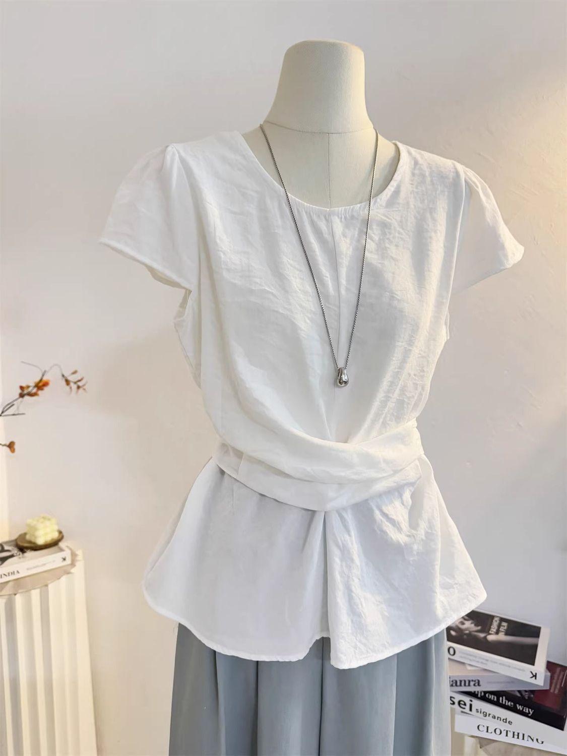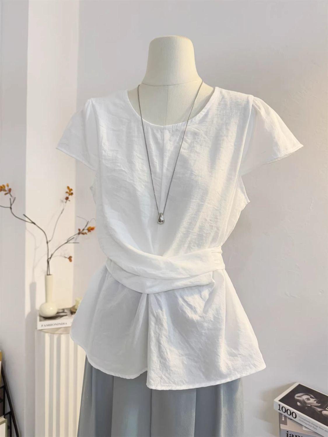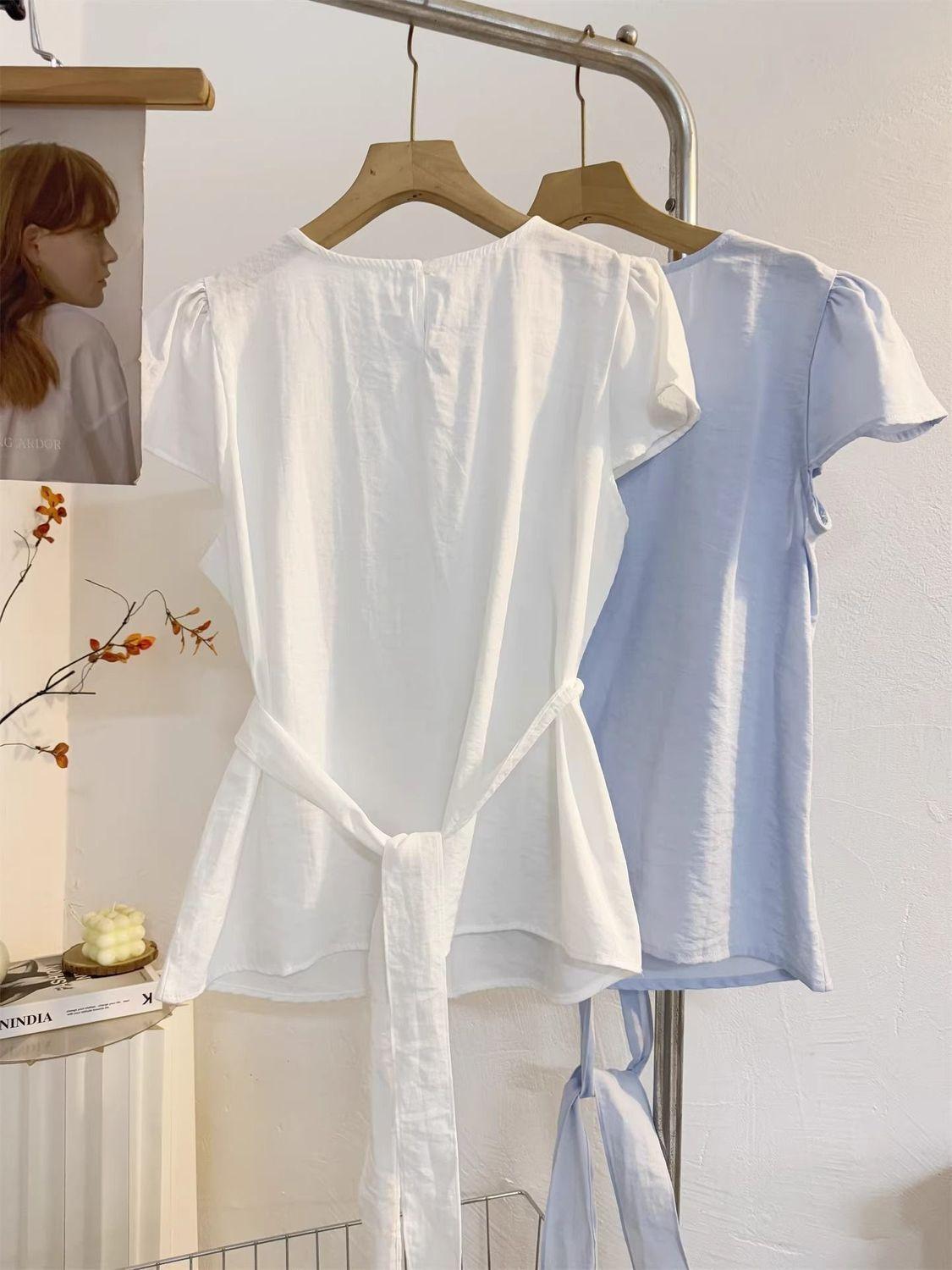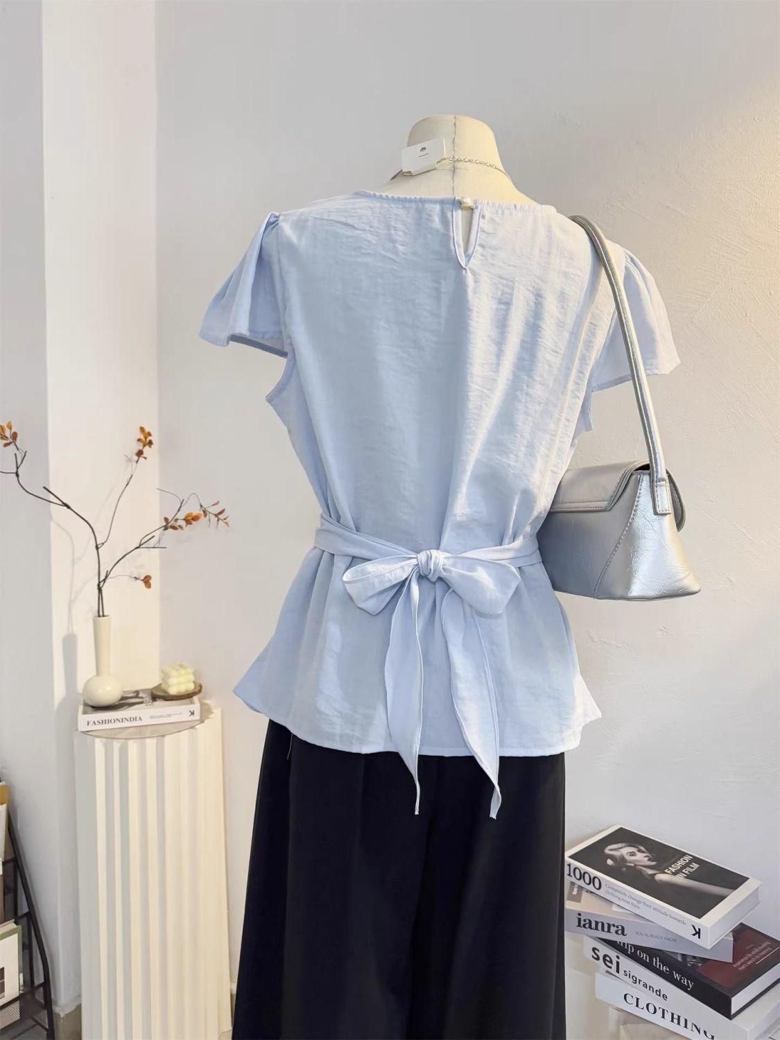 Design Sense Camisa Azul de Manga Curta com Amarração Cruzada na Cintura Feminina Verão 2025 Temperamento Gola Redonda Blusa Francesa Top