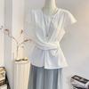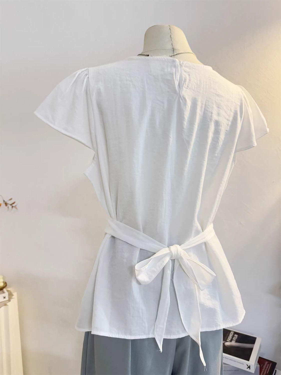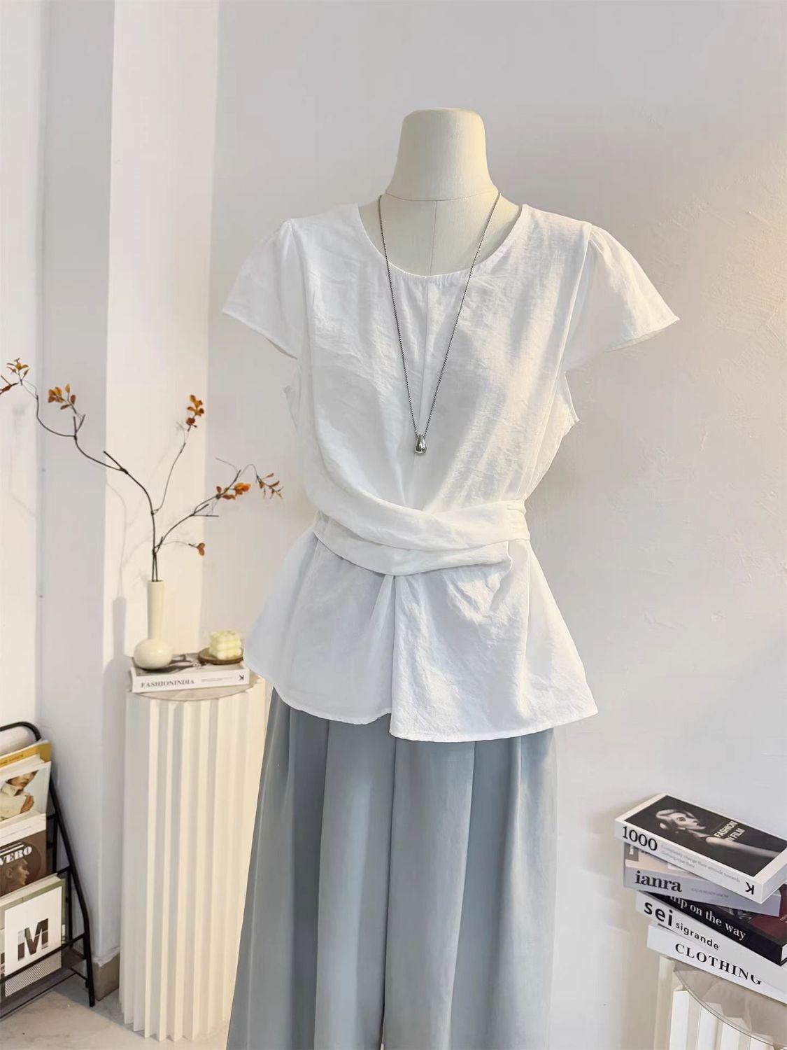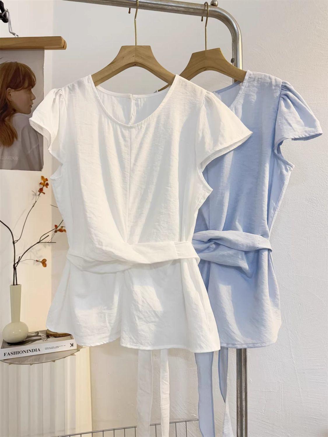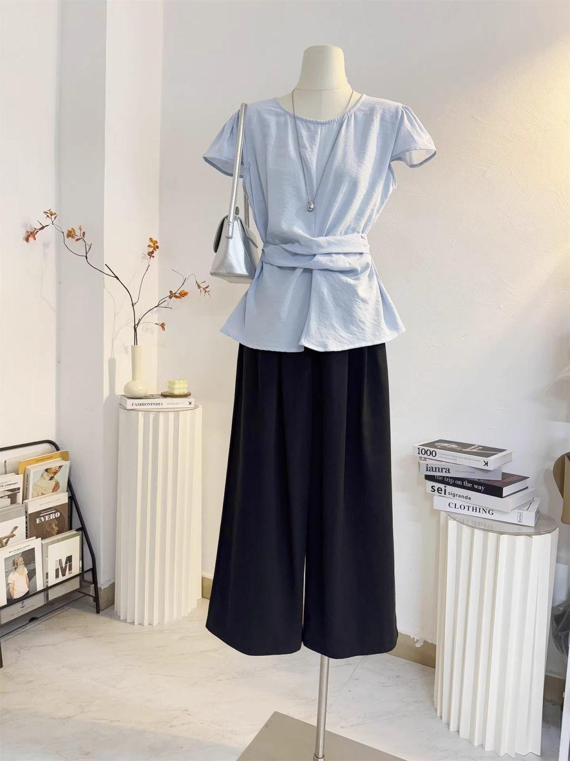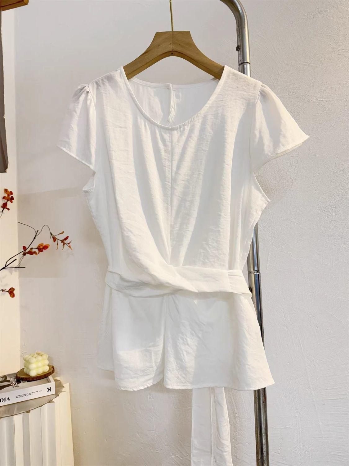 Design Sense Camisa Azul de Manga Curta com Amarração Cruzada na Cintura Feminina Verão 2025 Temperamento Gola Redonda Blusa Francesa Top
