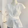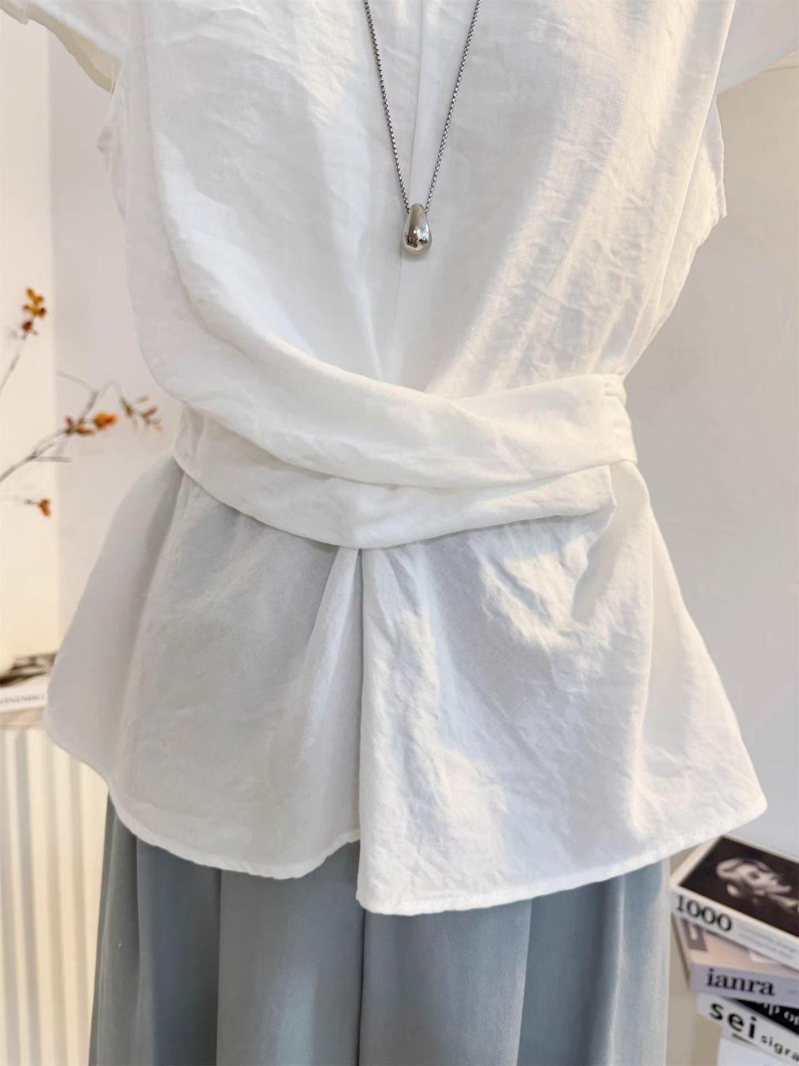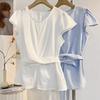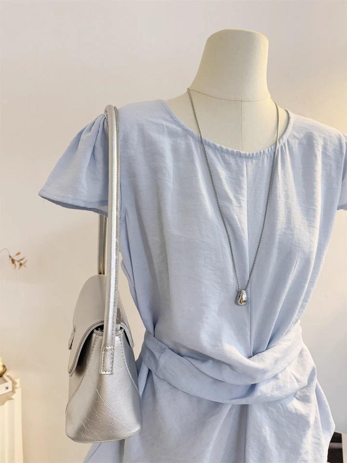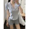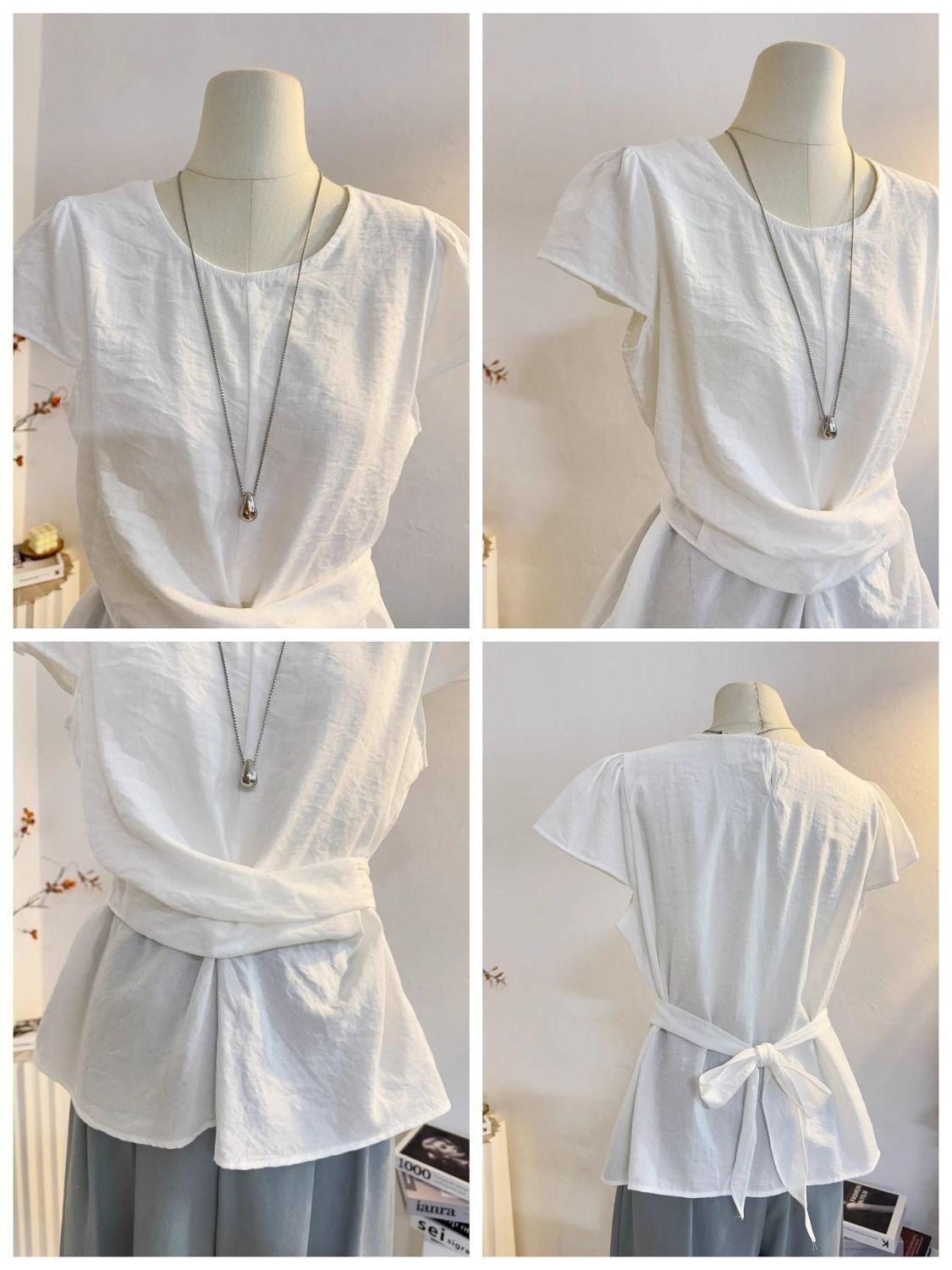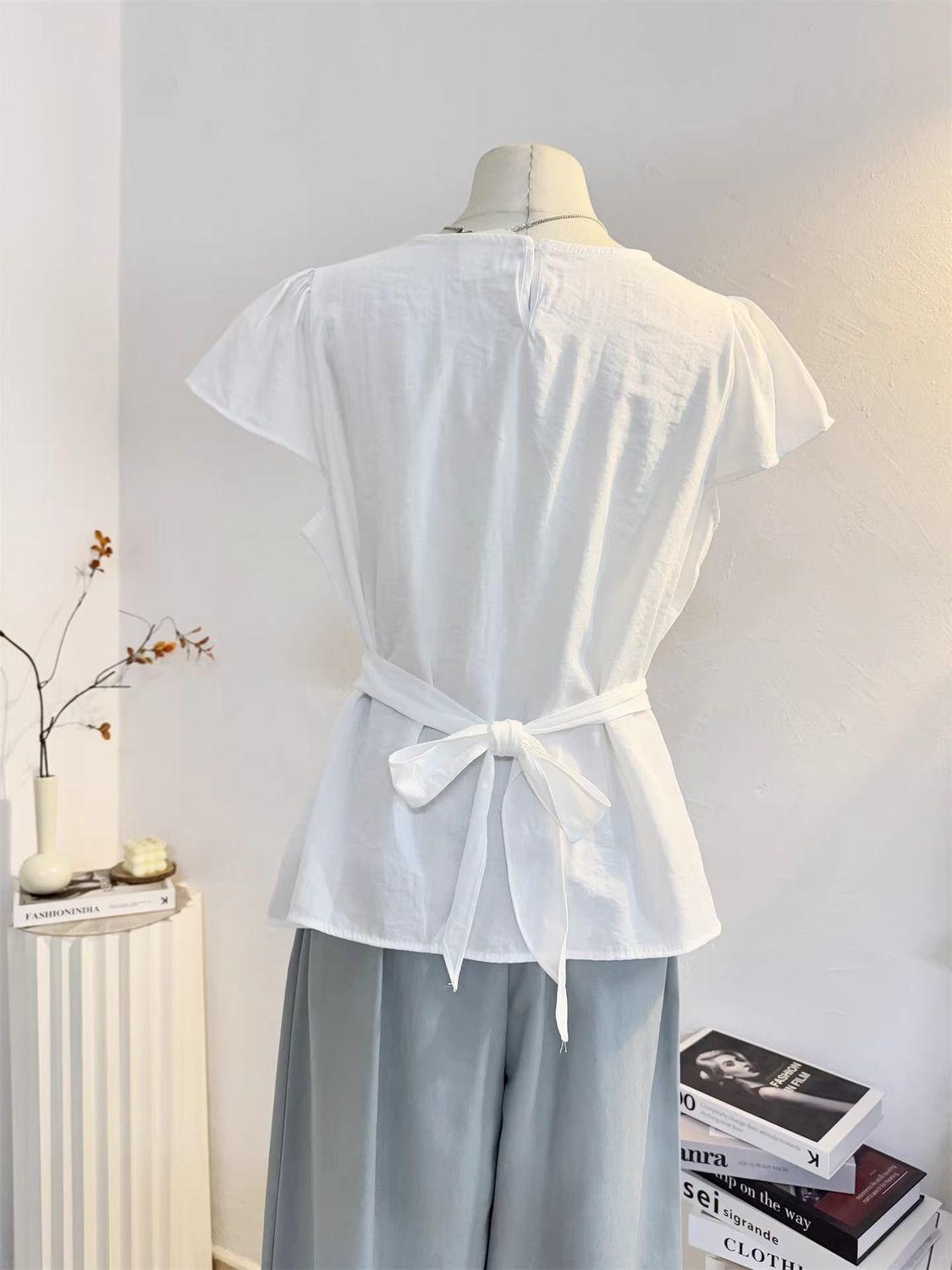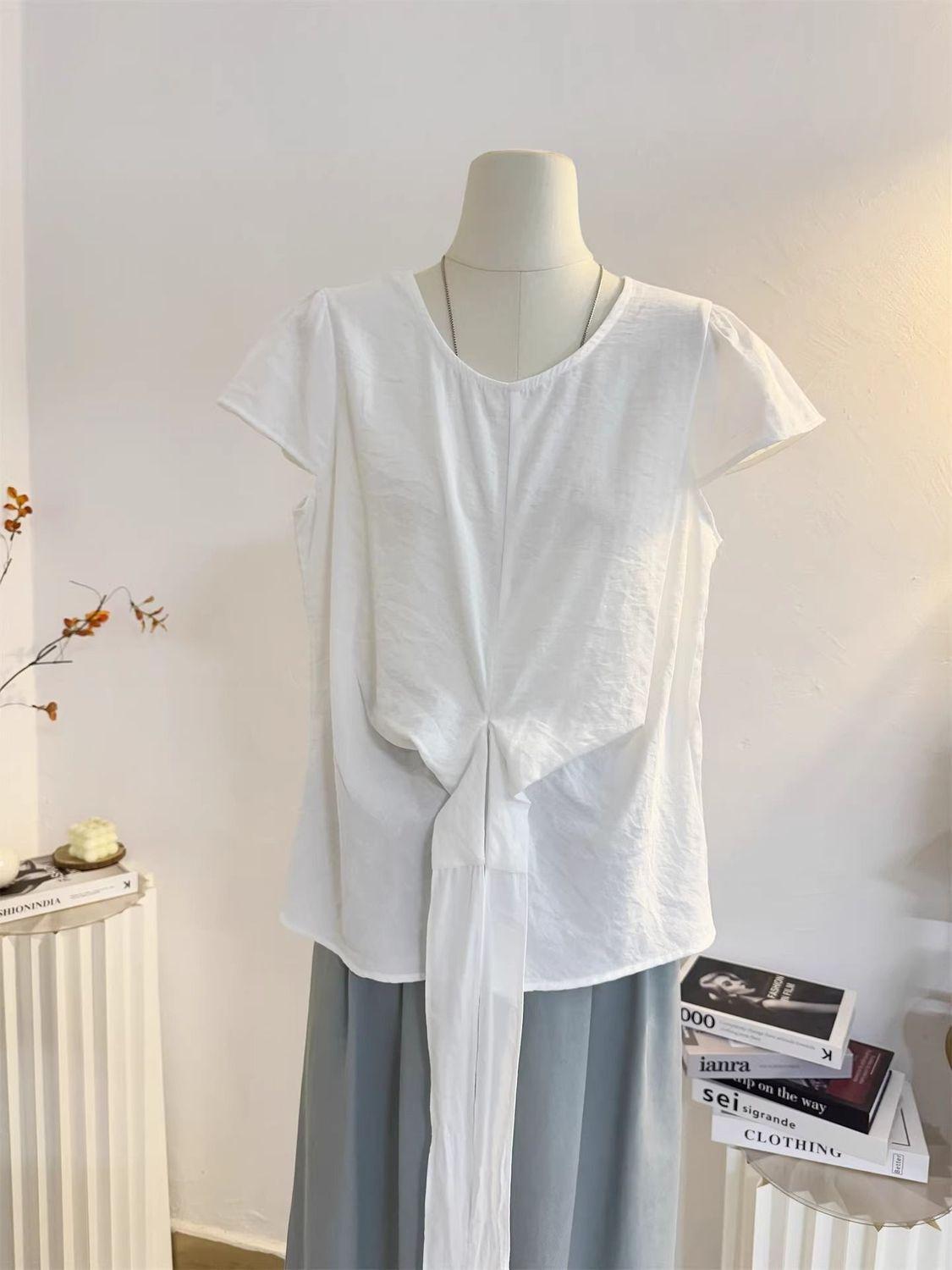 Design Sense Camisa Azul de Manga Curta com Amarração Cruzada na Cintura Feminina Verão 2025 Temperamento Gola Redonda Blusa Francesa Top