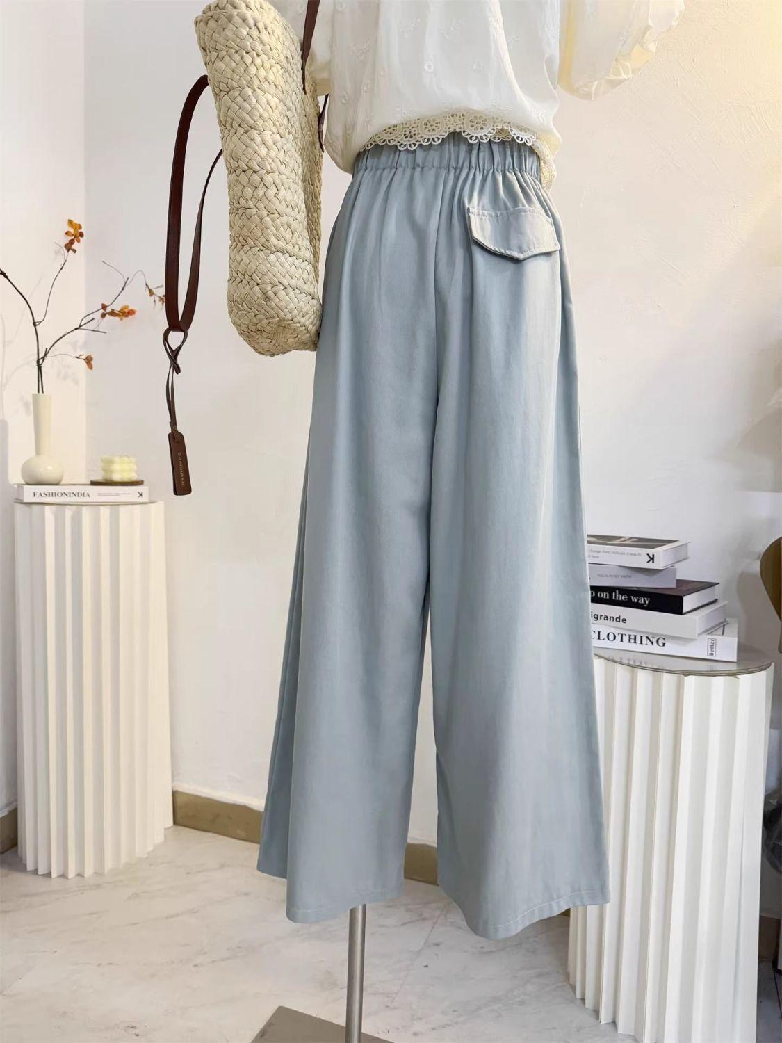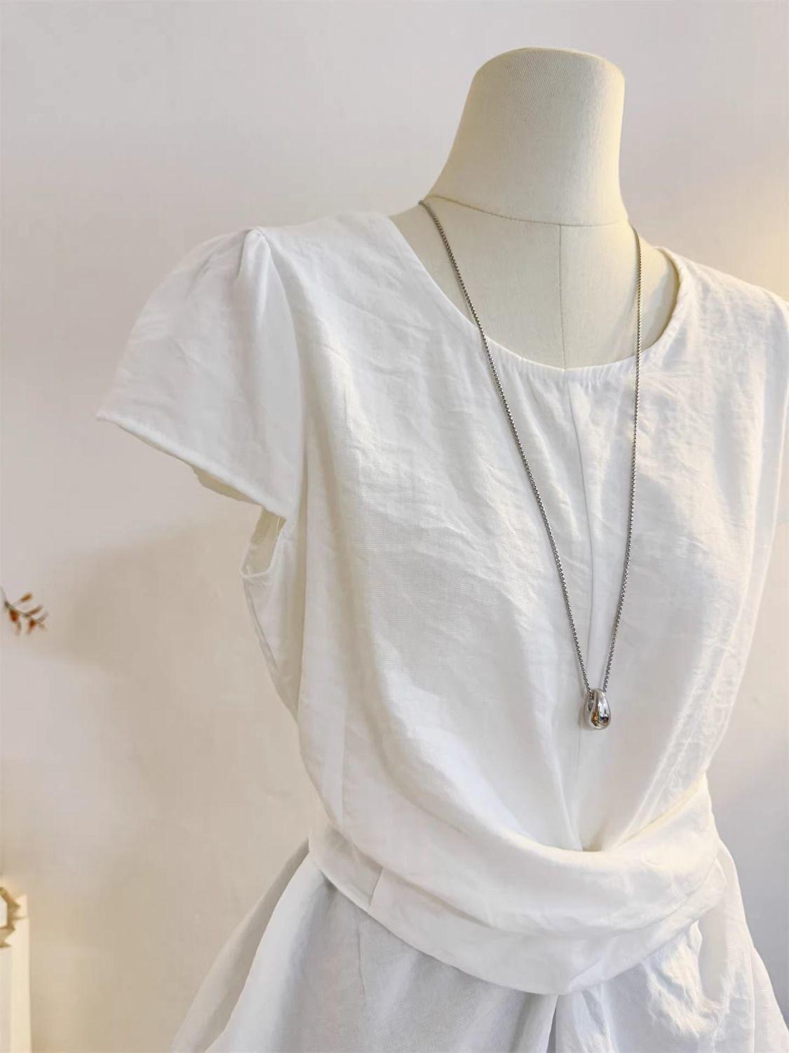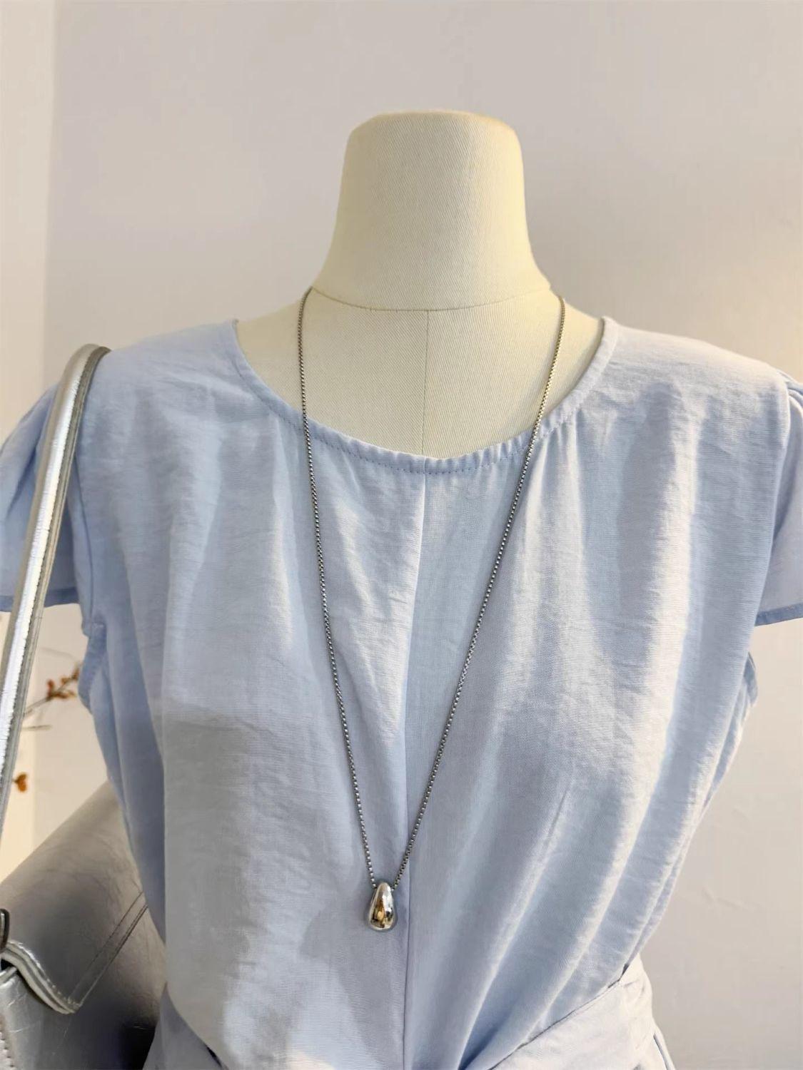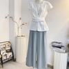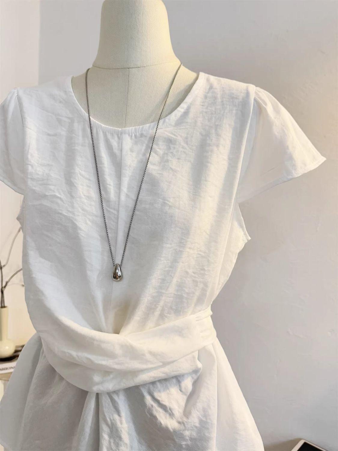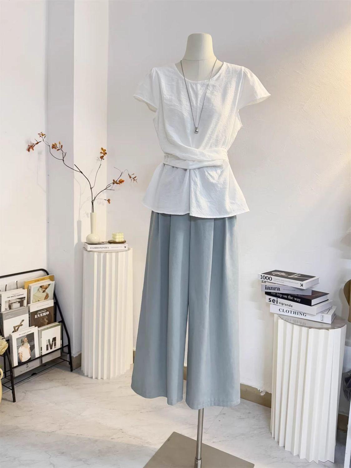 Design Sense Camisa Azul de Manga Curta com Amarração Cruzada na Cintura Feminina Verão 2025 Temperamento Gola Redonda Blusa Francesa Top