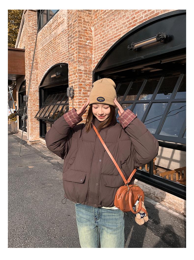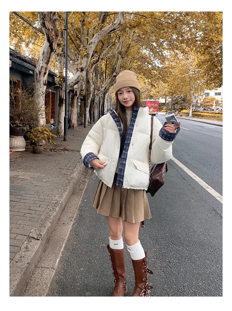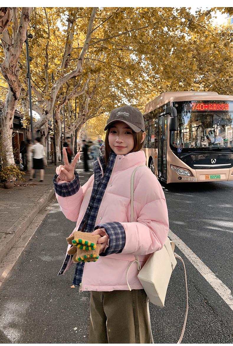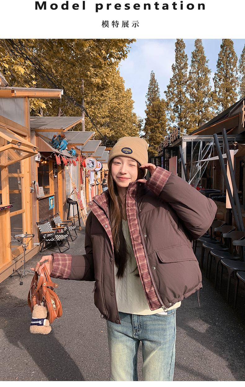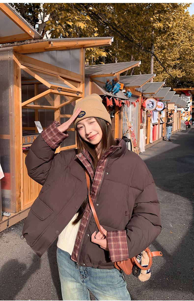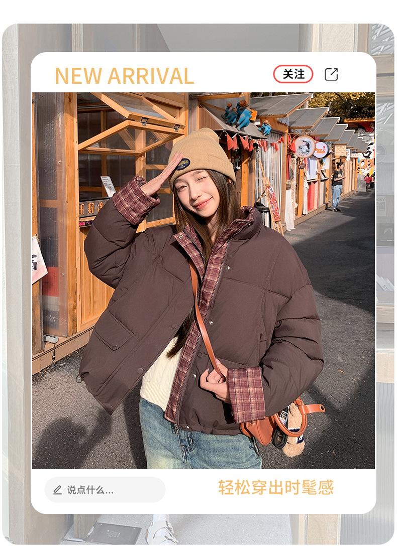 Jaqueta Xadrez de Algodão com Penas Feminina Curta 2025 Nova Outono/Inverno Tamanho Pequeno Casaco de Algodão Outerwear Top Roupas Femininas Casaco Pão
