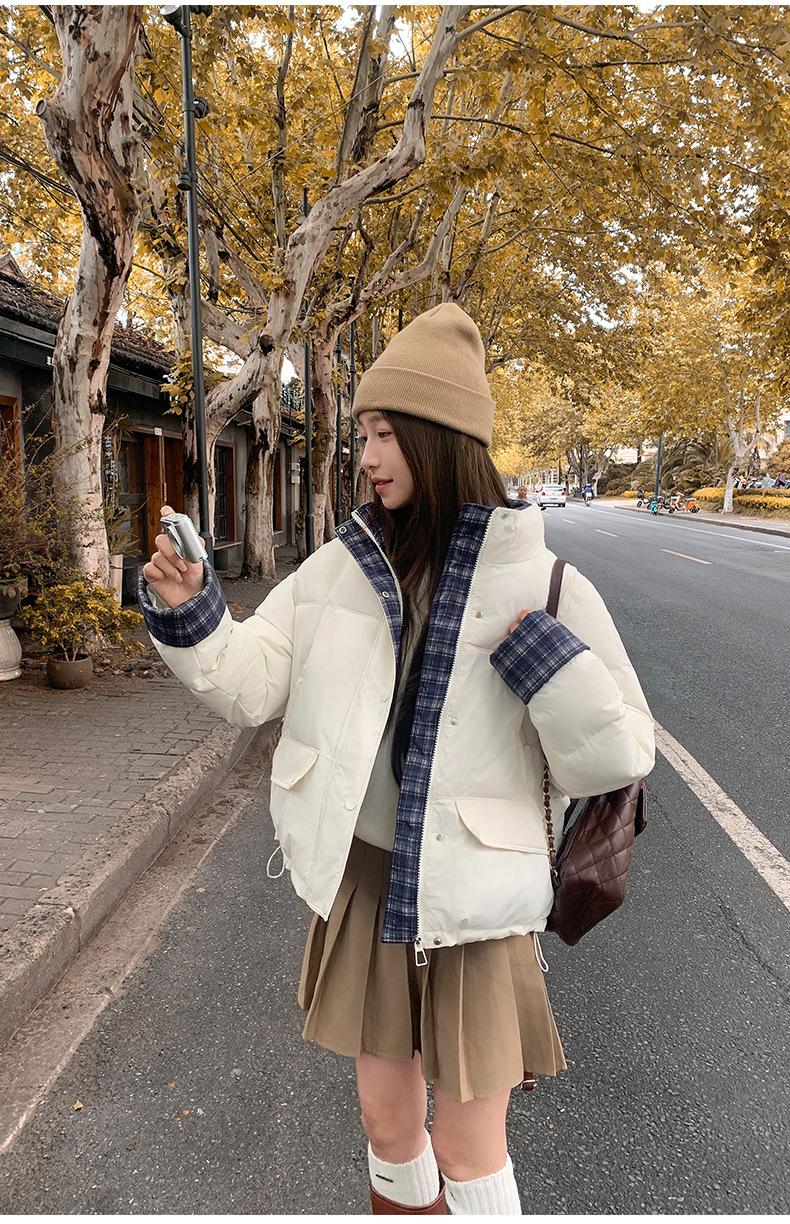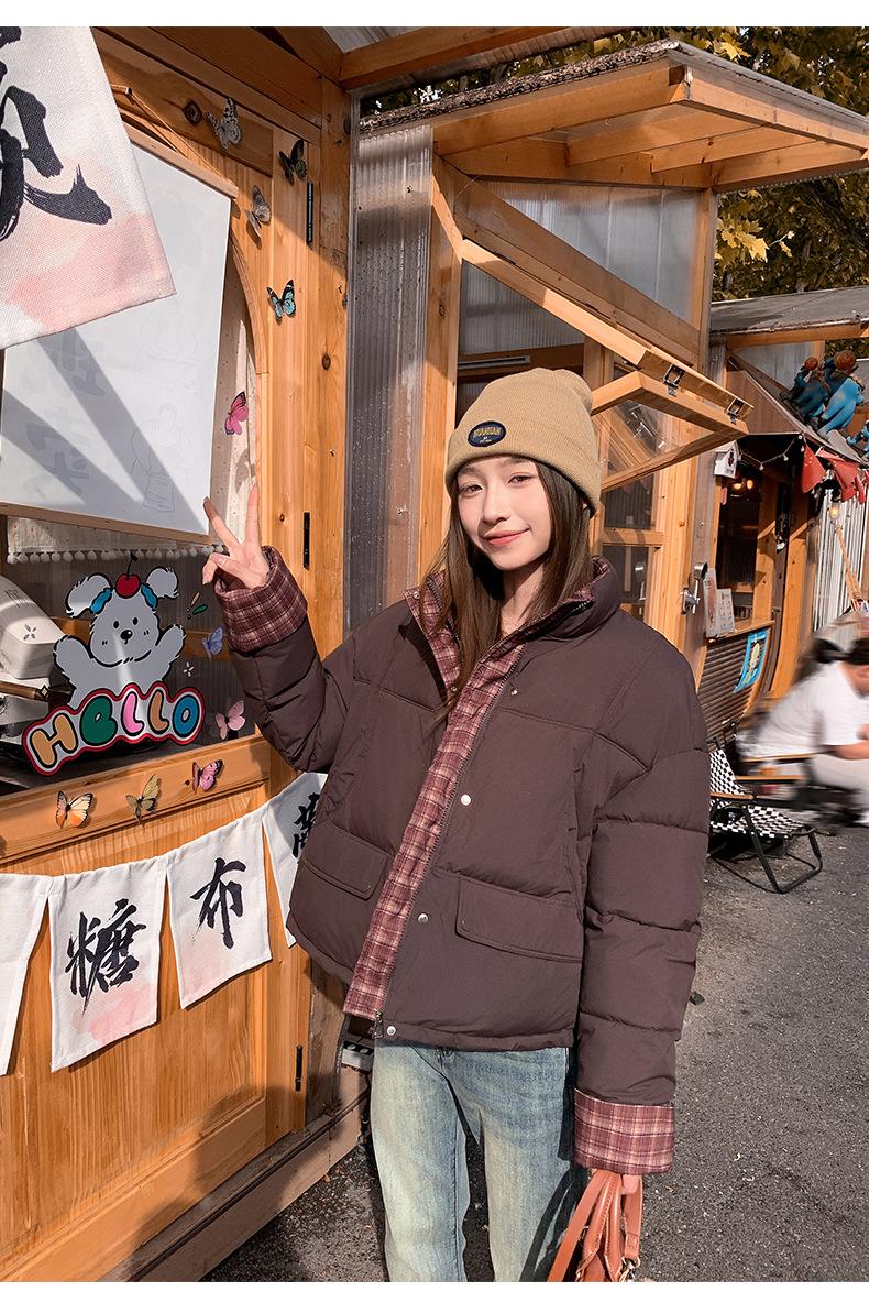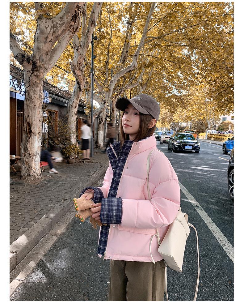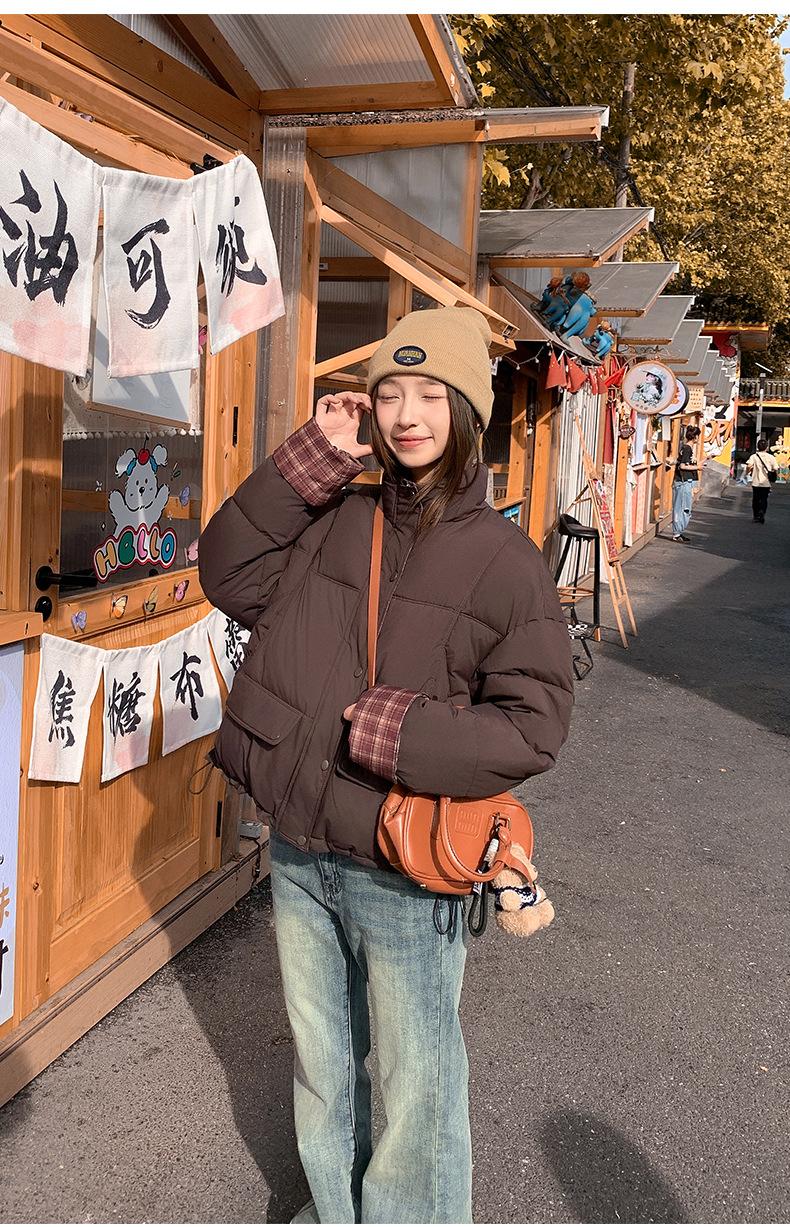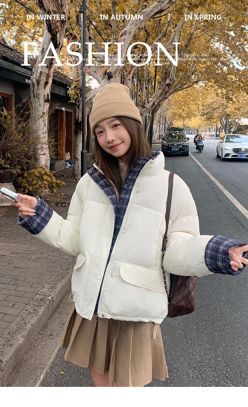 Jaqueta Xadrez de Algodão com Penas Feminina Curta 2025 Nova Outono/Inverno Tamanho Pequeno Casaco de Algodão Outerwear Top Roupas Femininas Casaco Pão