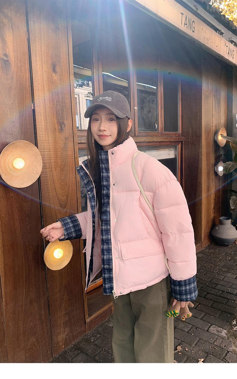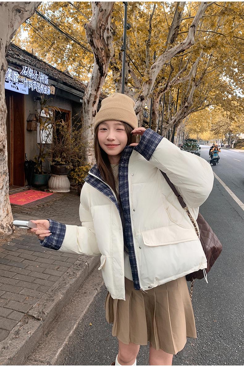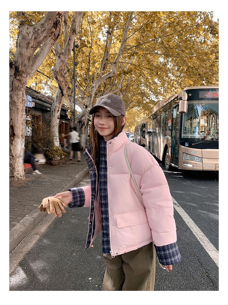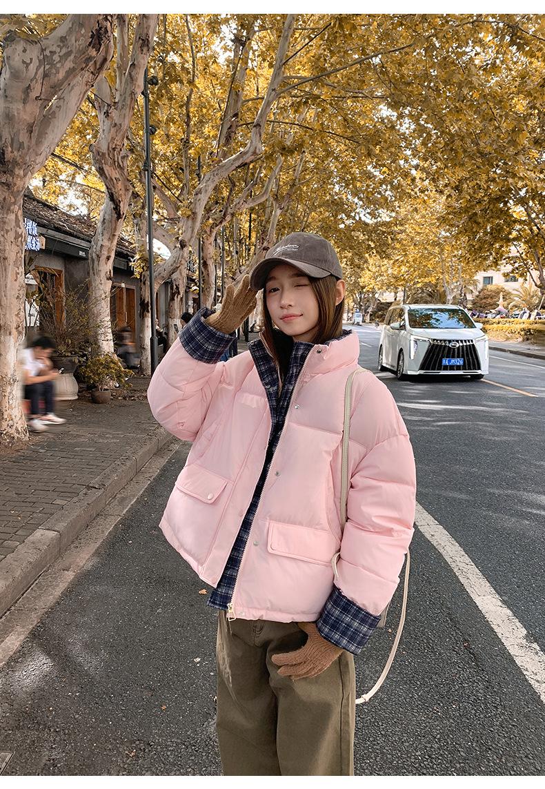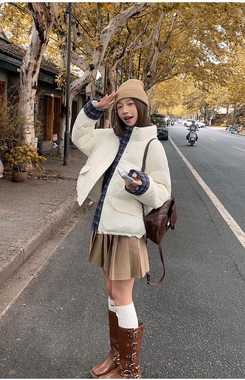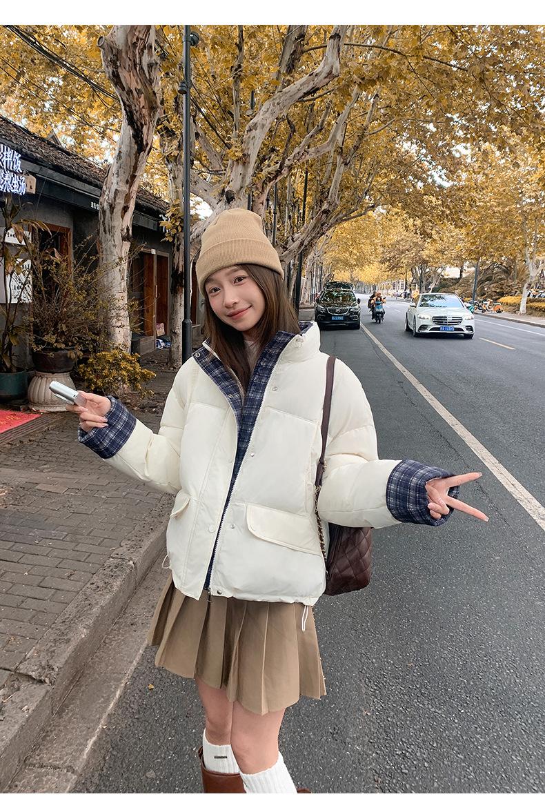 Jaqueta Xadrez de Algodão com Penas Feminina Curta 2025 Nova Outono/Inverno Tamanho Pequeno Casaco de Algodão Outerwear Top Roupas Femininas Casaco Pão