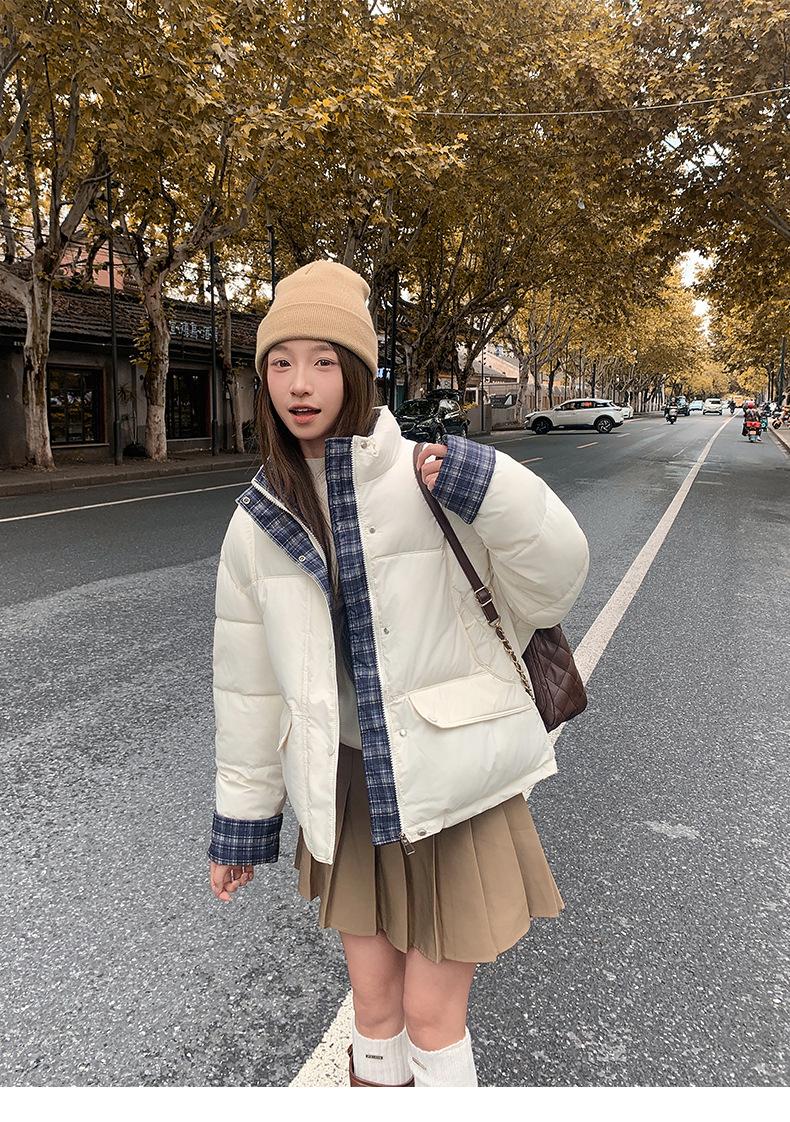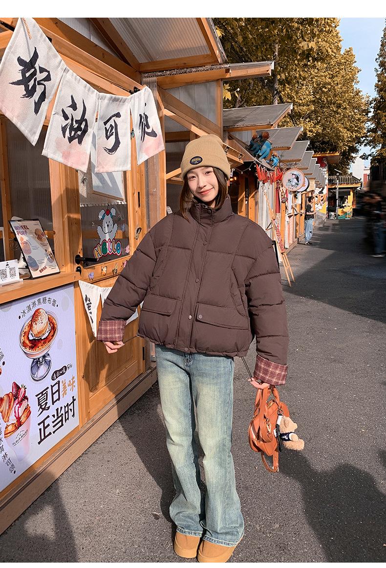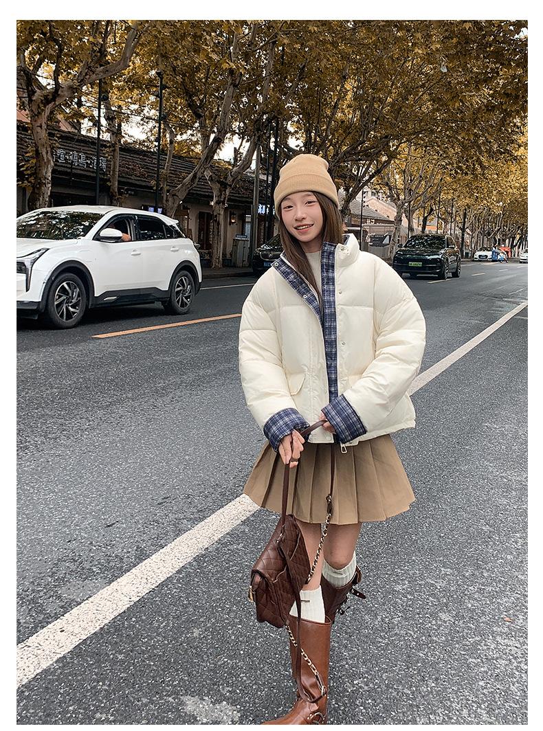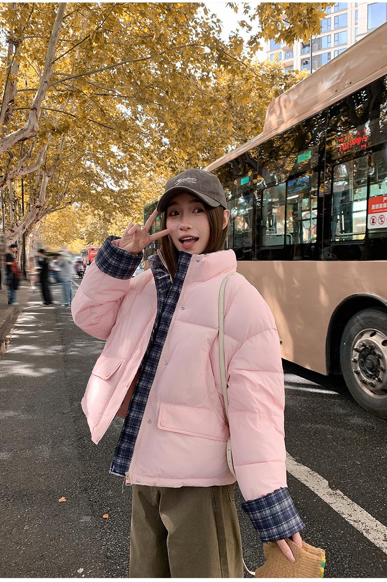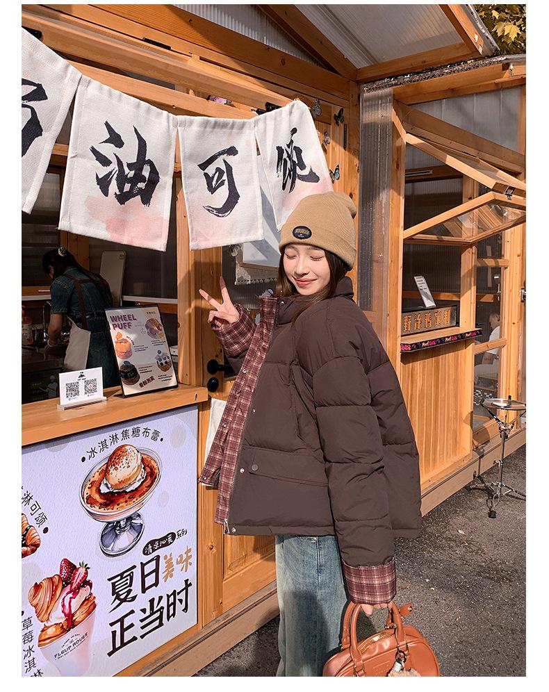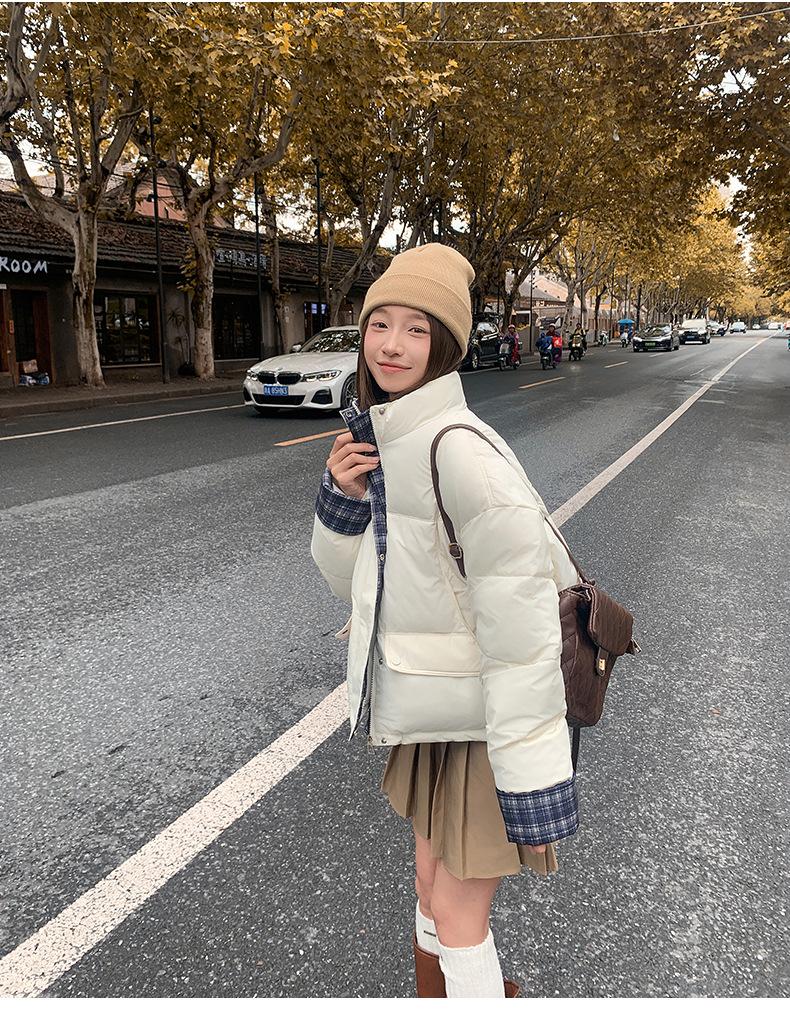 Jaqueta Xadrez de Algodão com Penas Feminina Curta 2025 Nova Outono/Inverno Tamanho Pequeno Casaco de Algodão Outerwear Top Roupas Femininas Casaco Pão