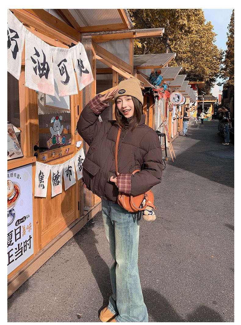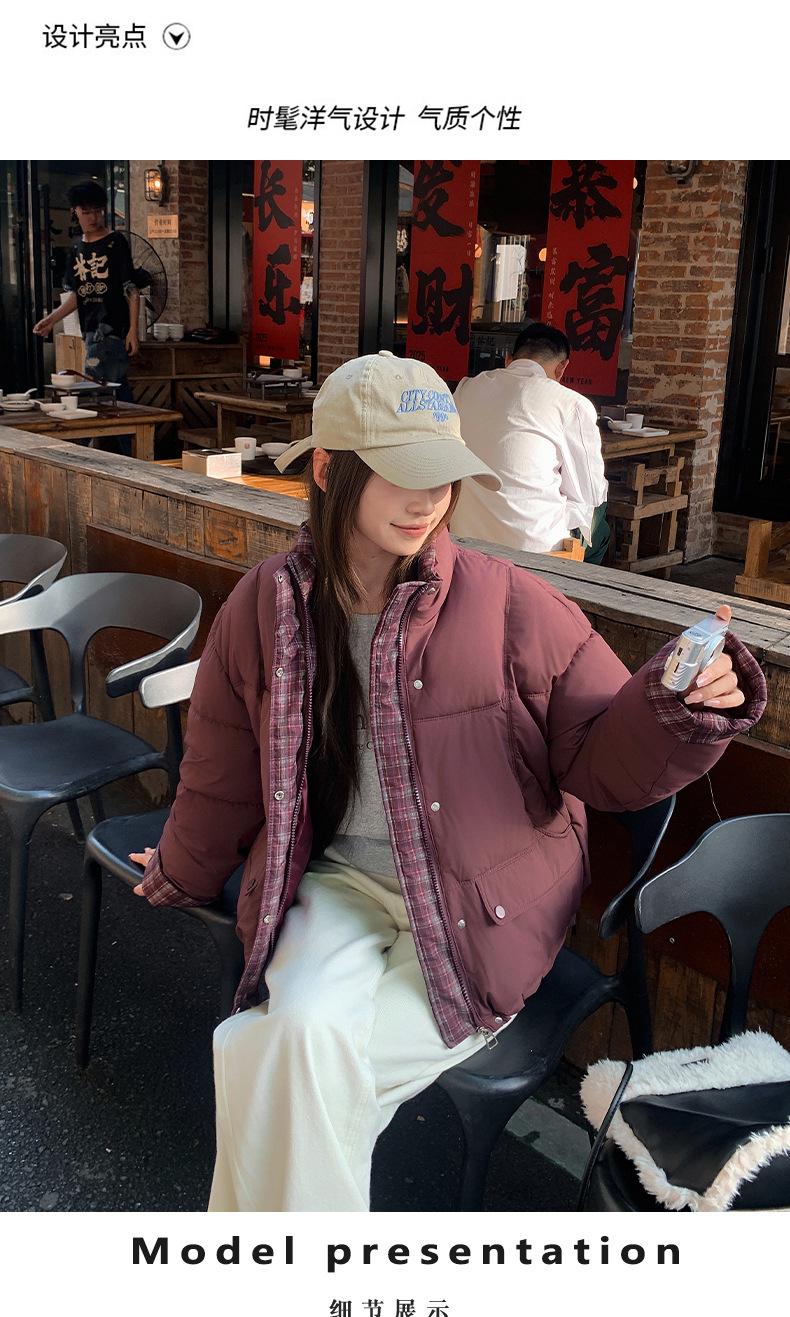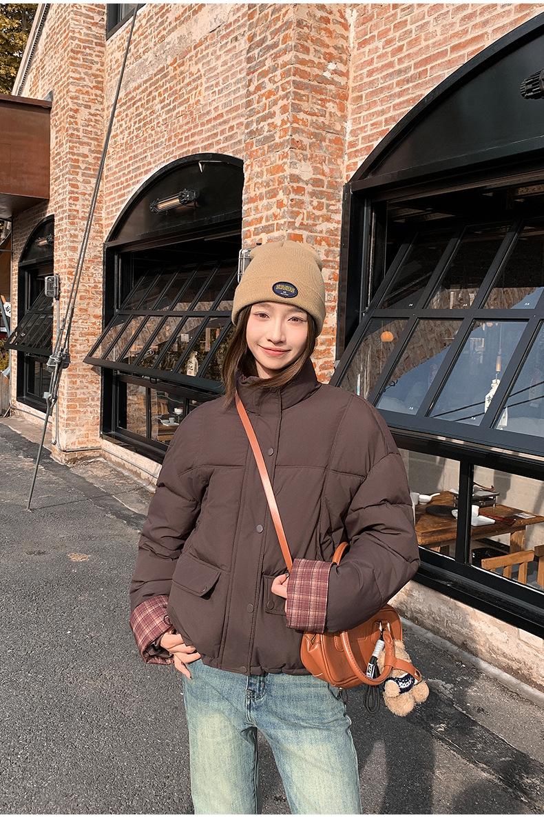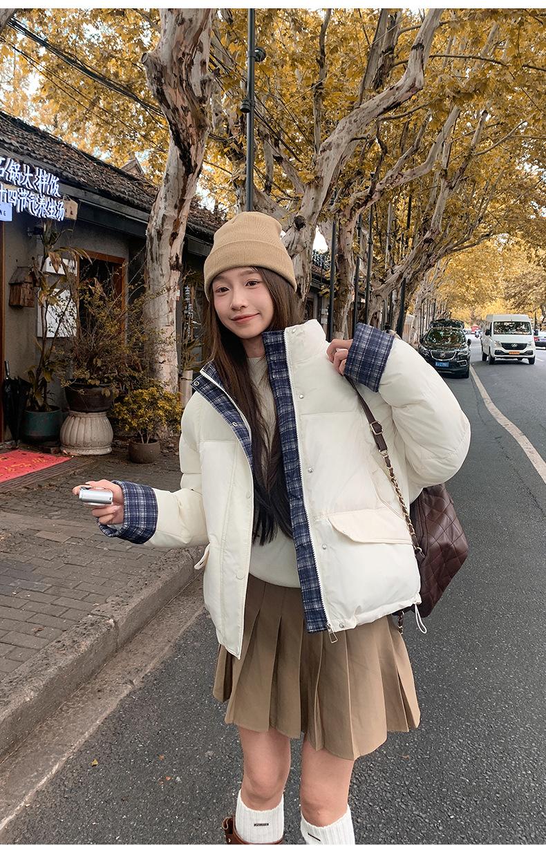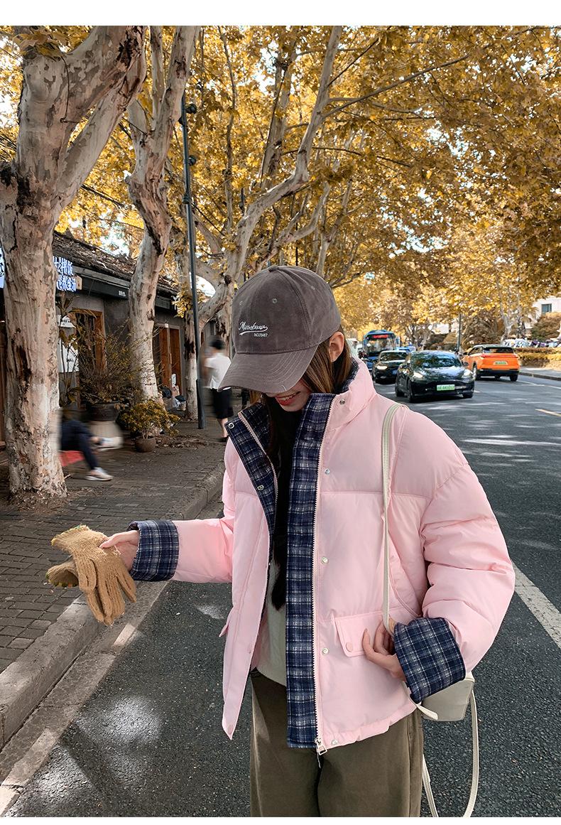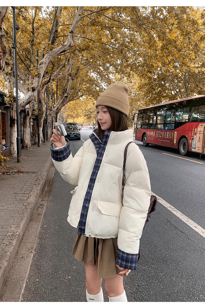 Jaqueta Xadrez de Algodão com Penas Feminina Curta 2025 Nova Outono/Inverno Tamanho Pequeno Casaco de Algodão Outerwear Top Roupas Femininas Casaco Pão