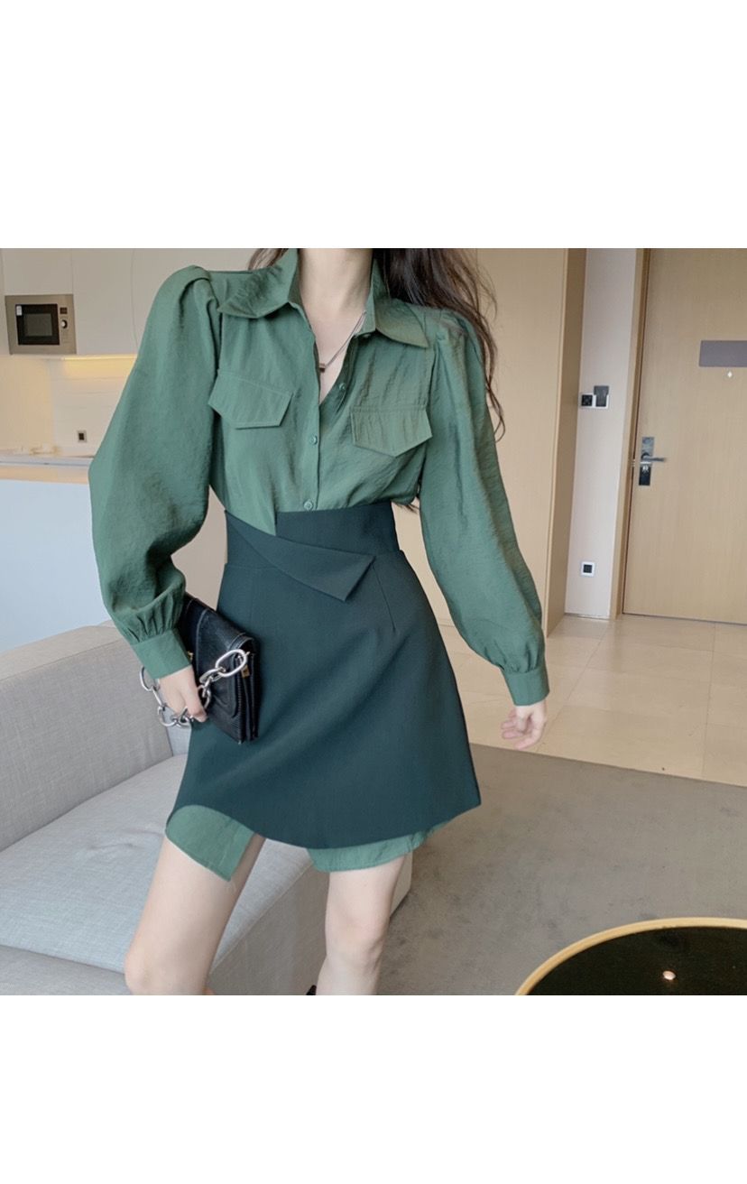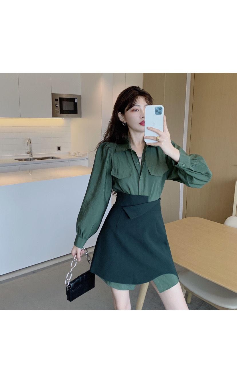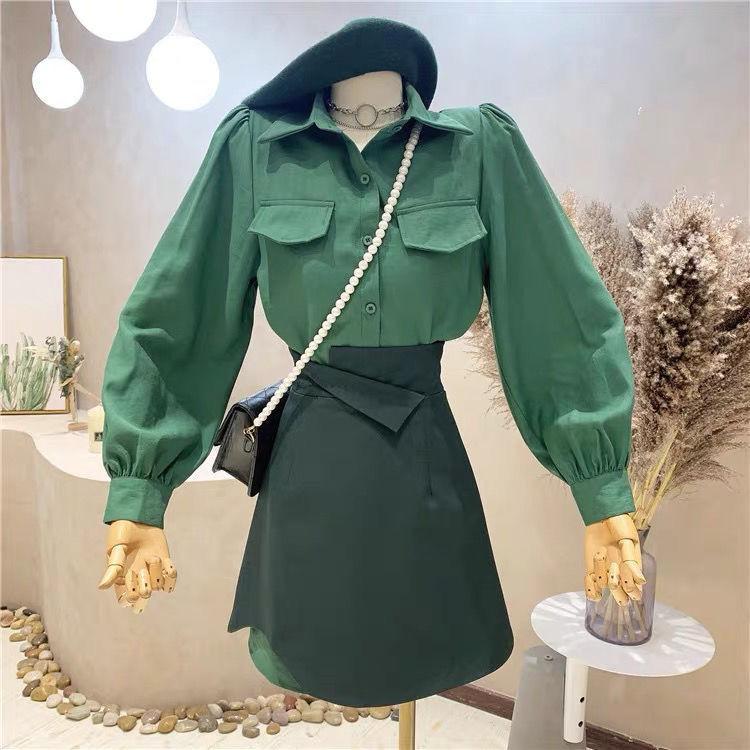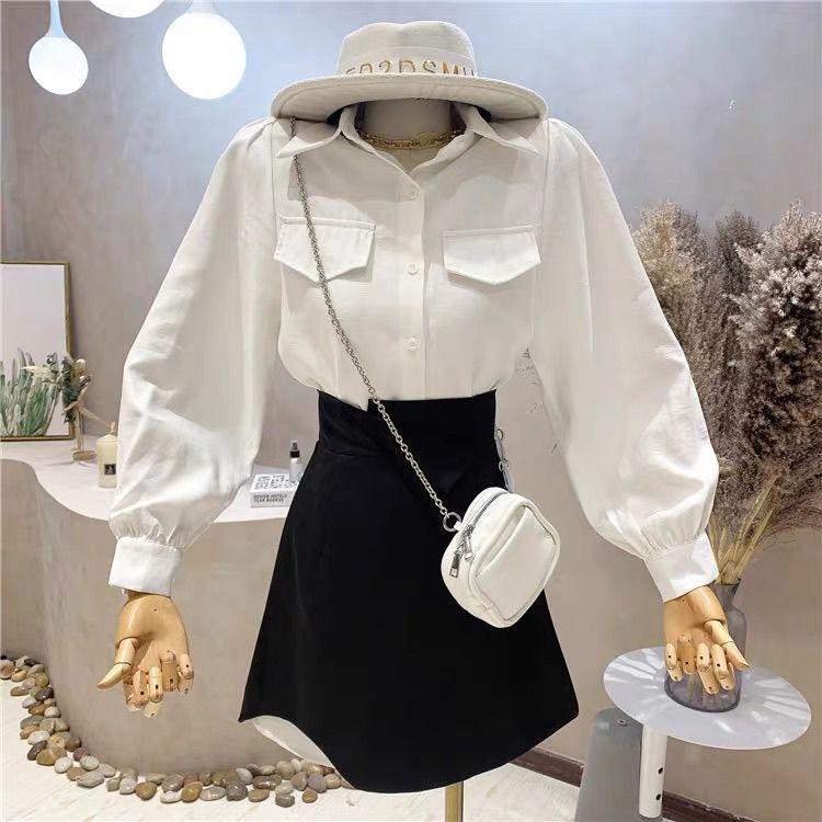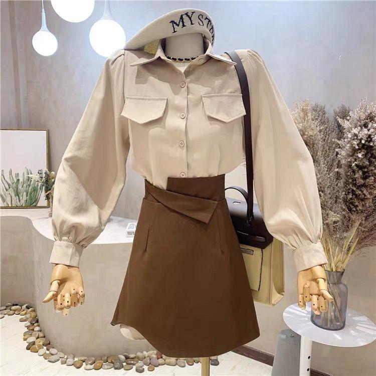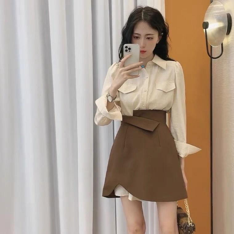 Novo Conjunto de Camisa Midi de Lapela Manga Longa Abotoamento Simples Primavera e Outono + Saia A-line Irregular Emagrecedora de Cintura Alta