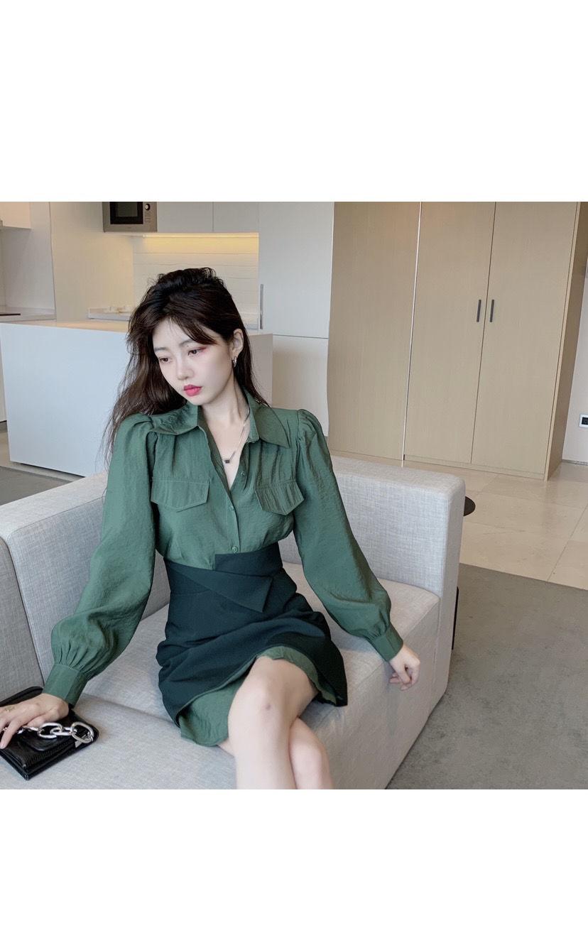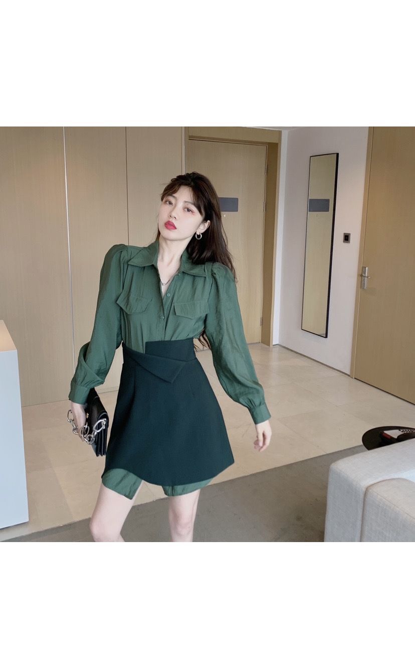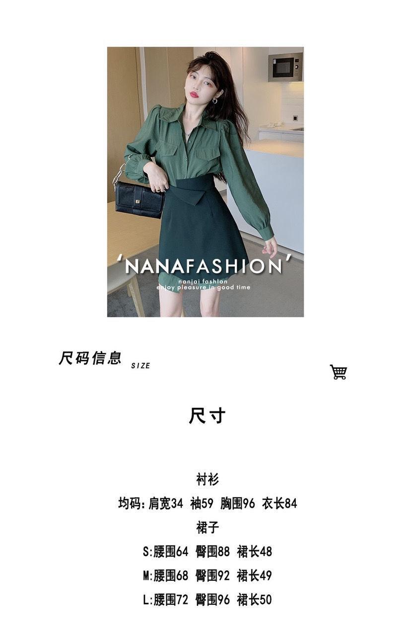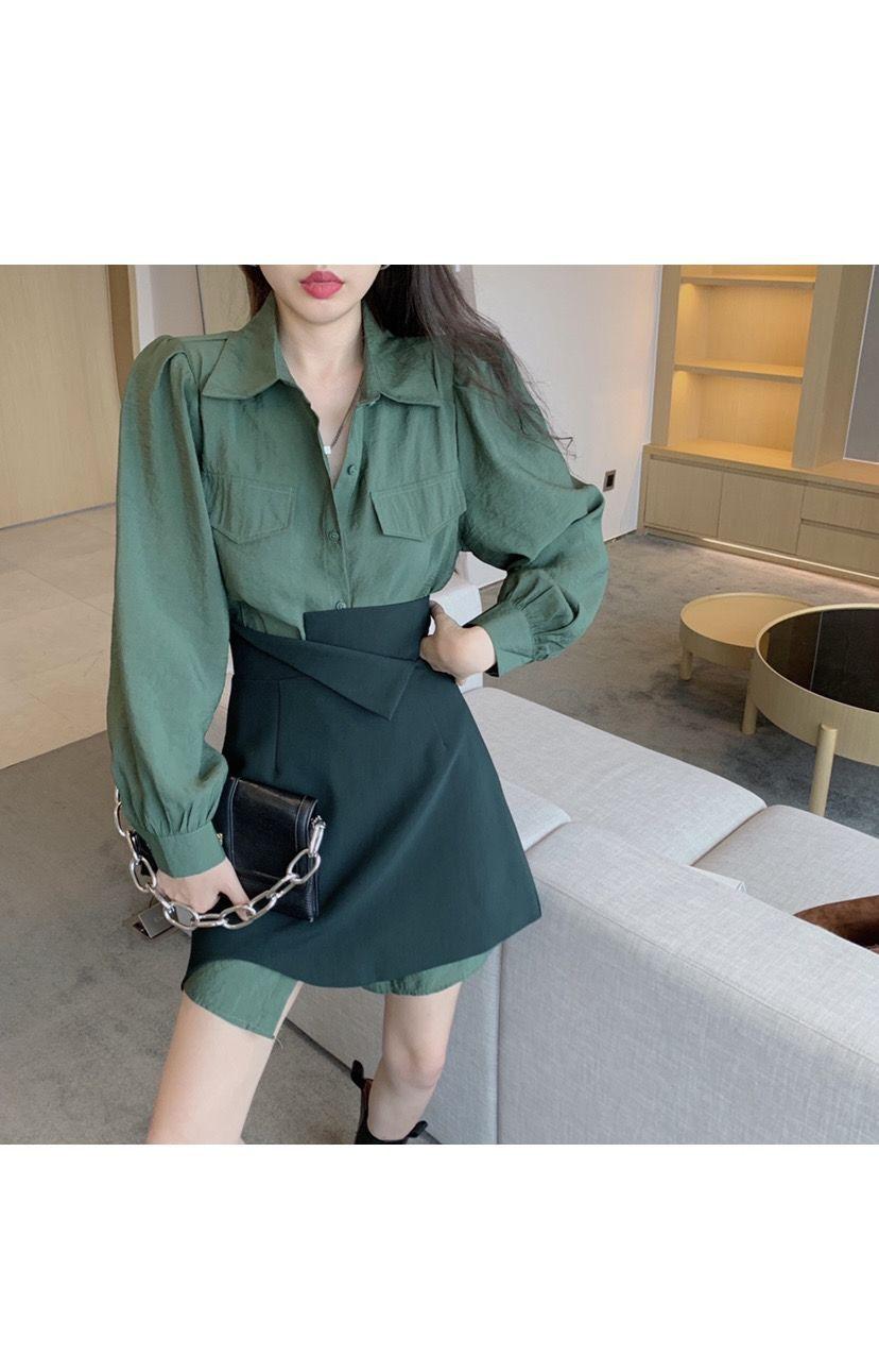 Novo Conjunto de Camisa Midi de Lapela Manga Longa Abotoamento Simples Primavera e Outono + Saia A-line Irregular Emagrecedora de Cintura Alta
