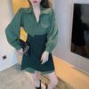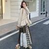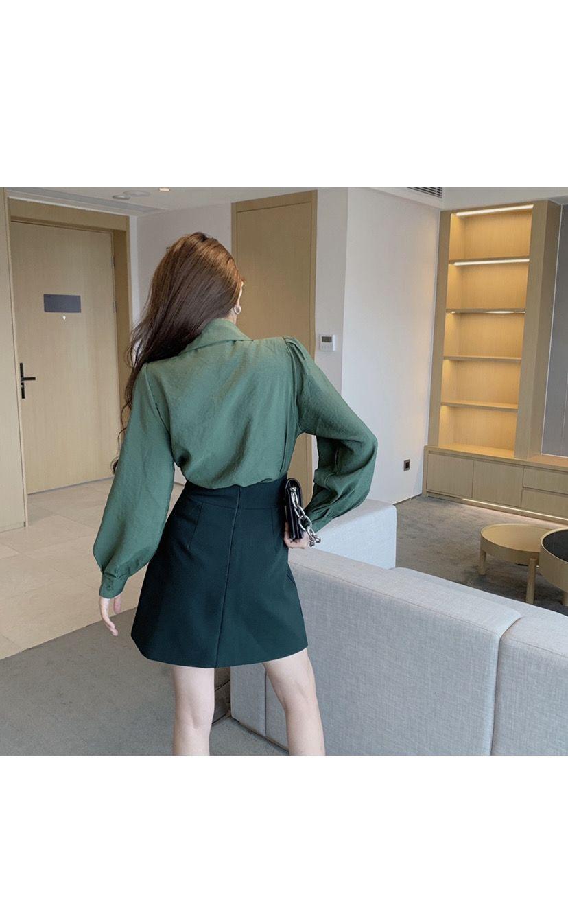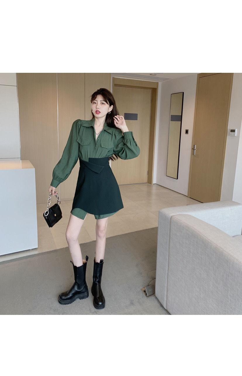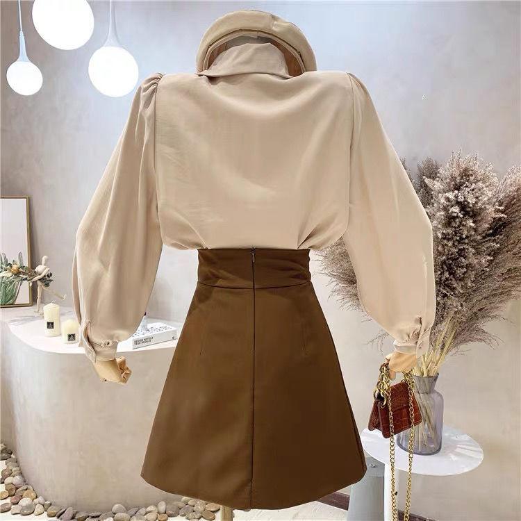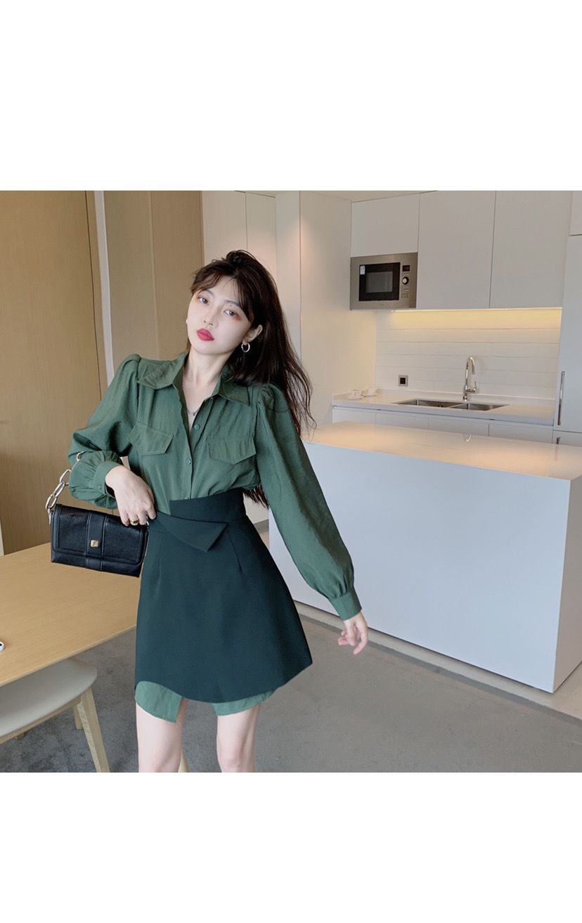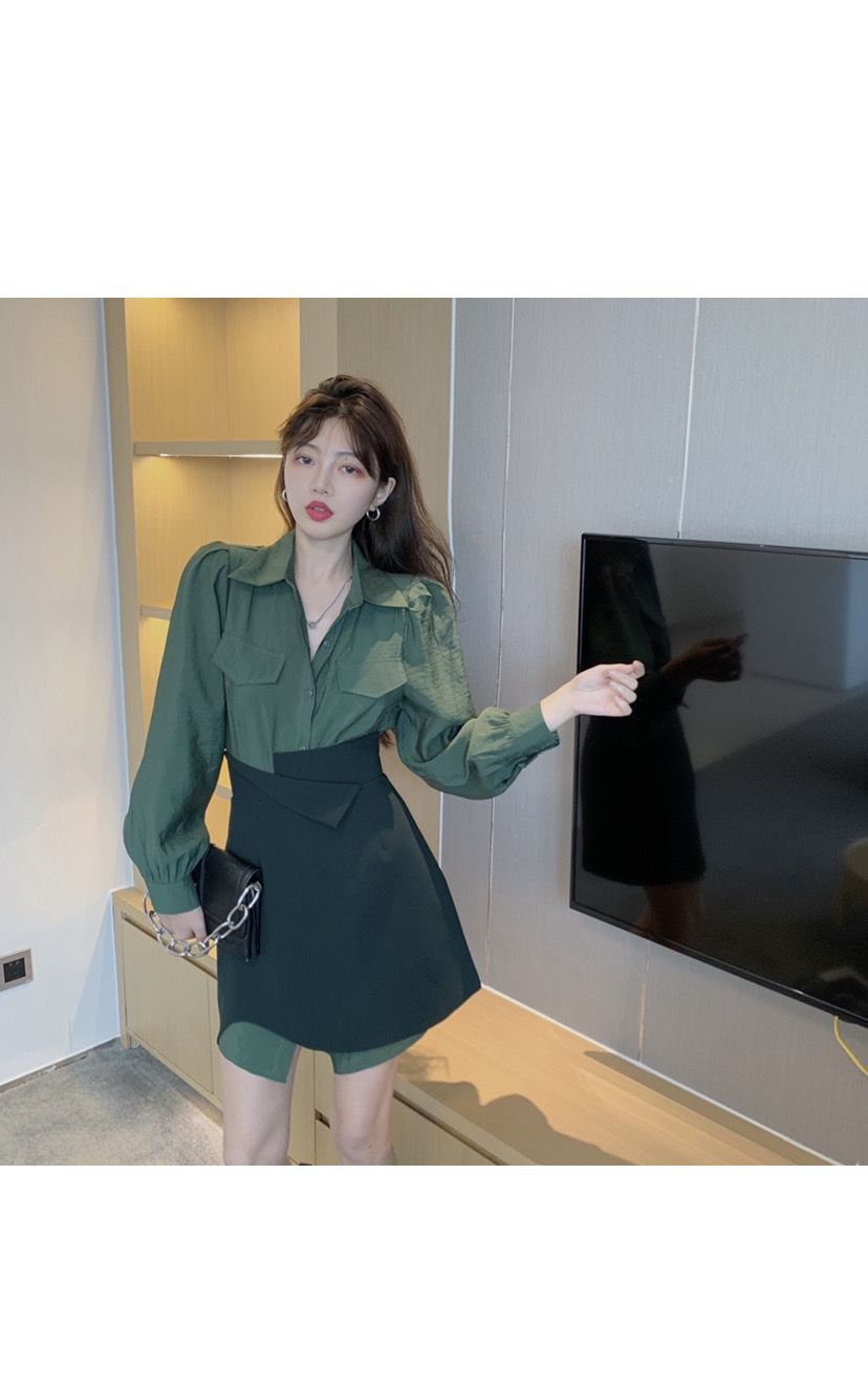 Novo Conjunto de Camisa Midi de Lapela Manga Longa Abotoamento Simples Primavera e Outono + Saia A-line Irregular Emagrecedora de Cintura Alta