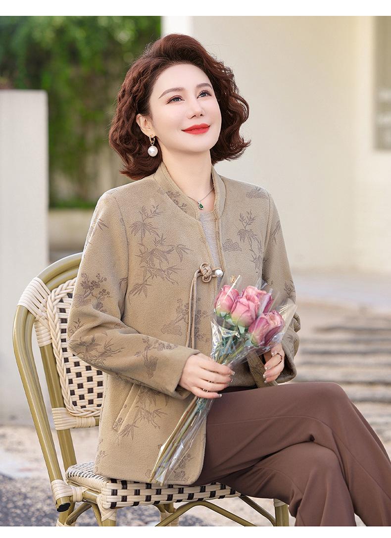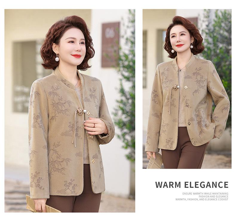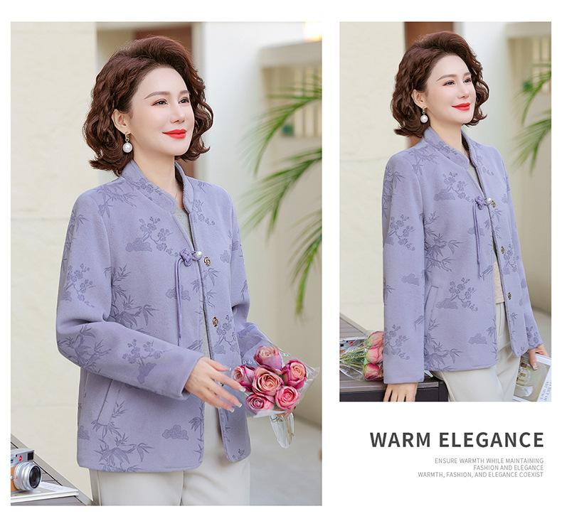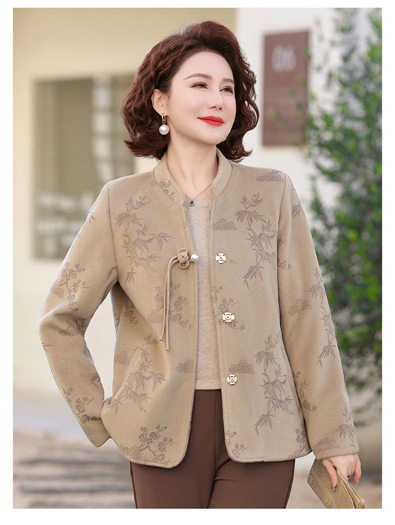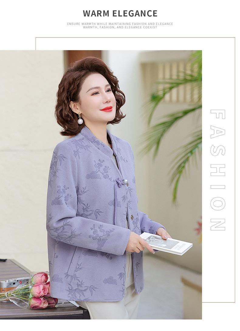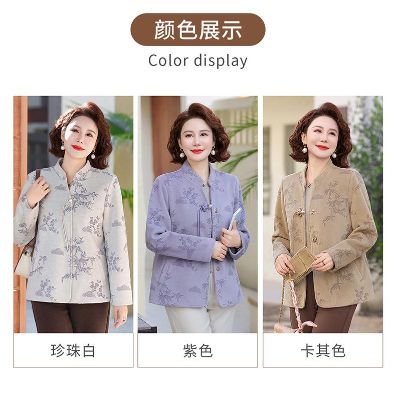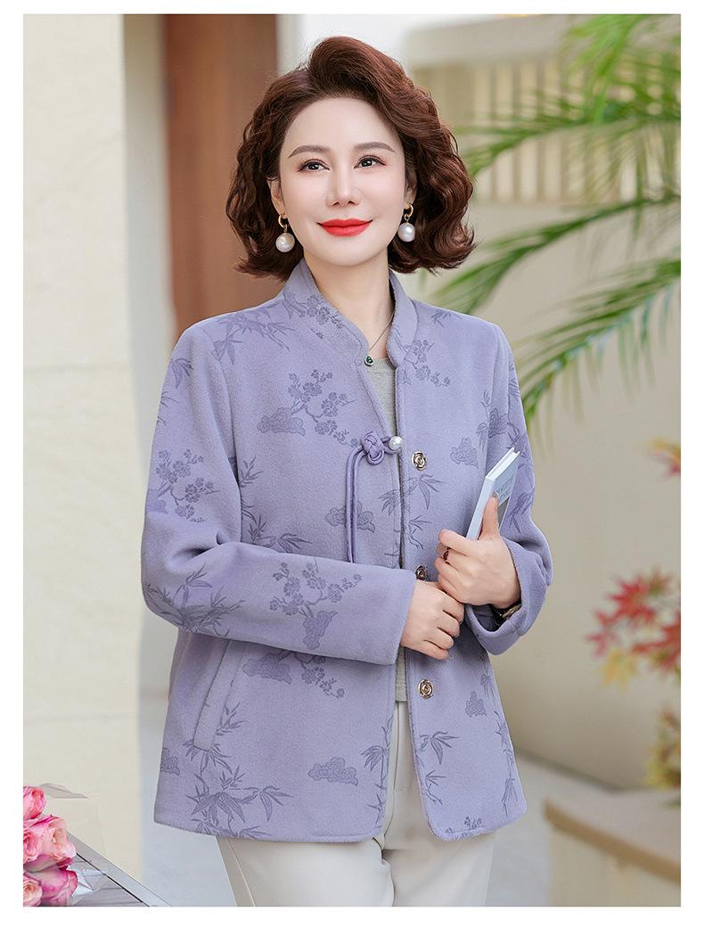 Outwear de Outono para Mães Gola Alta Chinesa Nobre Mulheres de Meia-Idade e Idosas Primavera e Outono 2025 Novo Estilo Top de Lã da Moda