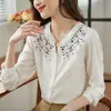 Início do Outono Novo Estilo Étnico Gola Redonda Bordado Lanterna Manga Longa Camisa Solta Temperamento Simples Emagrecimento Top Retrô Feminino