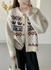 Gola Redonda Outono e Inverno 2025 Novo Suéter Feminino Cardigan Tricotado Fair Isle Feminino Ombro a Ombro Manga Longa Estilo Coreano Botões