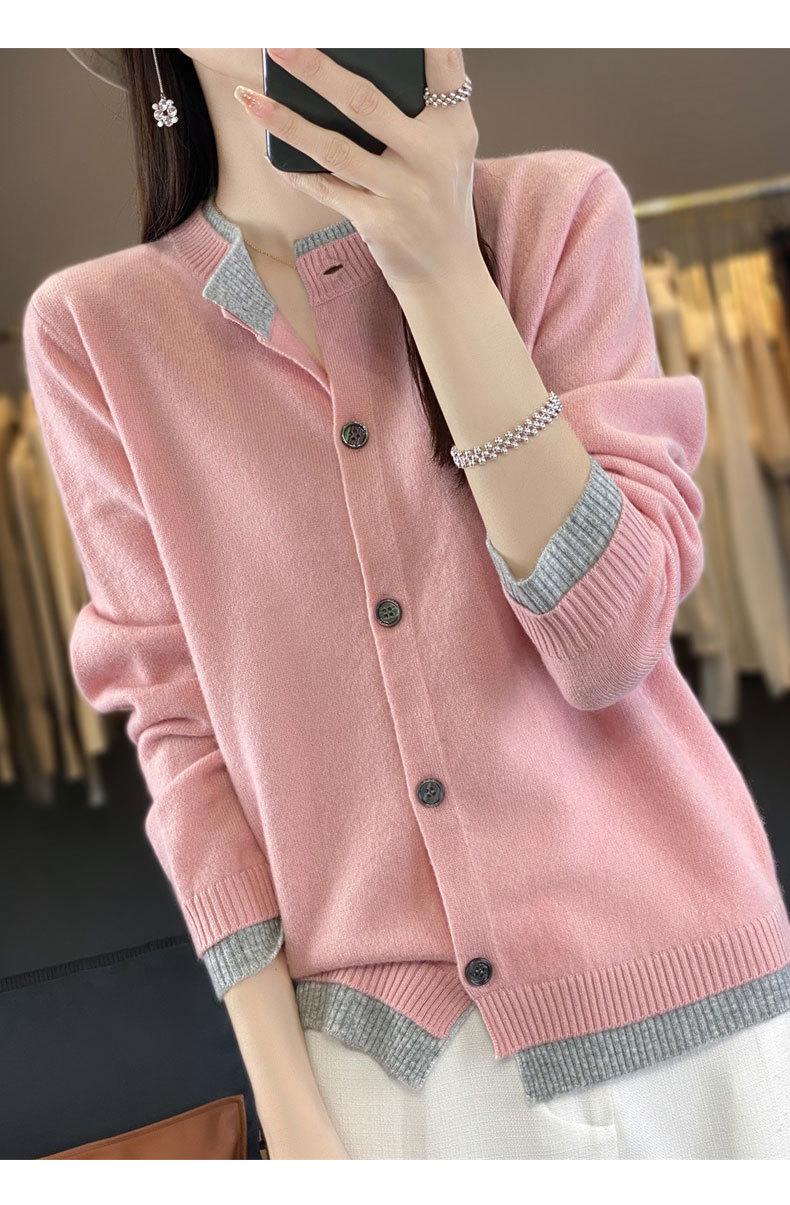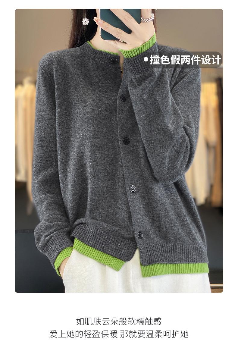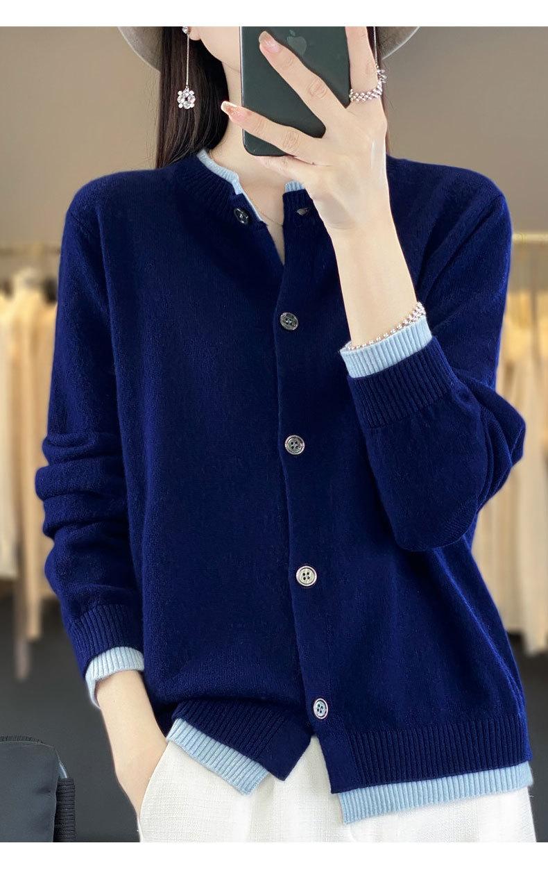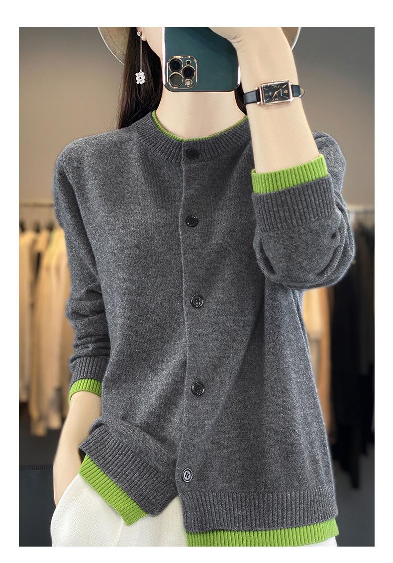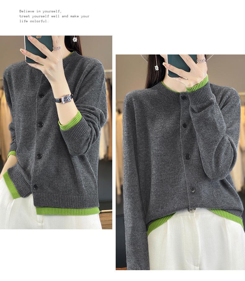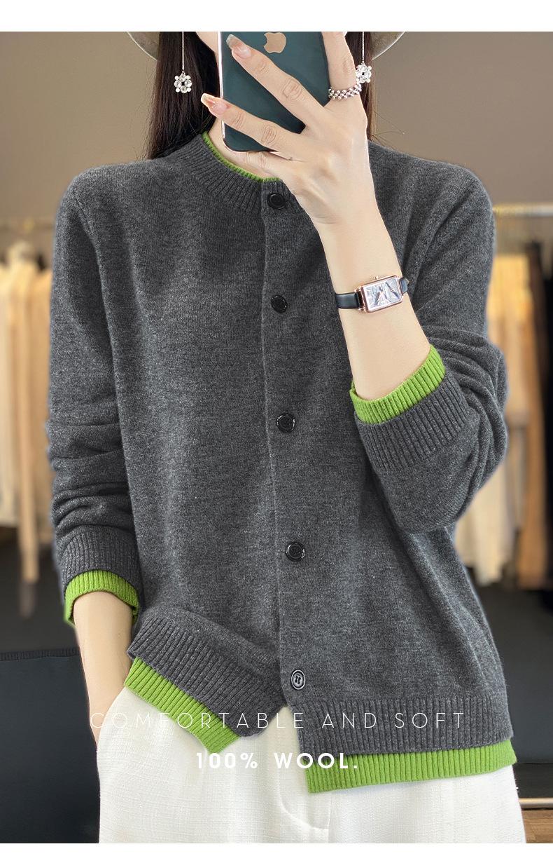 Cardigan de Tricô de Lã Pura Novo Outono Antecipado 2025 Feminino Color Block Gola Redonda Solto Temperamento Casual Macio Botões Casaco