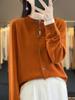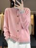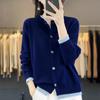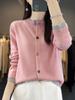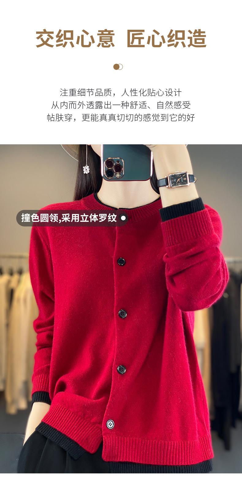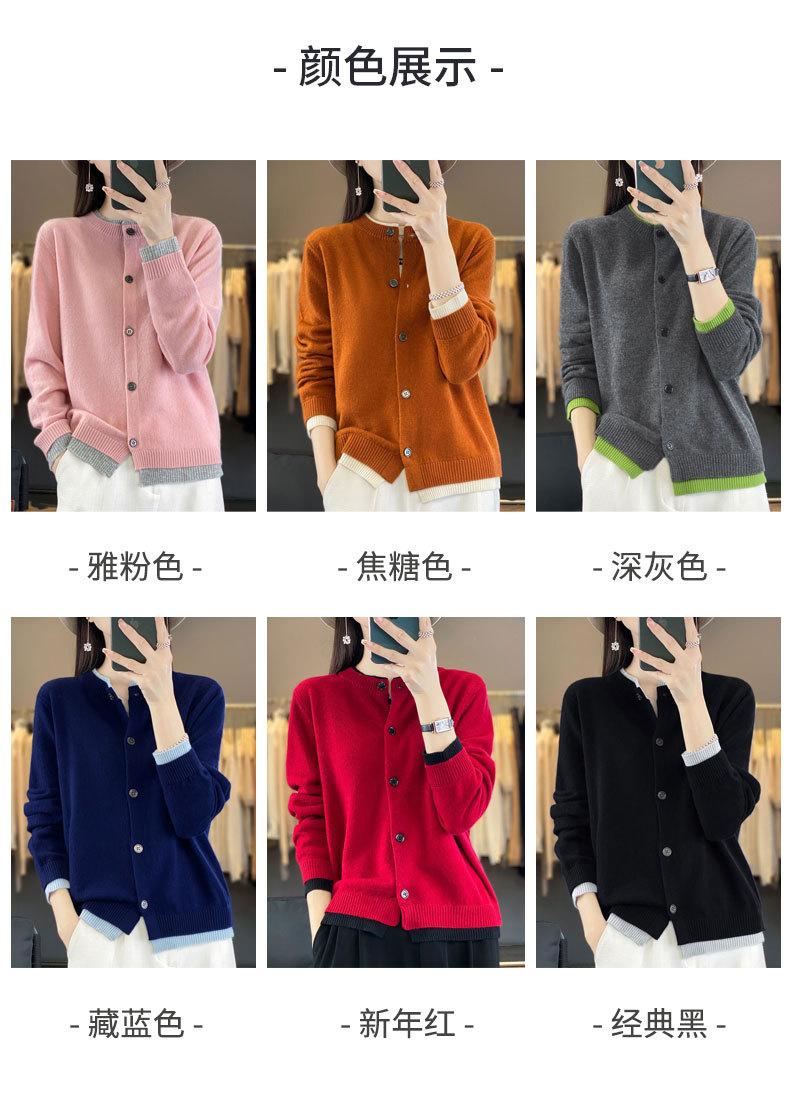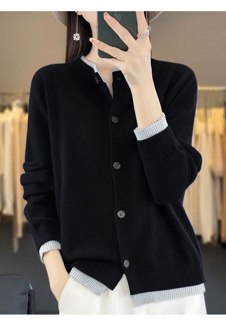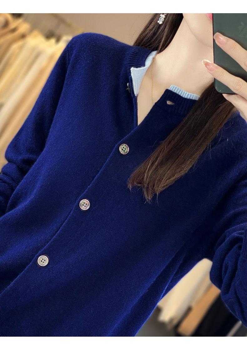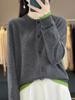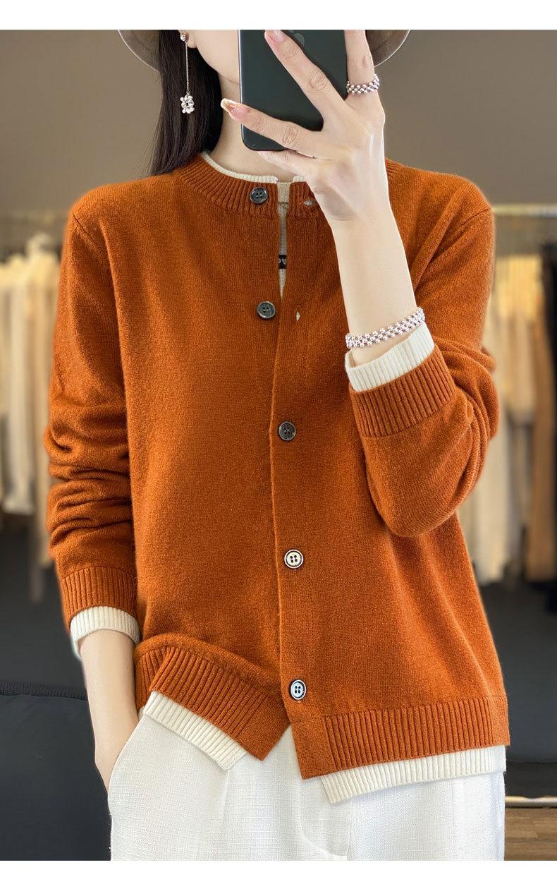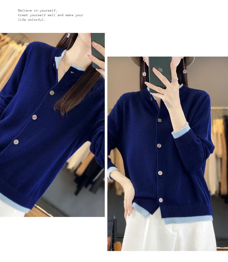 Cardigan de Tricô de Lã Pura Novo Outono Antecipado 2025 Feminino Color Block Gola Redonda Solto Temperamento Casual Macio Botões Casaco