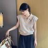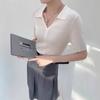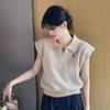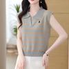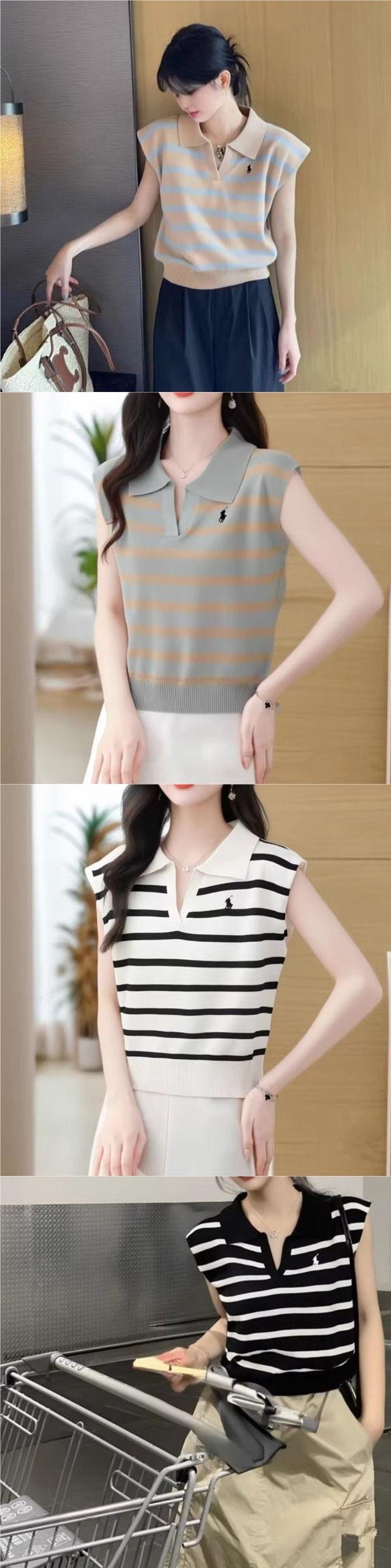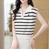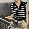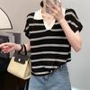 Polo de Design Elegante e Único Bordado Color Block Listrado Ombro Reto Manga Curta Top Solto Tricô Modelador para Mulheres