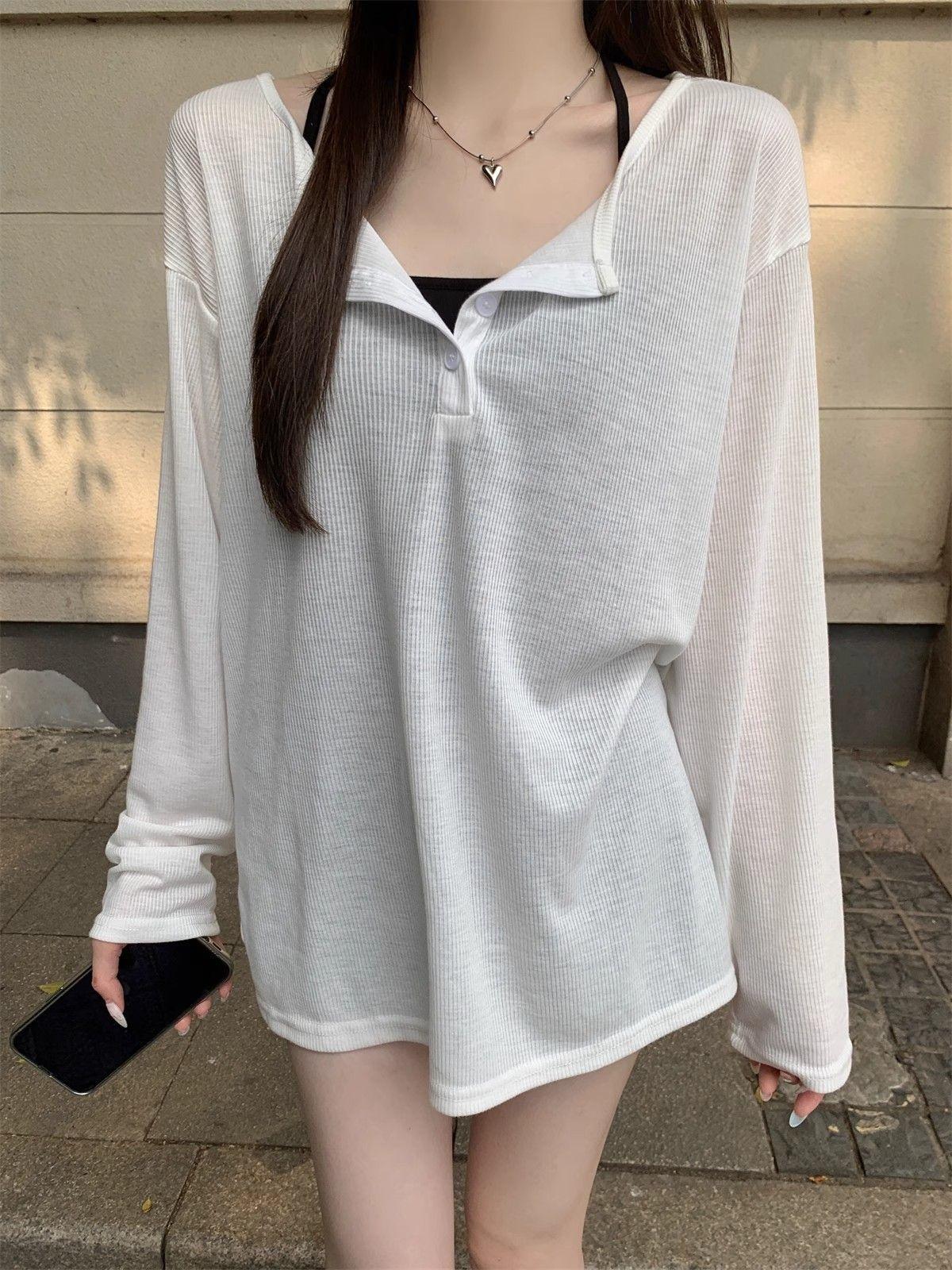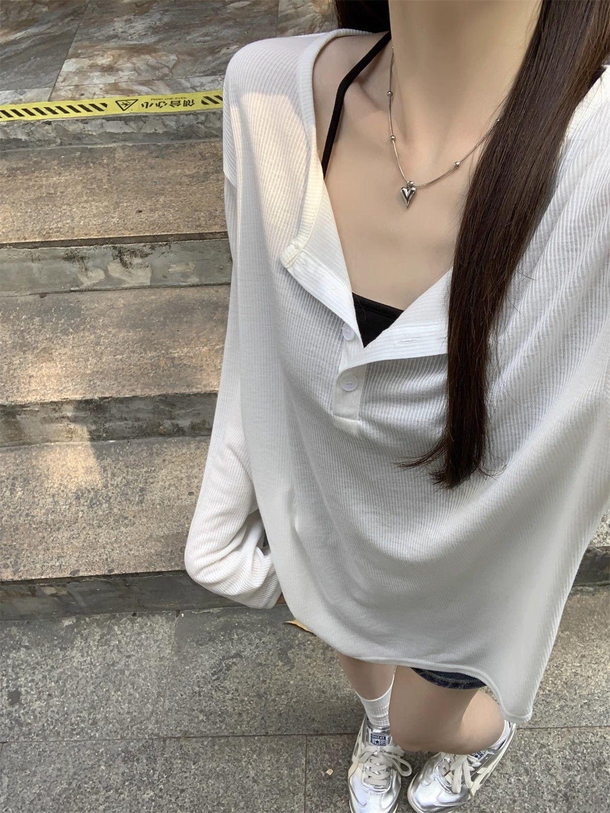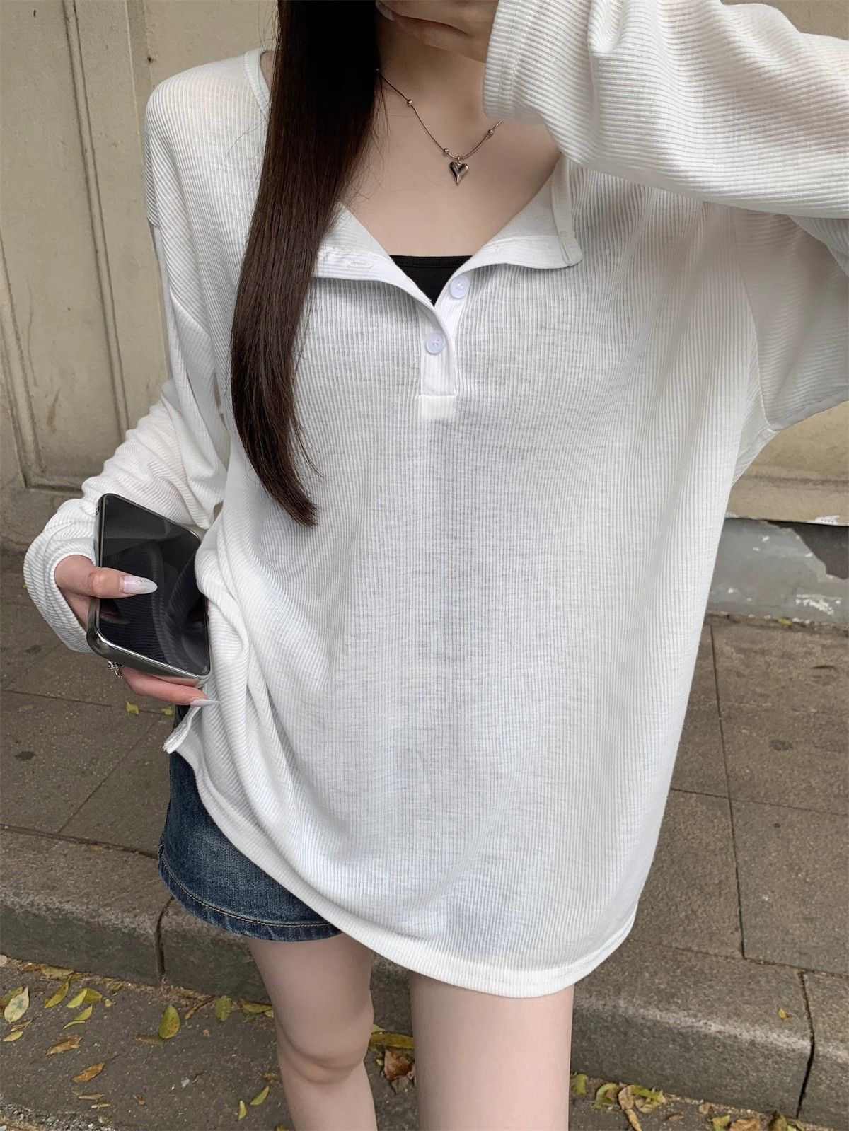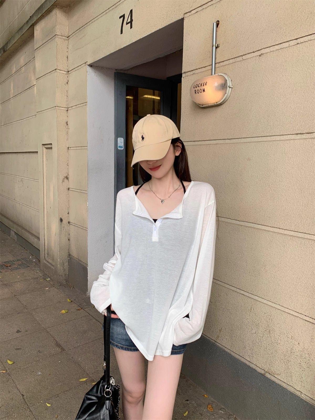 Camiseta Elegante de Manga Comprida com Gola Polo Aberta Estilo Coreano 2025 Verão Nova Blusa Solta Fina Top Feminino Chique