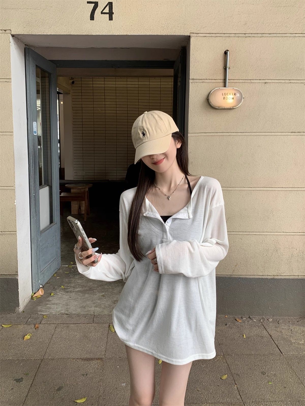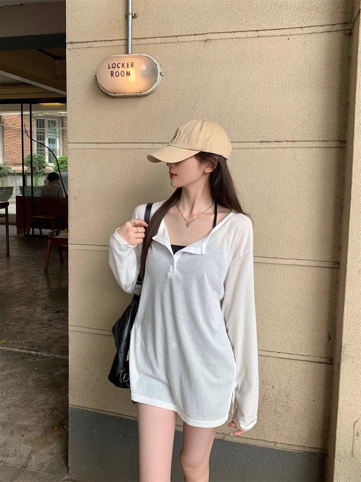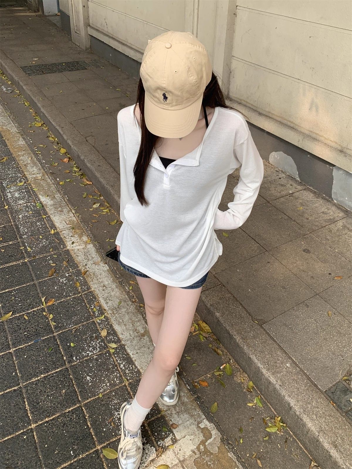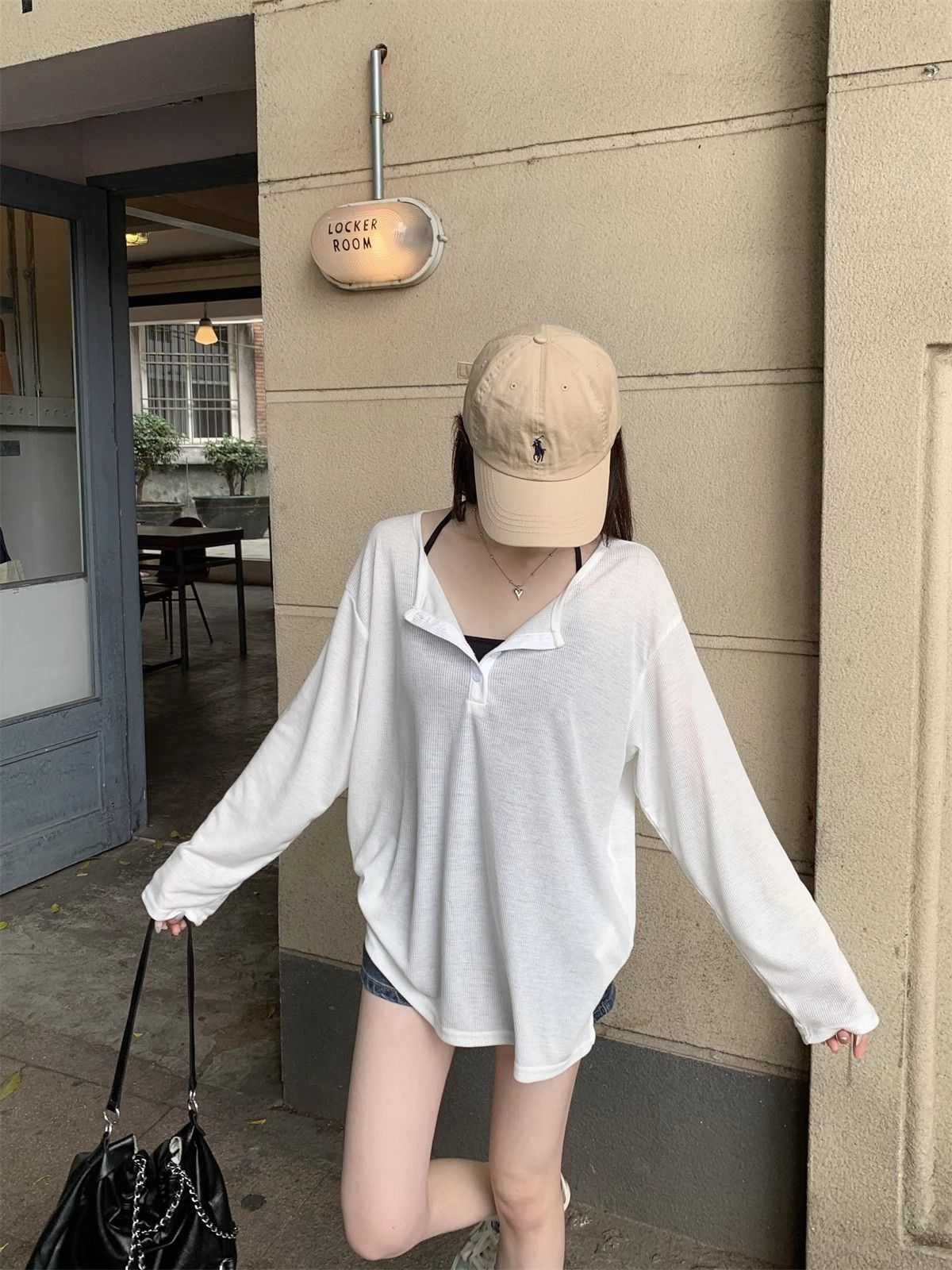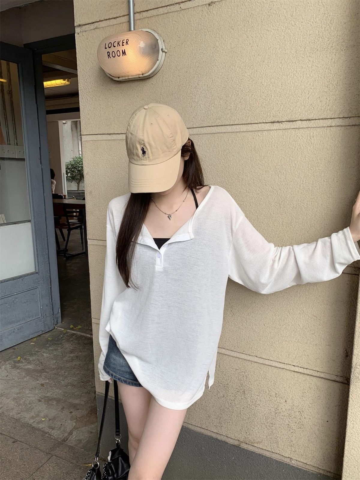 Camiseta Elegante de Manga Comprida com Gola Polo Aberta Estilo Coreano 2025 Verão Nova Blusa Solta Fina Top Feminino Chique