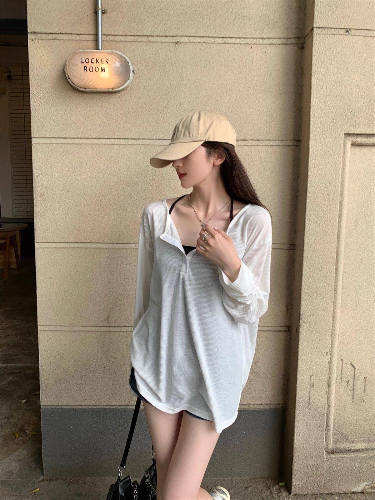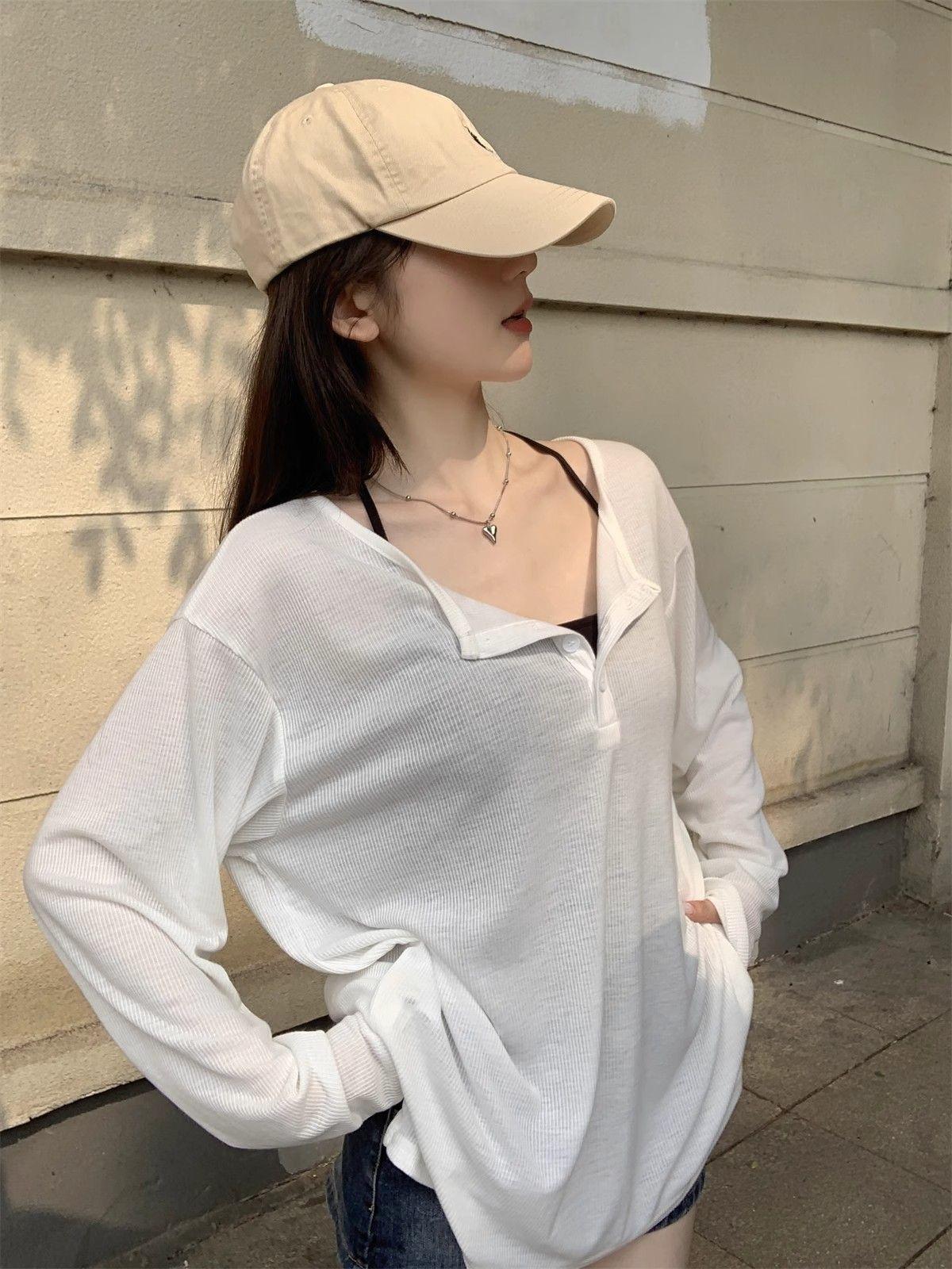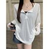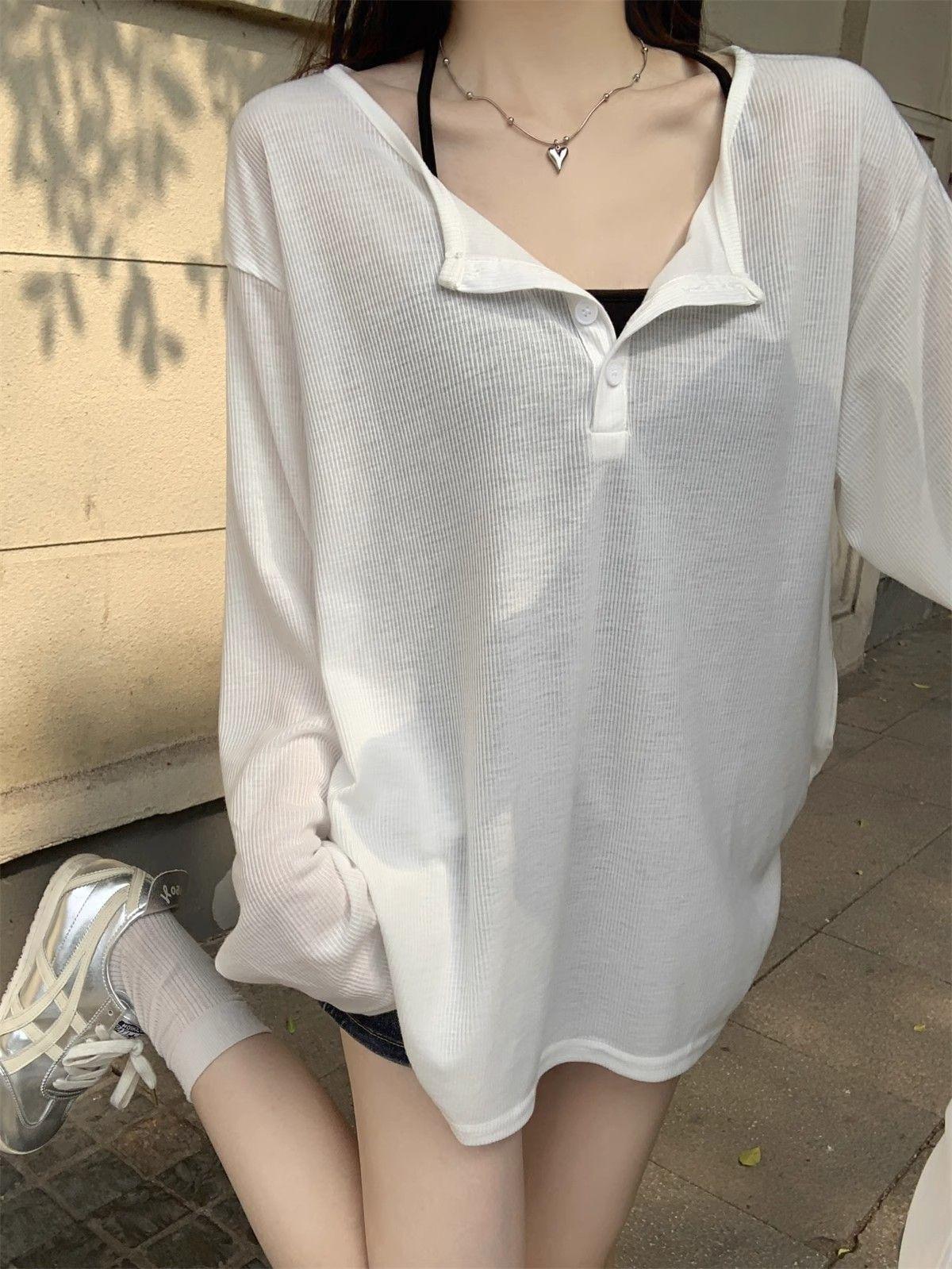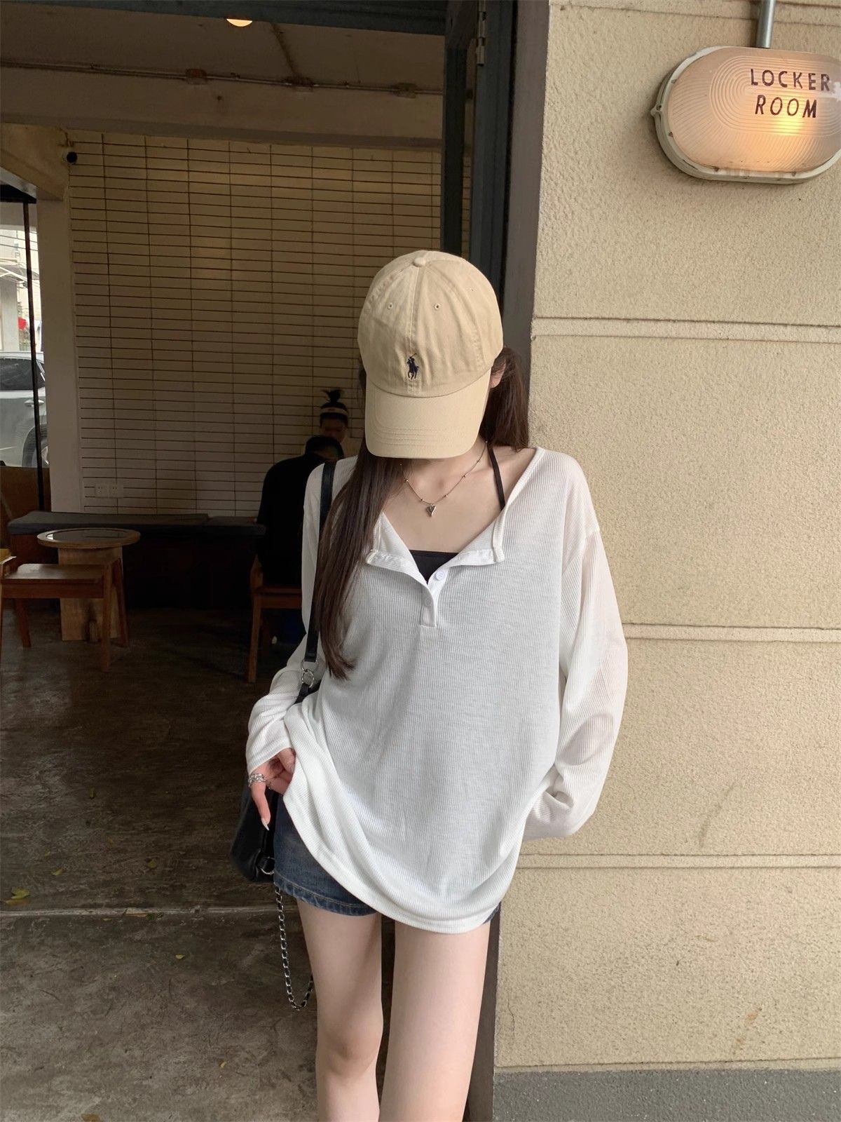 Camiseta Elegante de Manga Comprida com Gola Polo Aberta Estilo Coreano 2025 Verão Nova Blusa Solta Fina Top Feminino Chique