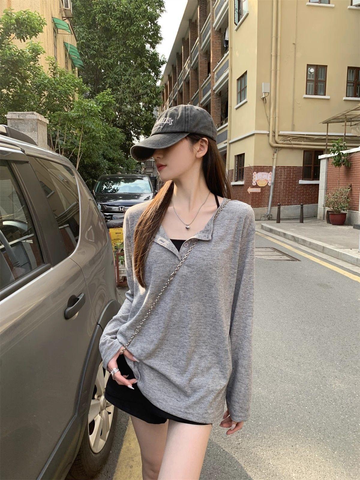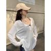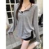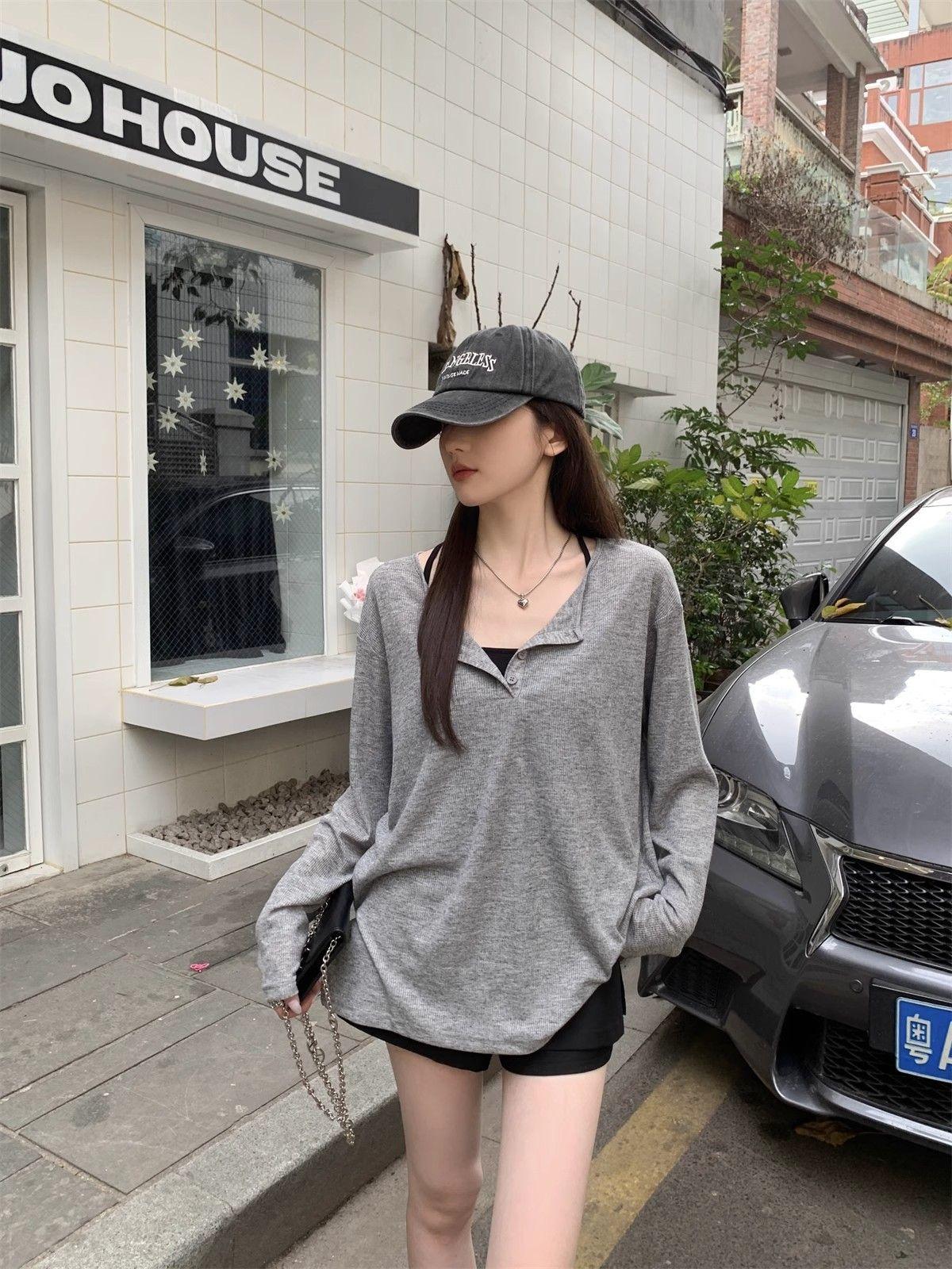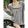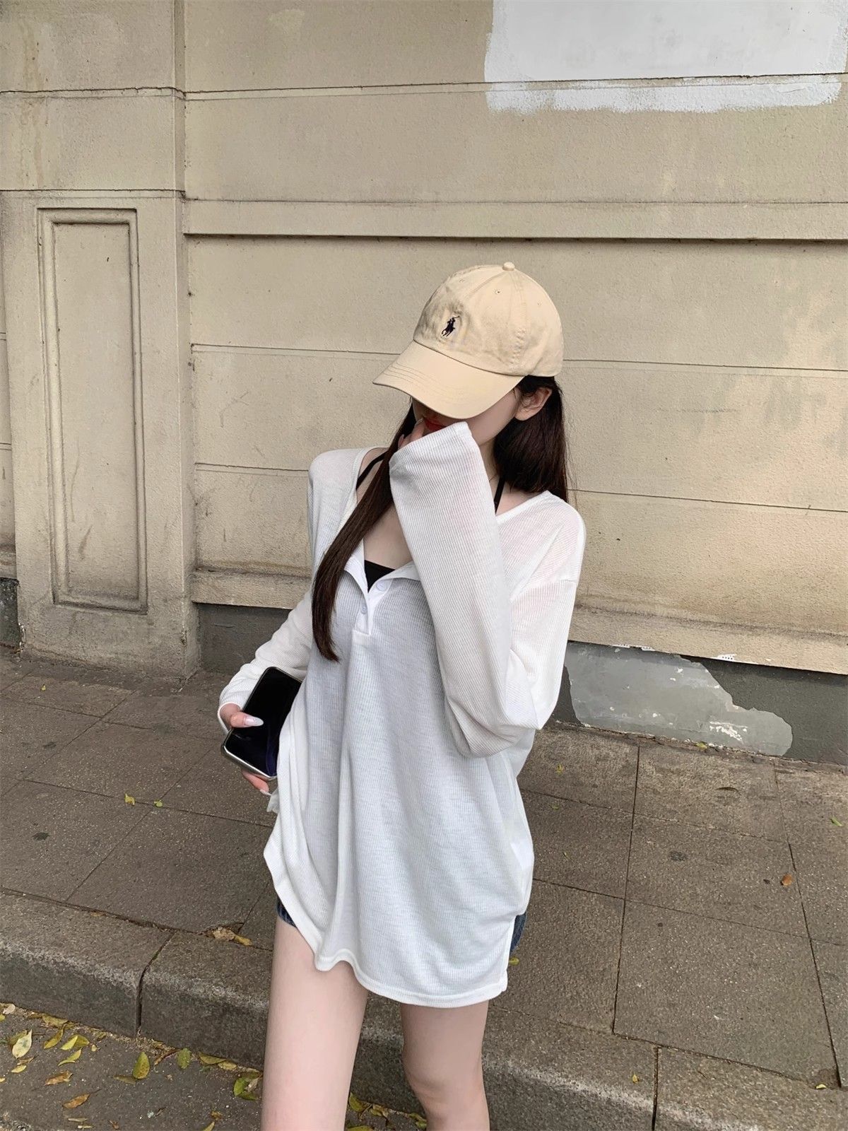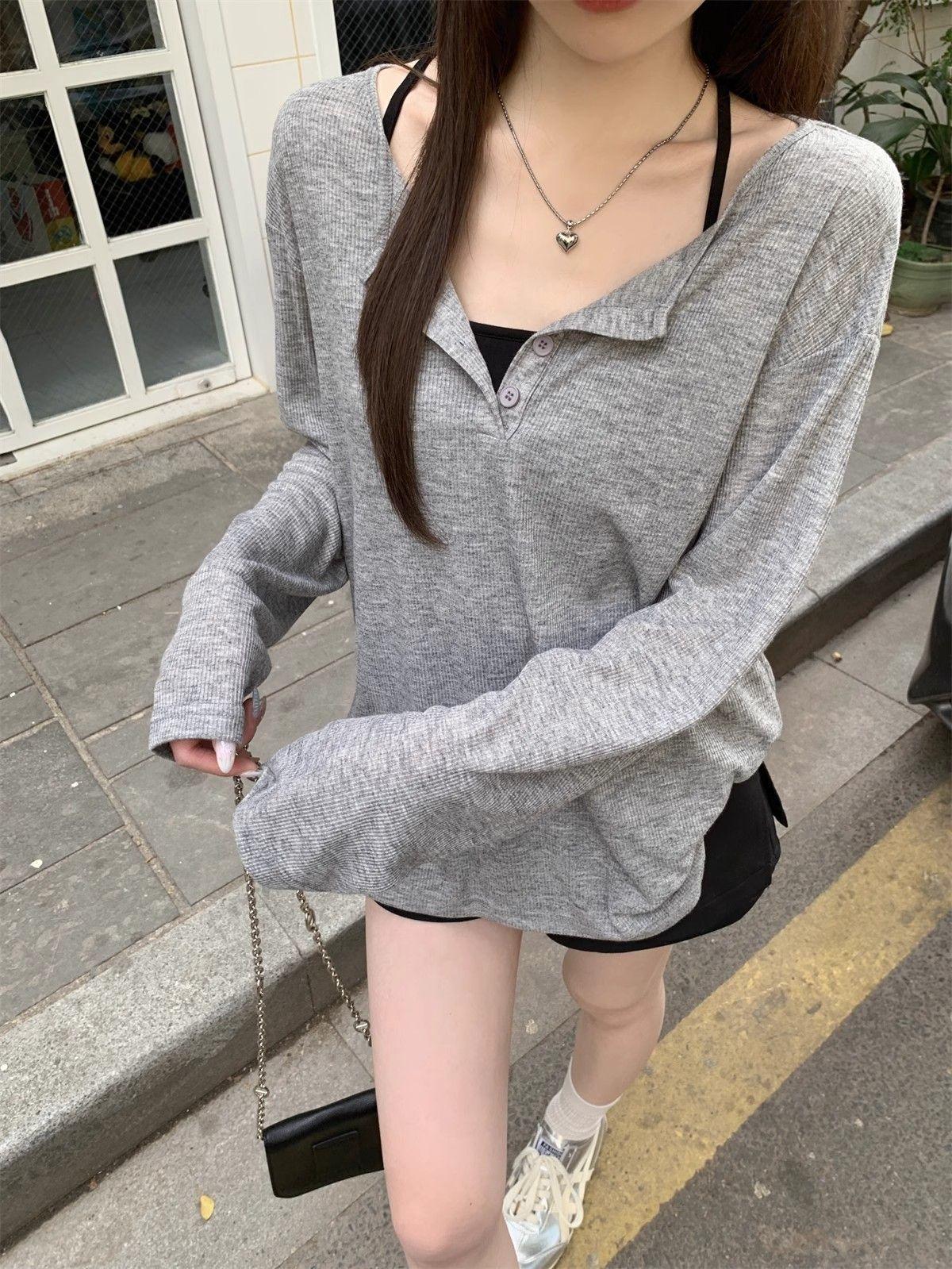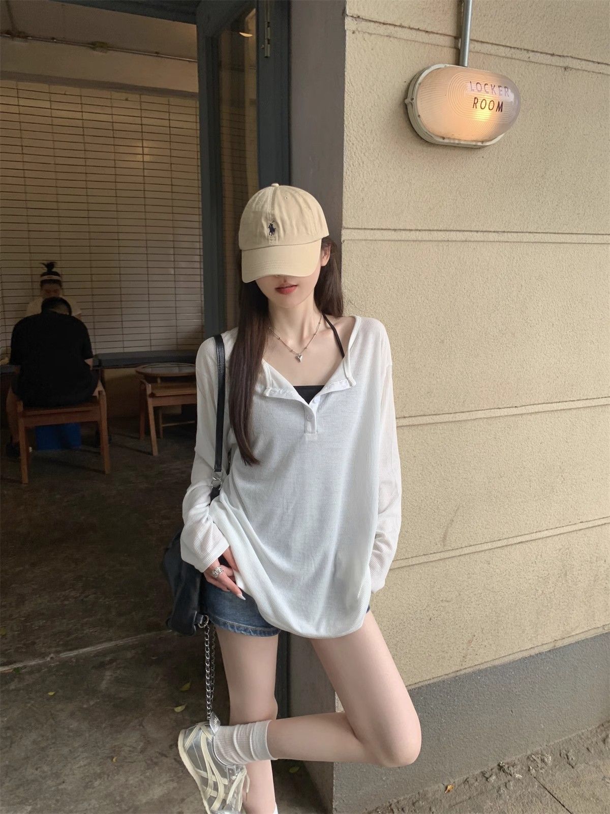 Camiseta Elegante de Manga Comprida com Gola Polo Aberta Estilo Coreano 2025 Verão Nova Blusa Solta Fina Top Feminino Chique