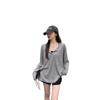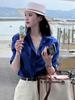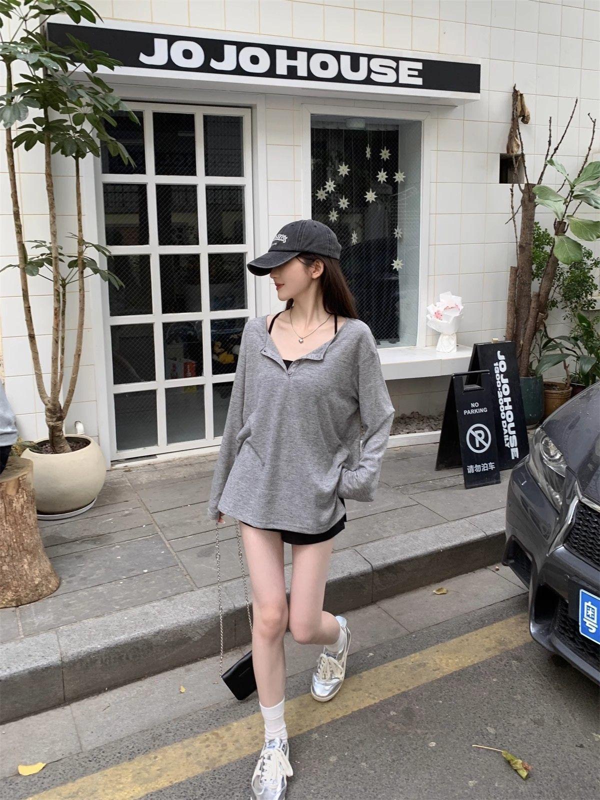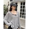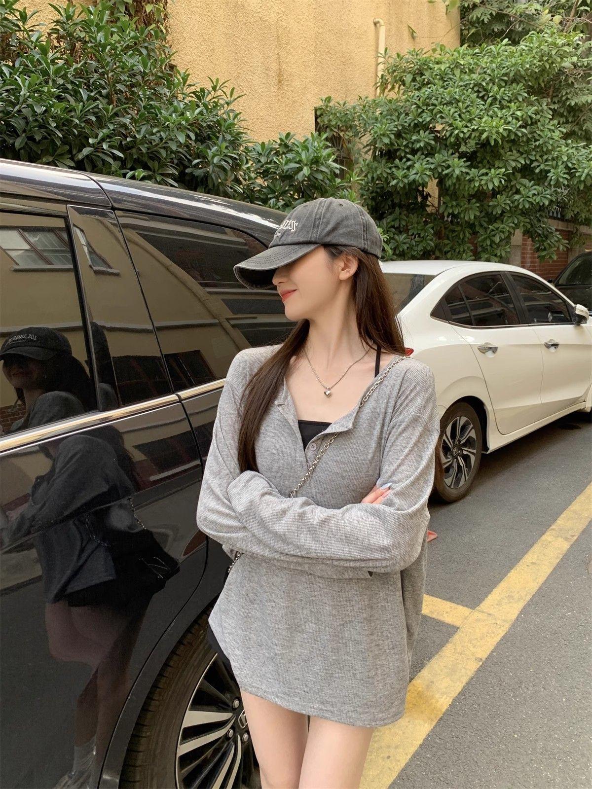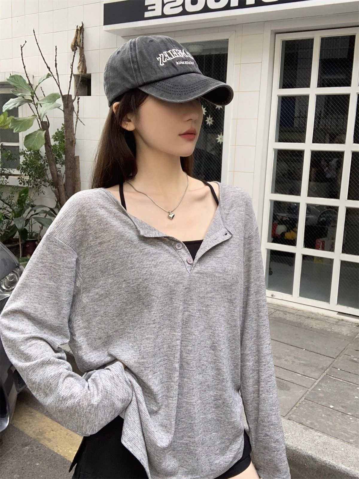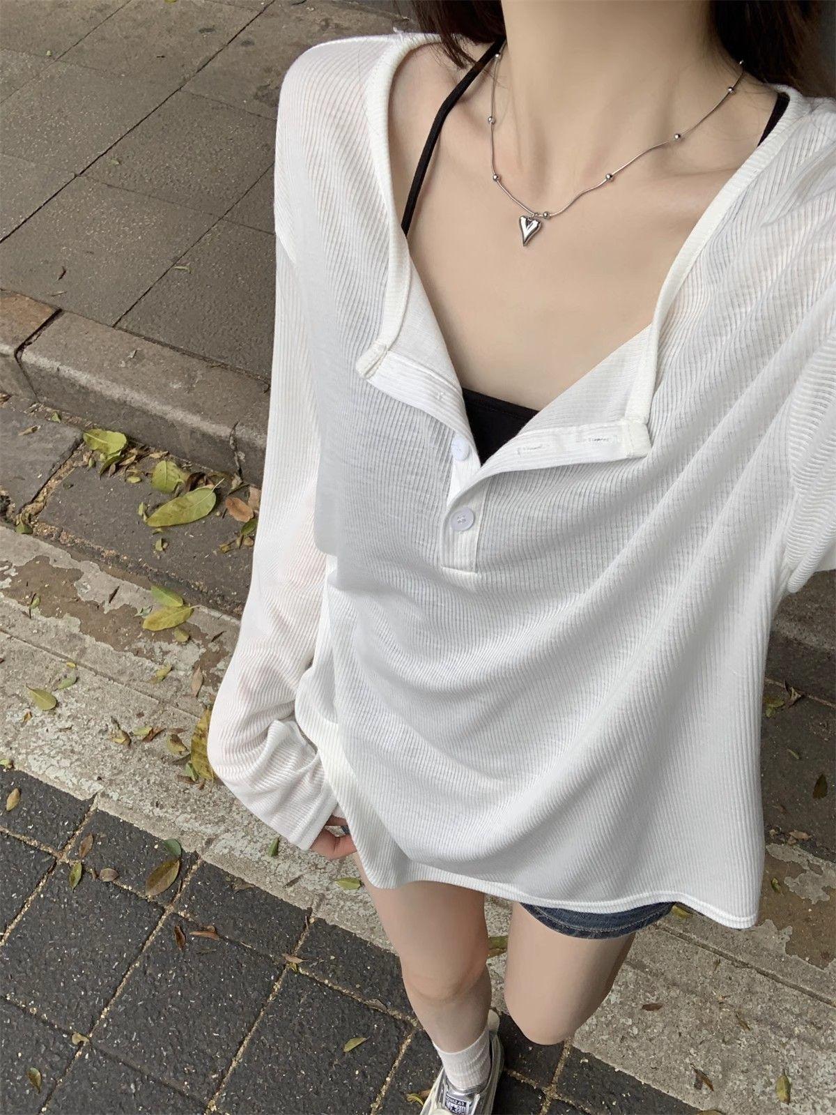 Camiseta Elegante de Manga Comprida com Gola Polo Aberta Estilo Coreano 2025 Verão Nova Blusa Solta Fina Top Feminino Chique
