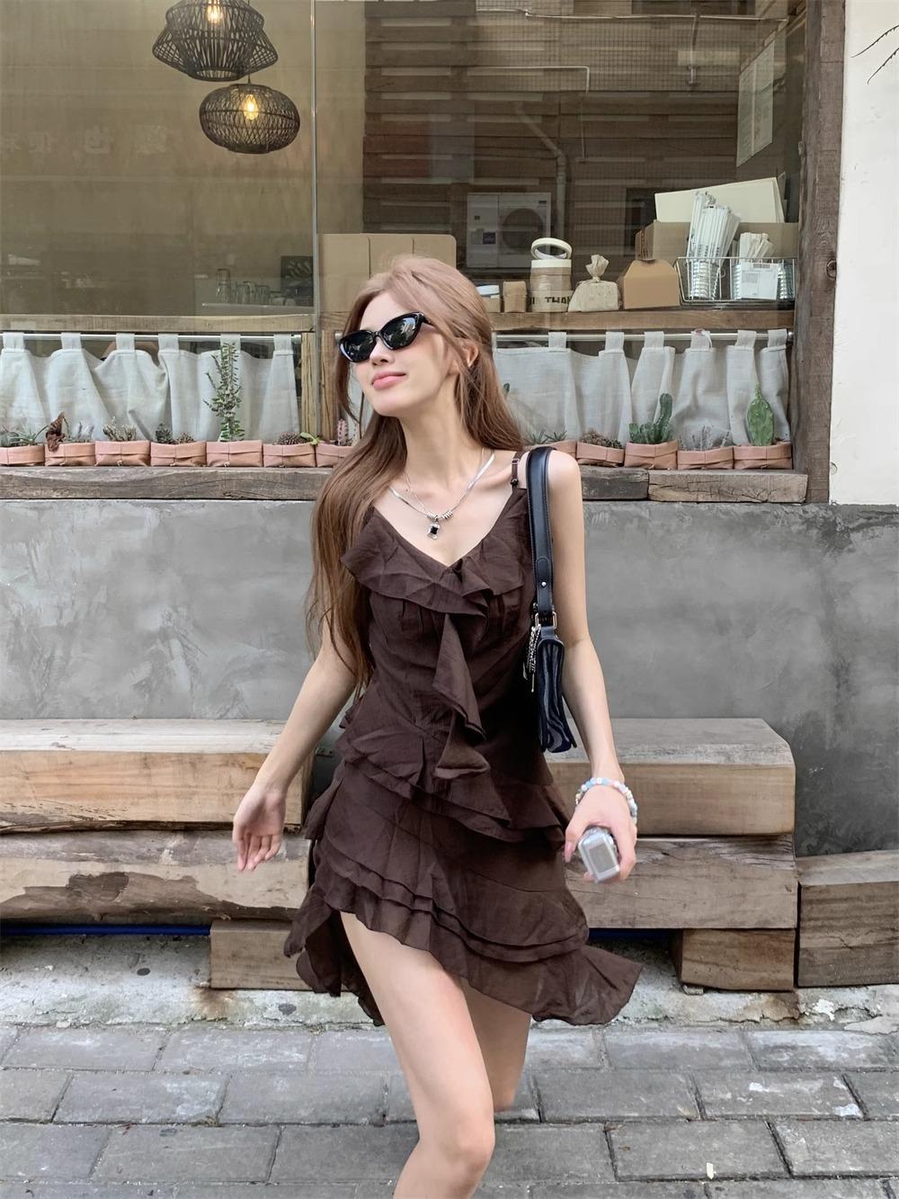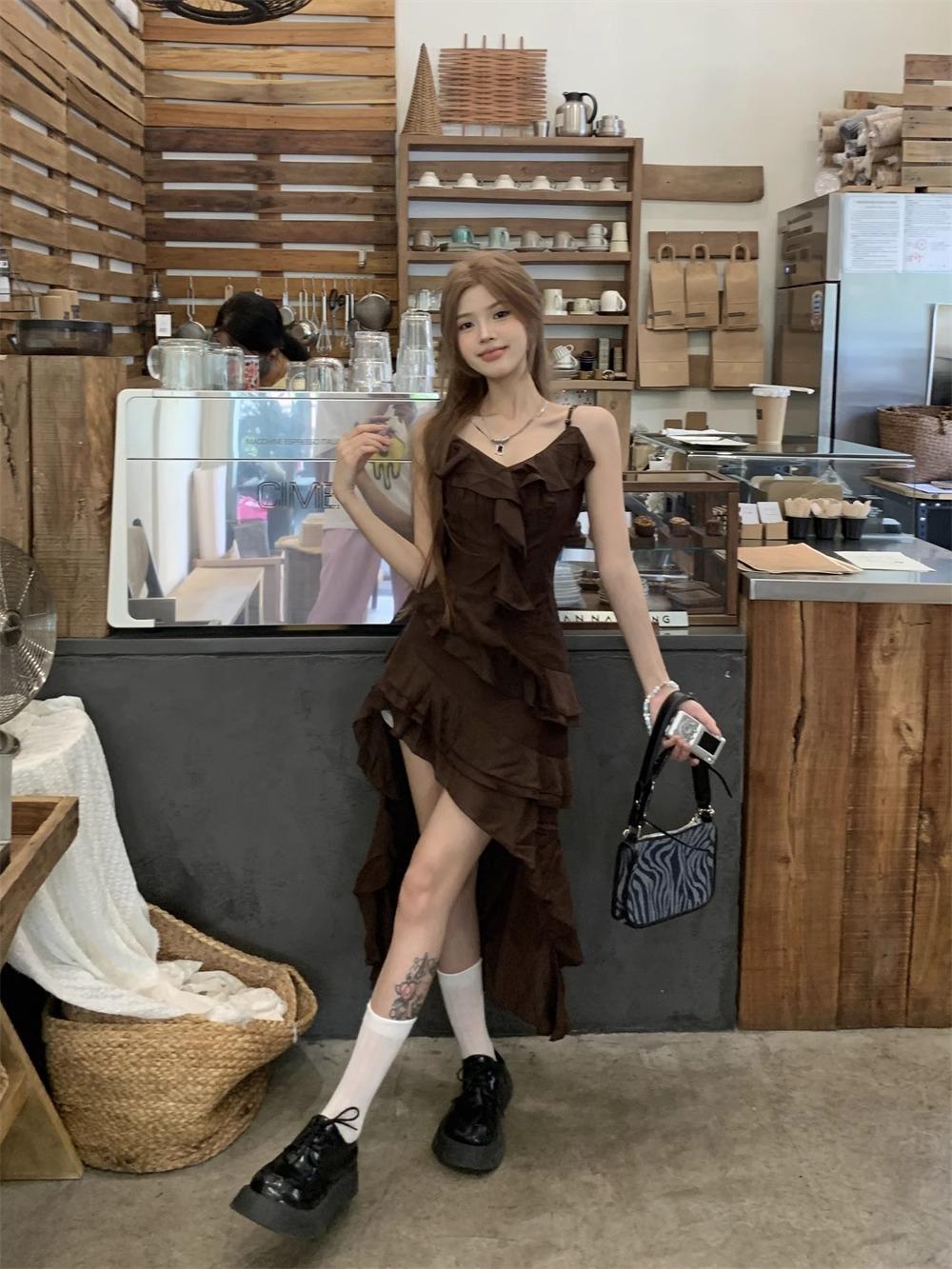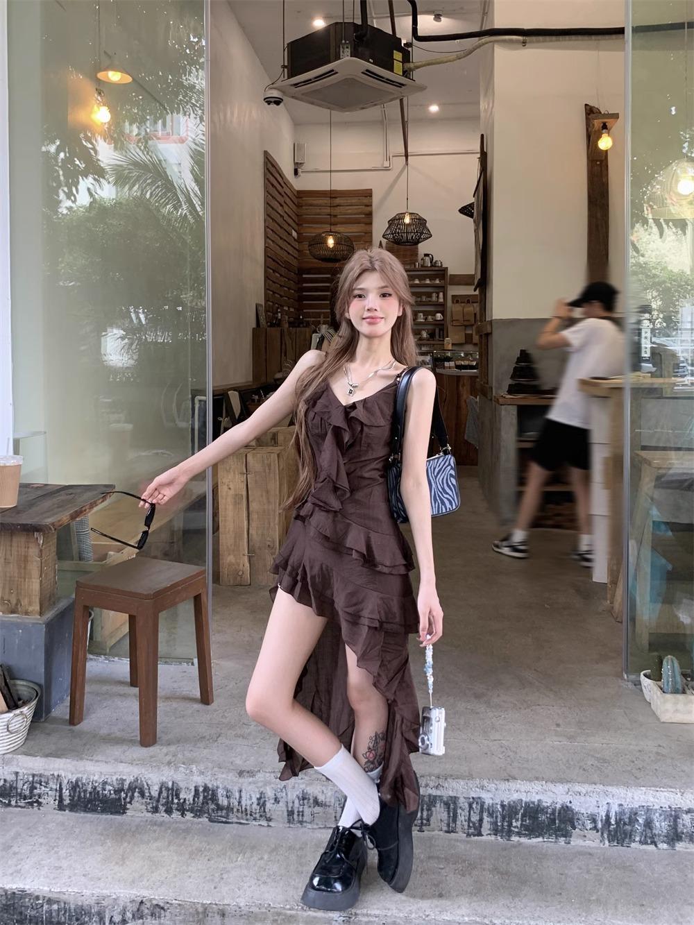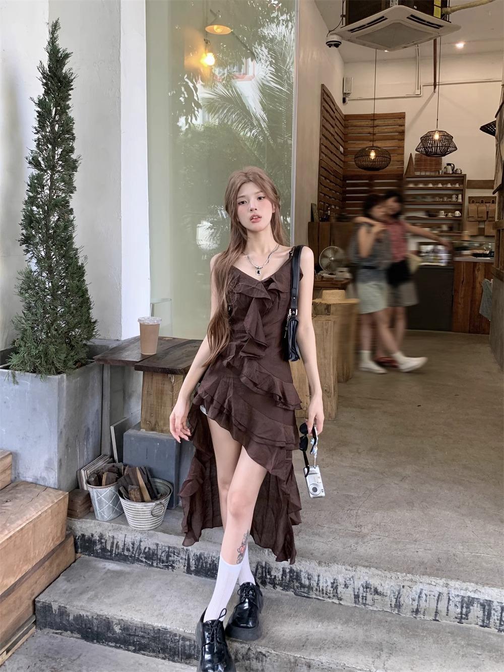 Vestido Lindo de Alças com Babados Estilo Francês Verão Elegante Irregular Férias à Beira-Mar Cintura Saia A-line