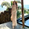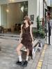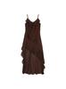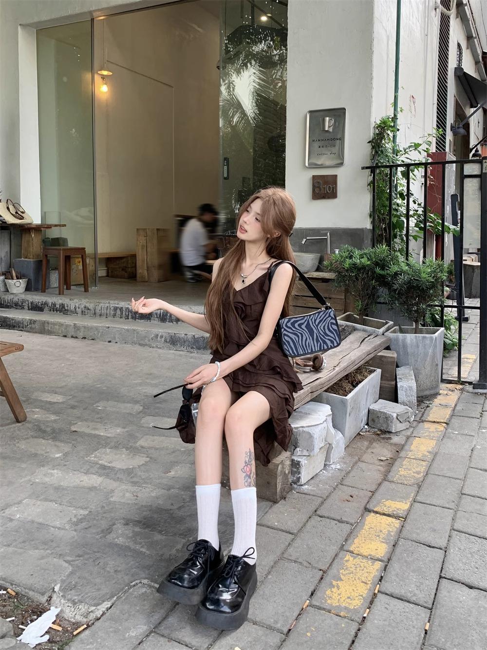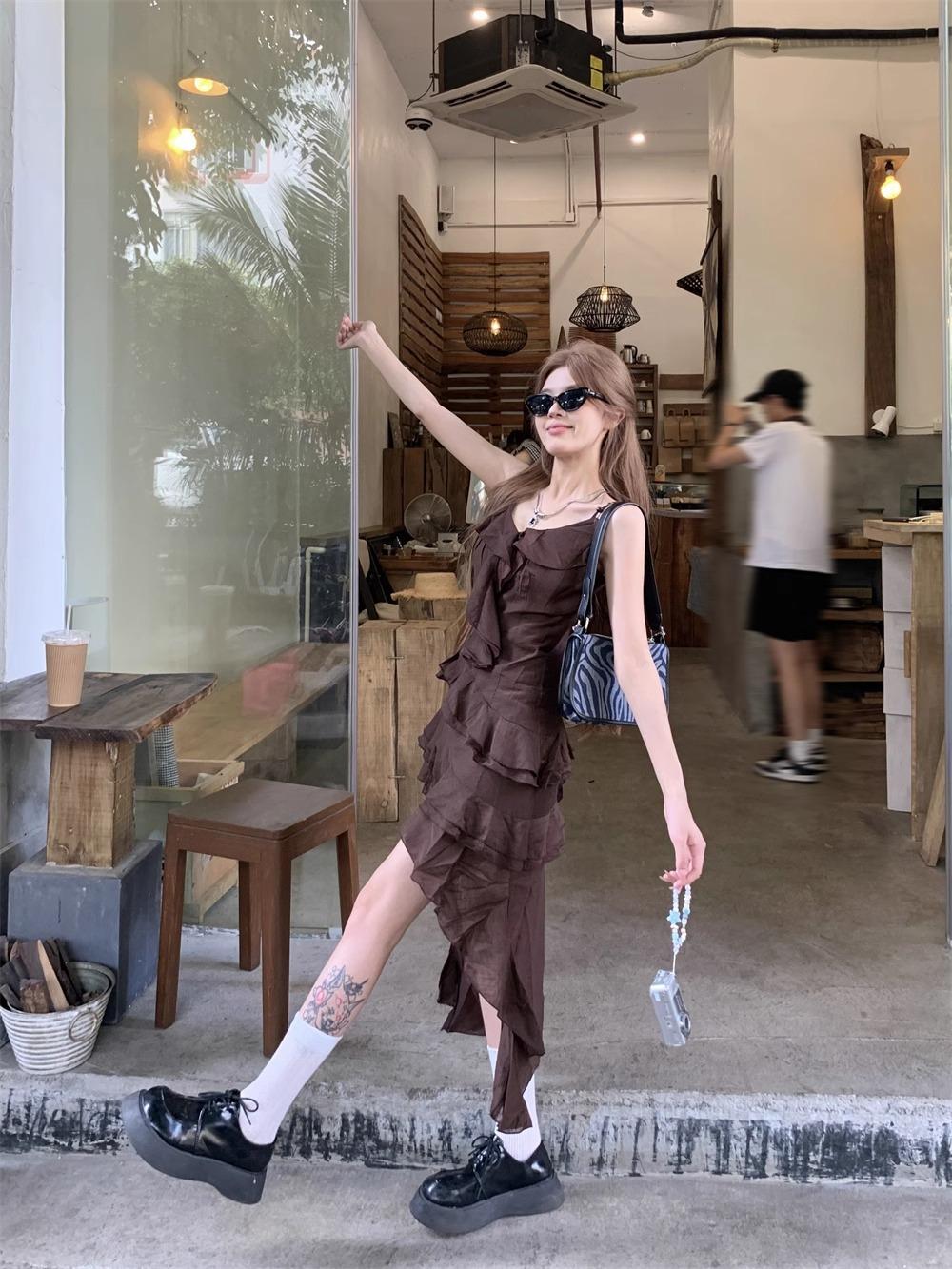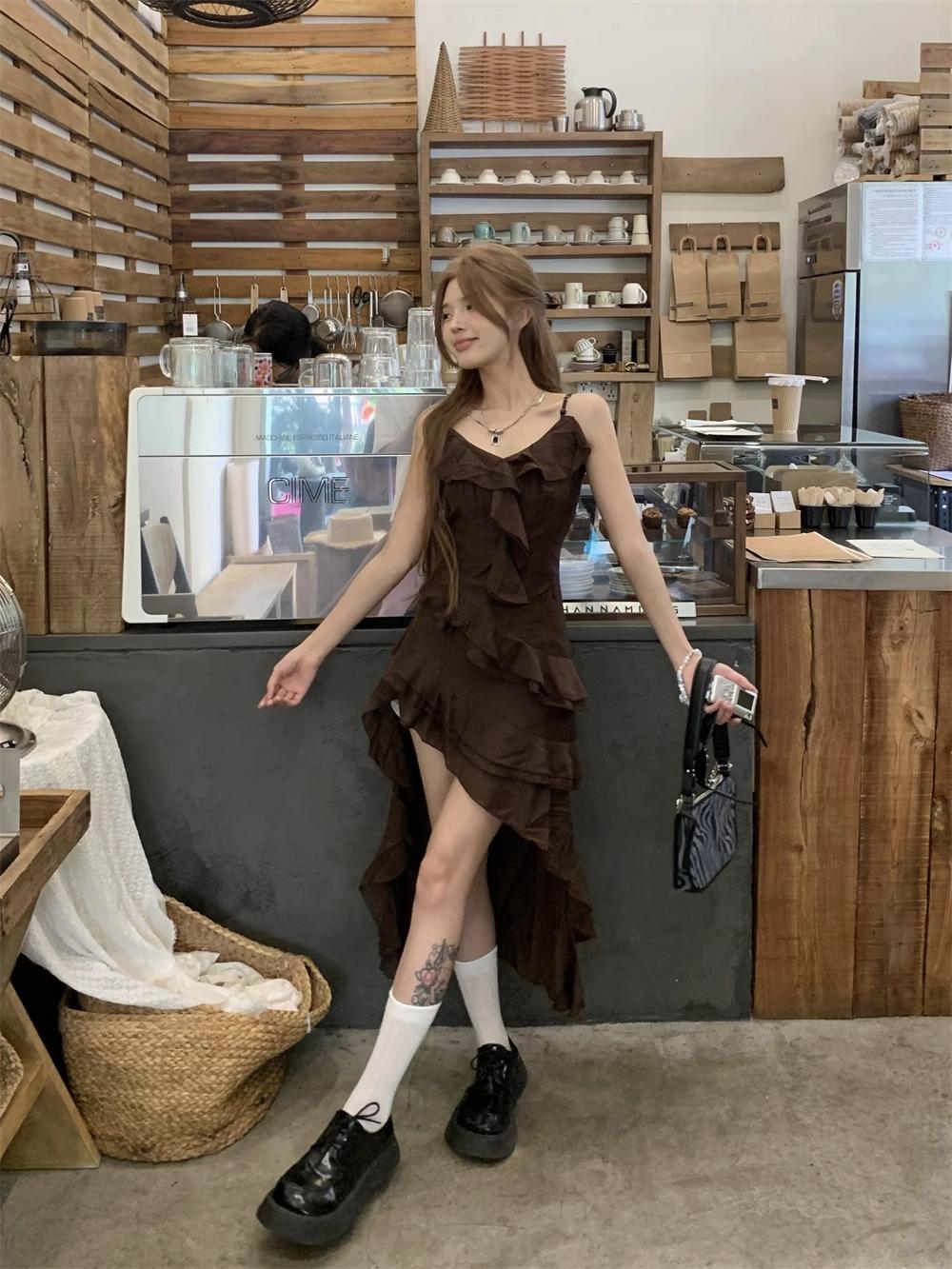 Vestido Lindo de Alças com Babados Estilo Francês Verão Elegante Irregular Férias à Beira-Mar Cintura Saia A-line