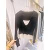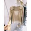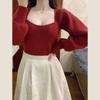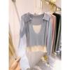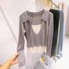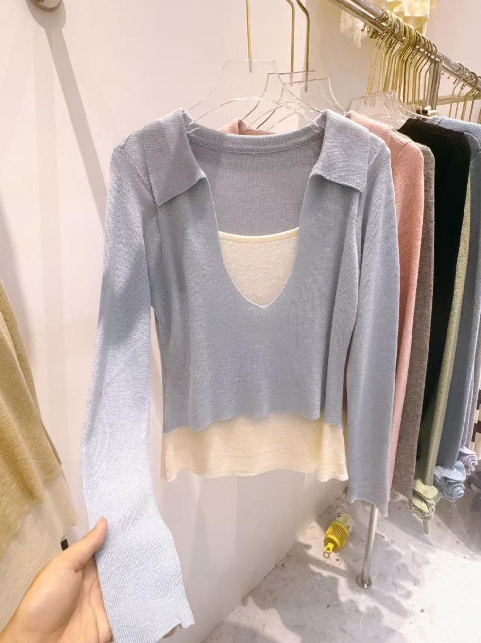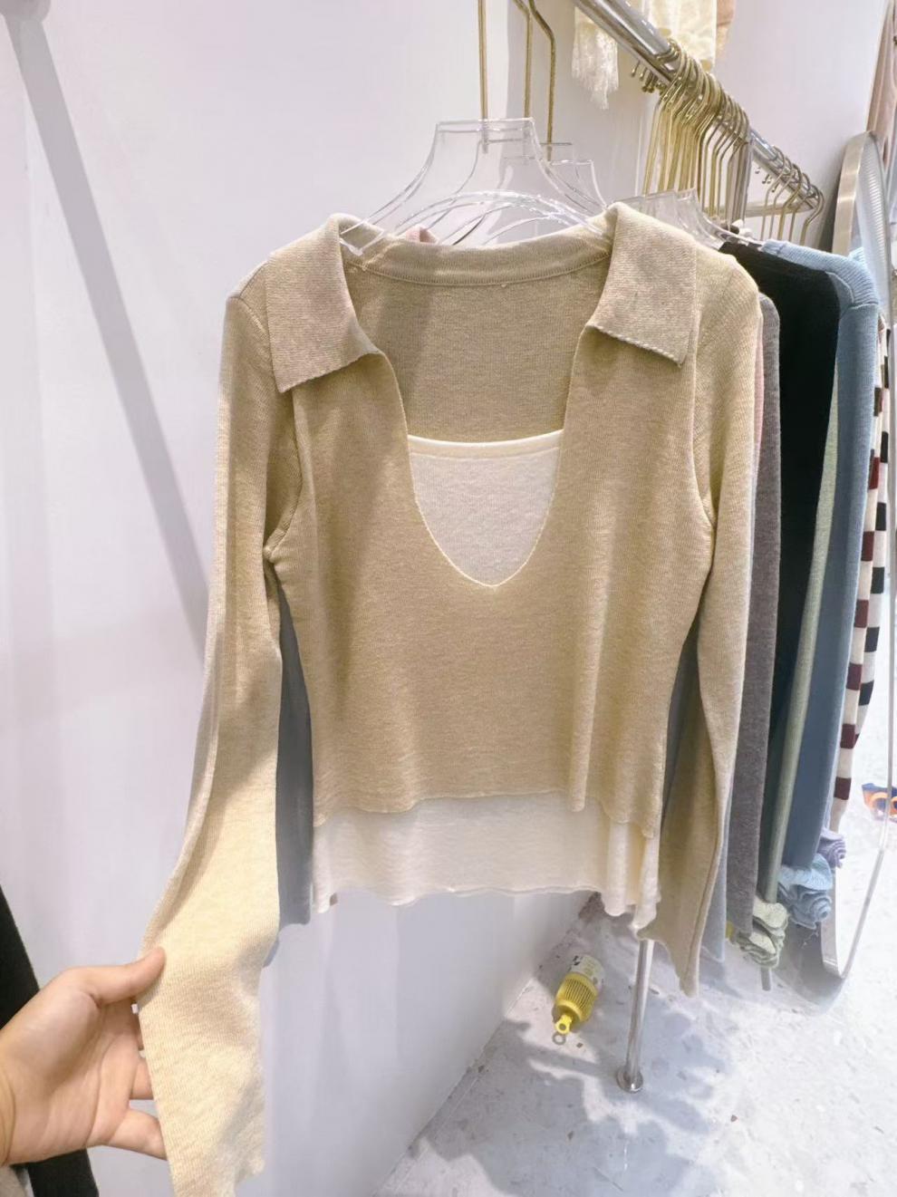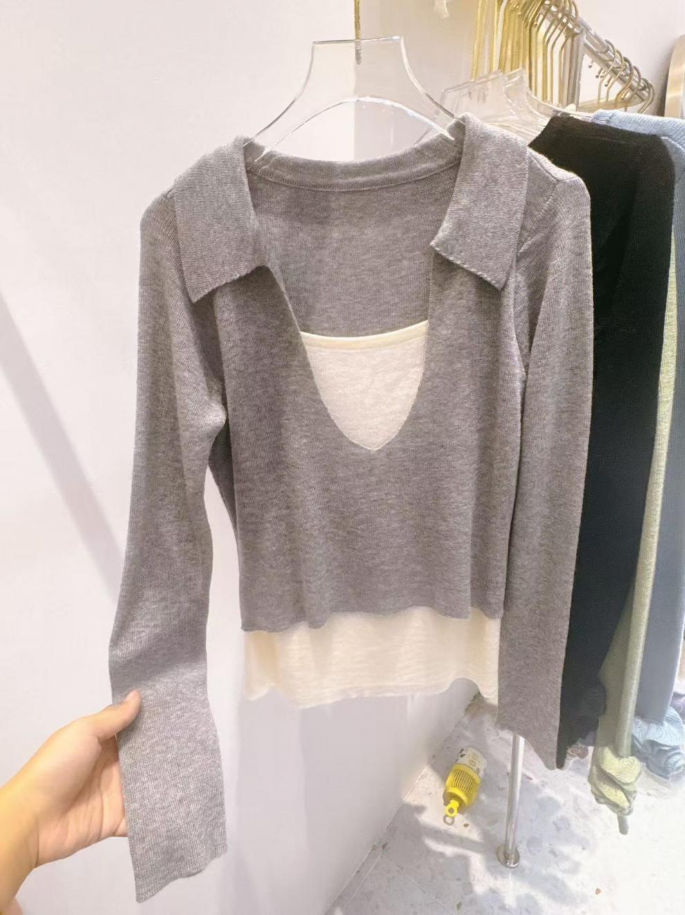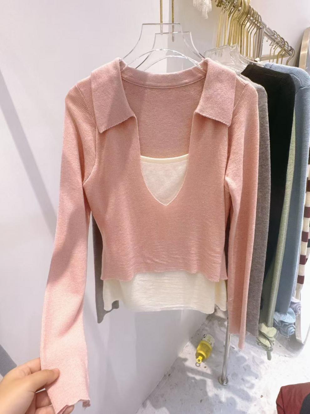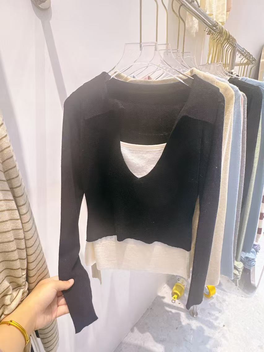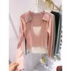 Falso duas peças gola quadrada design manga comprida malha suéter feminino 2025 primavera preguiçoso empilhado moda base interna top moderno