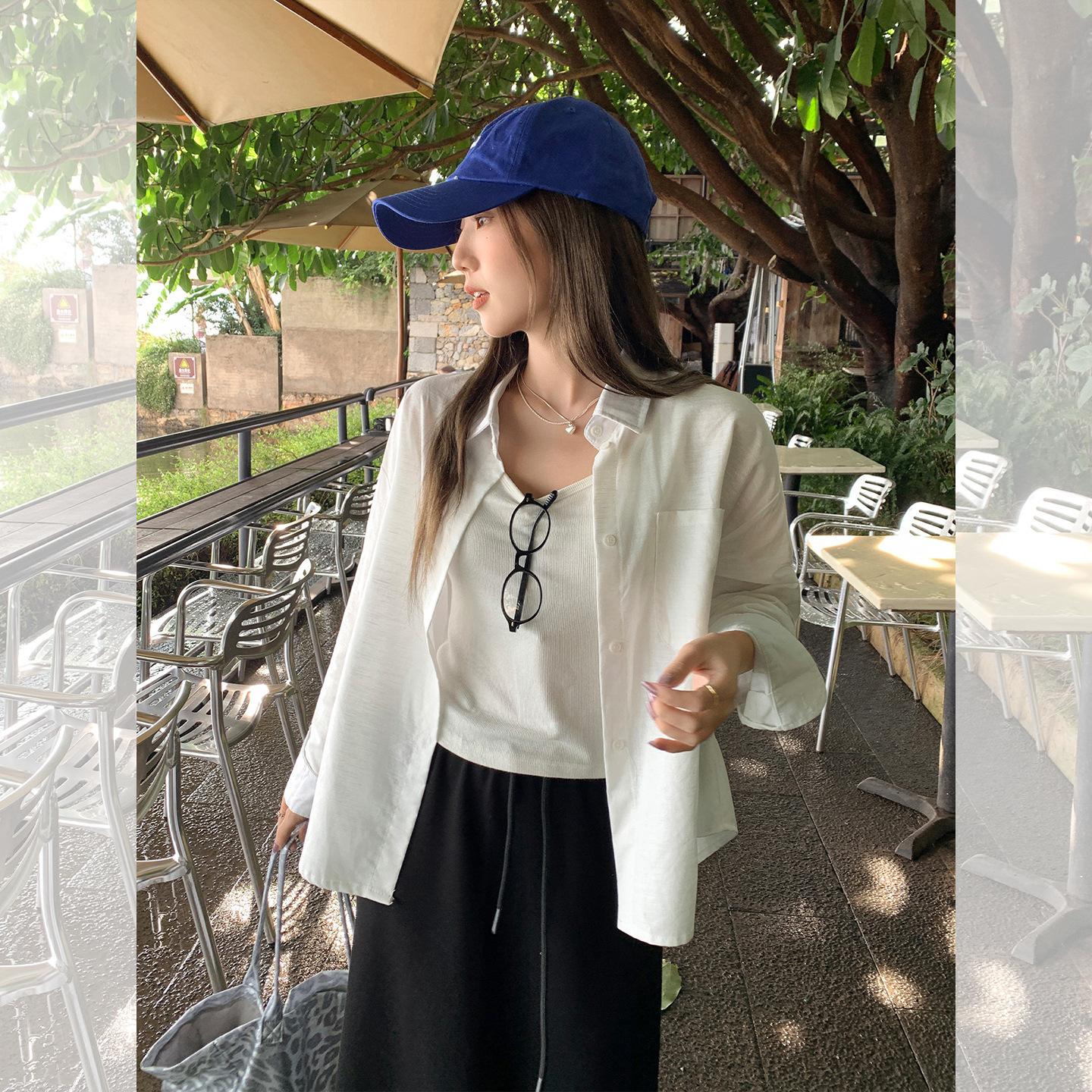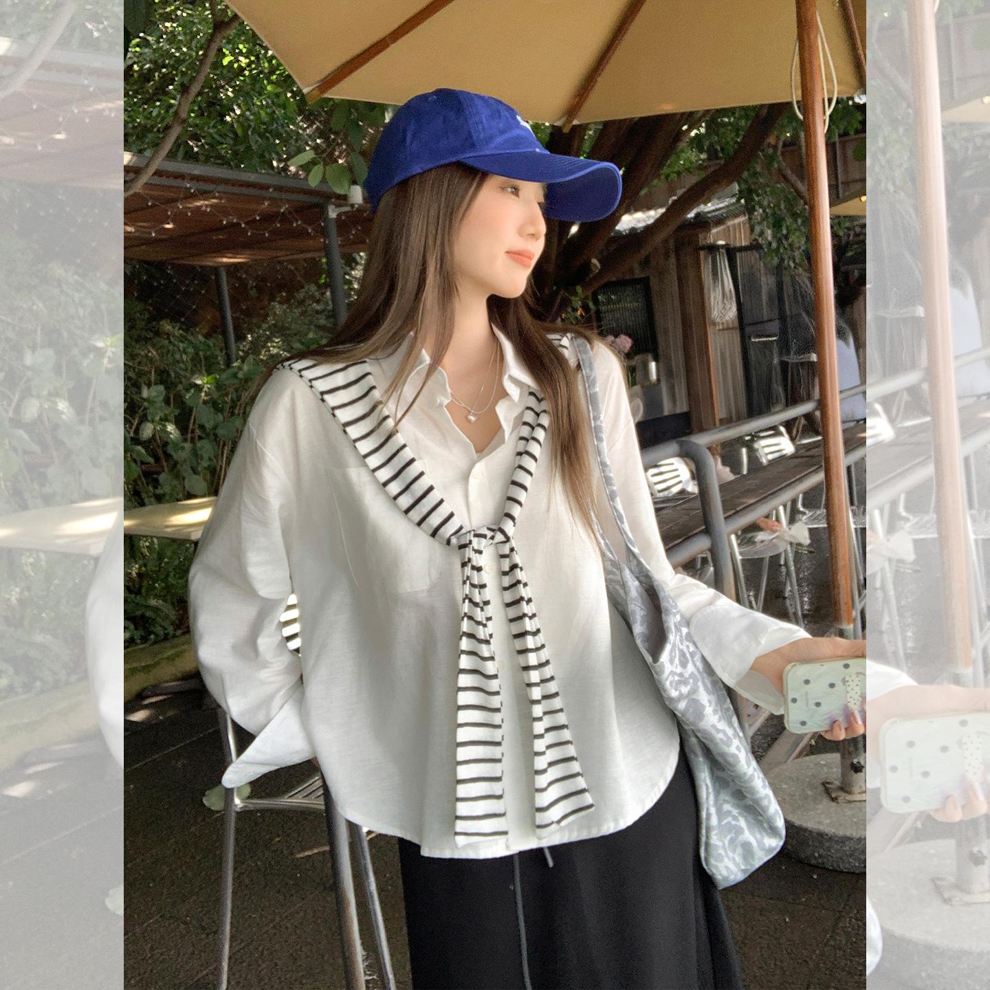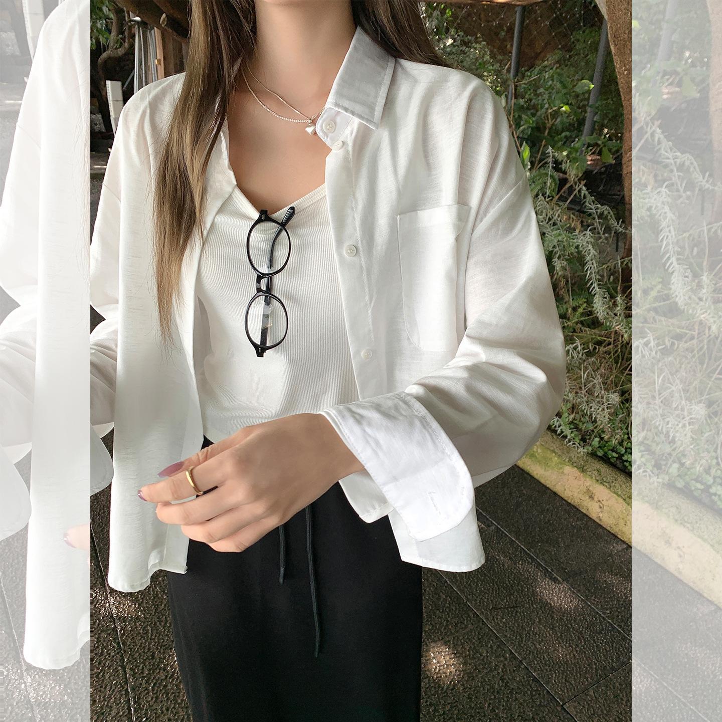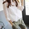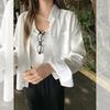 Foto real estilo preguiçoso cor sólida bolso branco solto emagrecimento camisa gola baixa mulheres fino versátil casual camisa outono