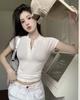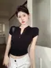 Camiseta Feminina Estilo Americano Hot Girl Decote V Design de Botões Manga Curta Verão 2025 Novo Estilo Coreano Ajustada Nicho Top Moderno