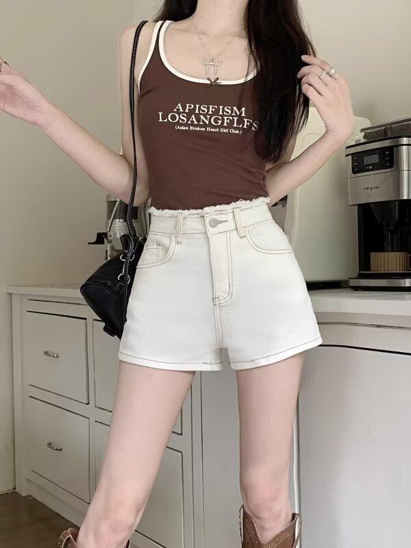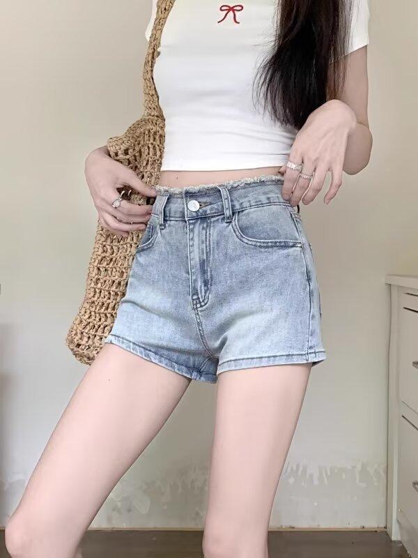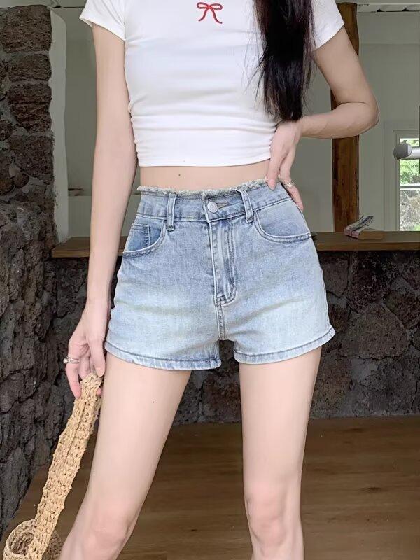 Verão 2024 Novo Shorts Jeans Bordados com Bolso para Garota Quente Feminino Cintura Alta Linha A Super Shorts Calças Curtas Justas