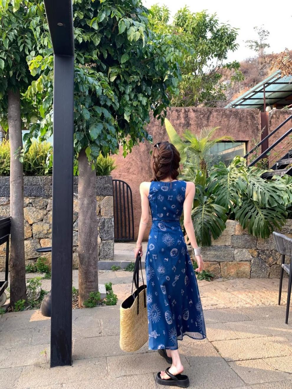 Vestido de Suspensório Estilo Férias com Decote em V Estampado, Feminino e Versátil, Look que Afina a Cintura, Saia Longa Retrô em A, Novo Estilo de Verão