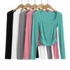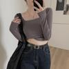 Camiseta pura e sexy de gola quadrada e barra curva para meninas, outono, nova, justa, básica, feminina