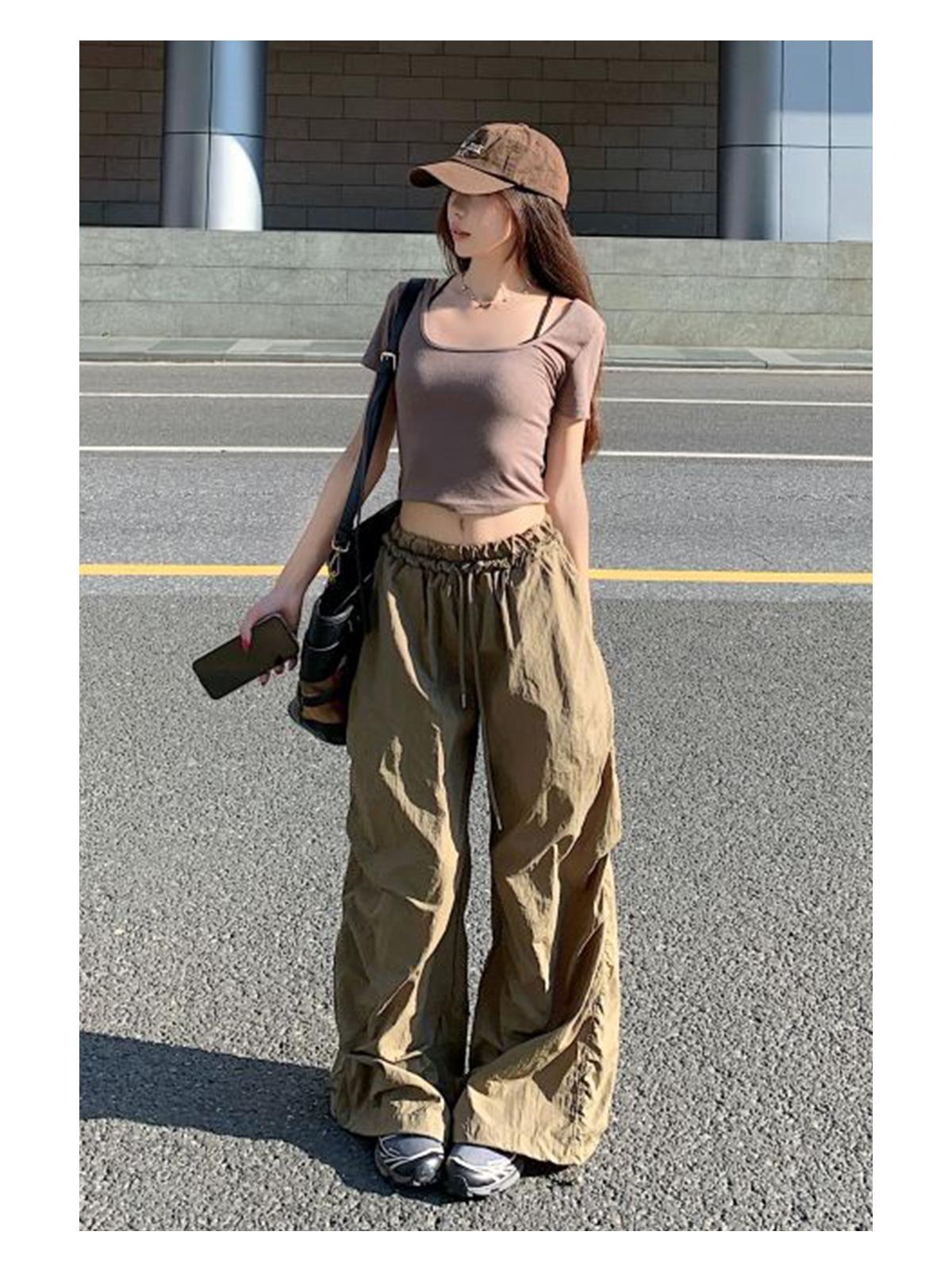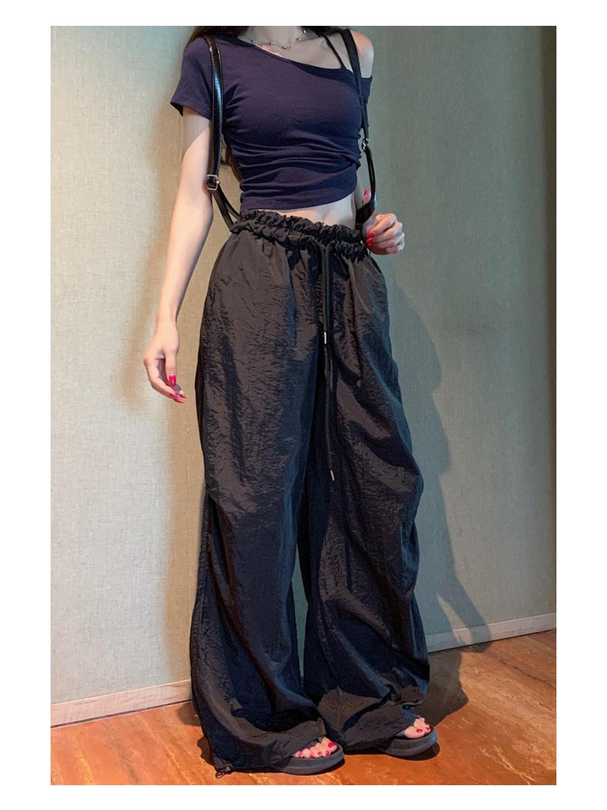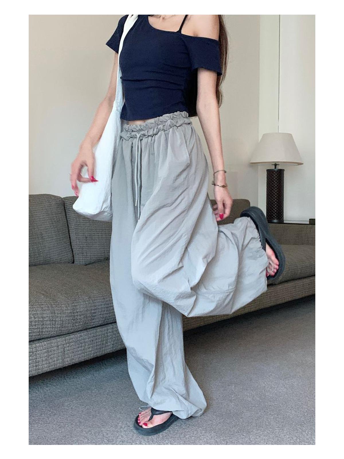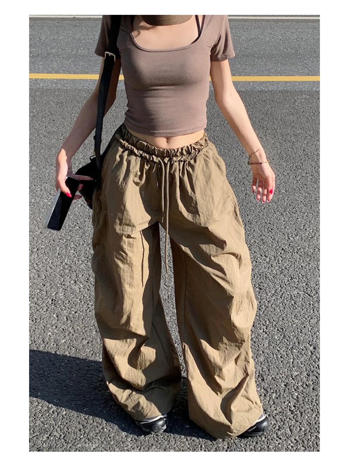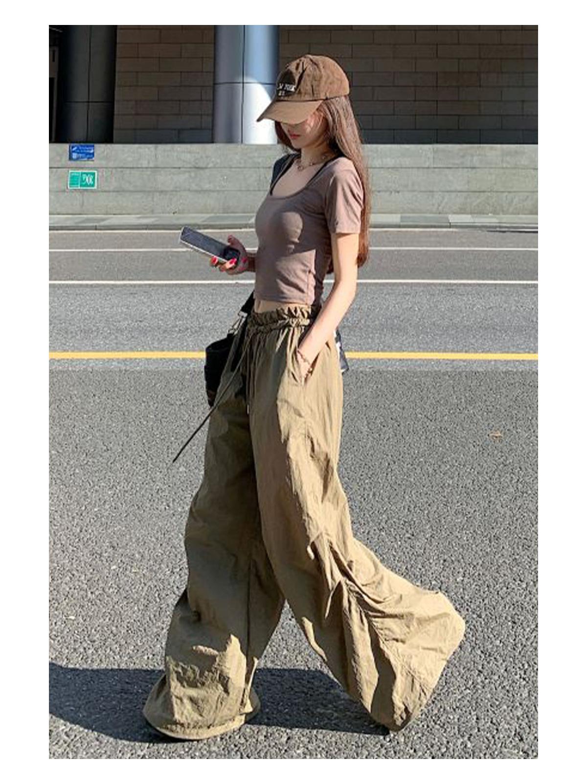 Calças cargo paraquedas retrô americanas com cordão plissado de secagem rápida para mulheres, verão, finas, versáteis, esportivas, de perna larga