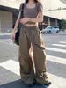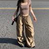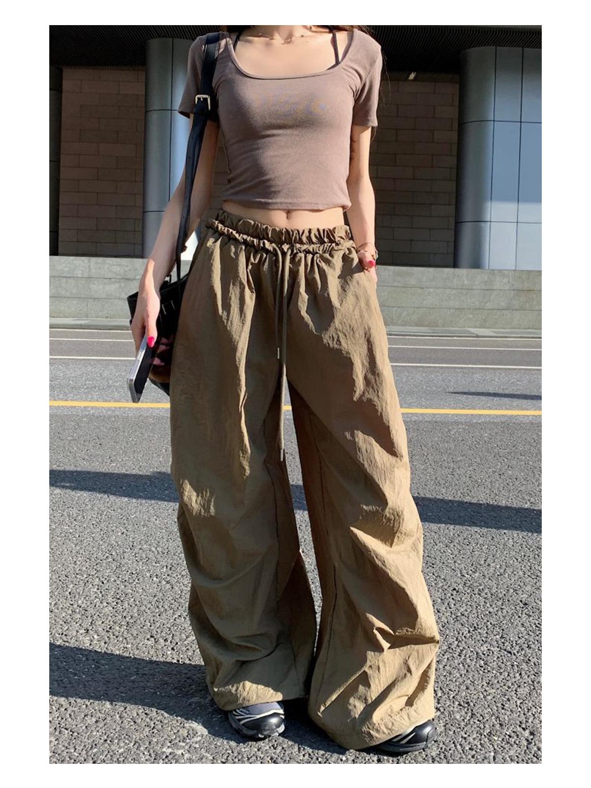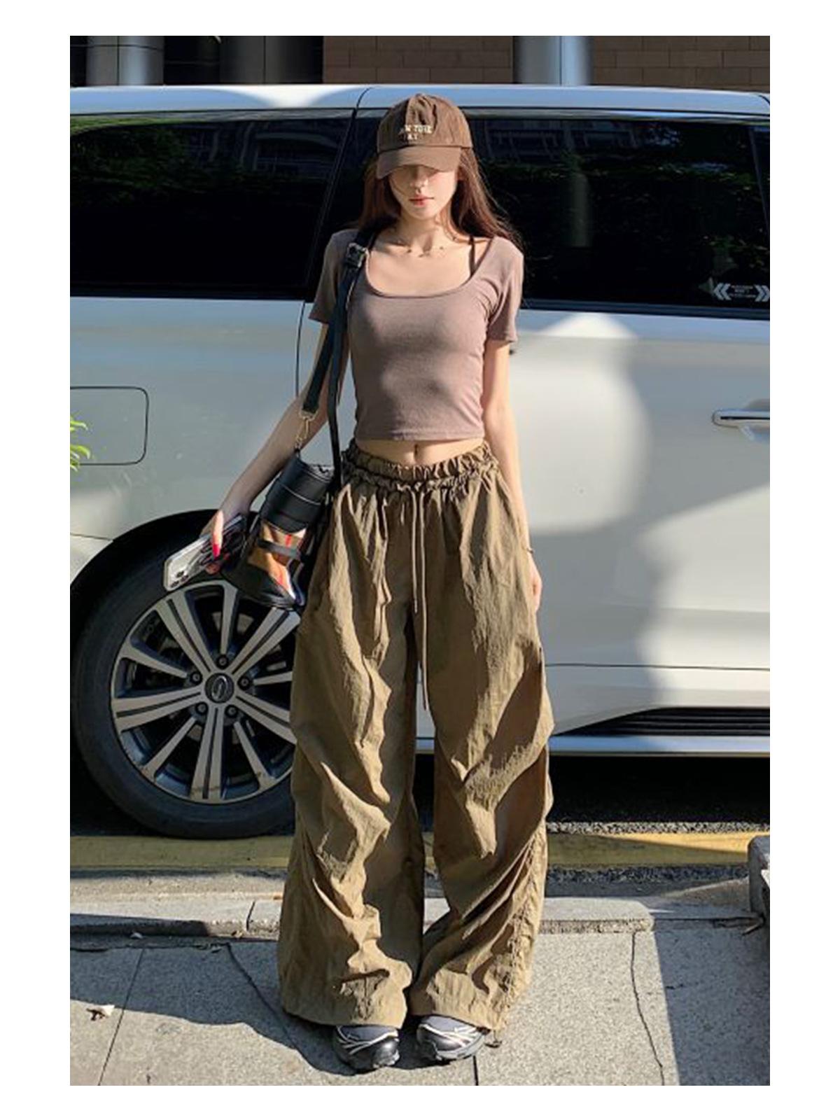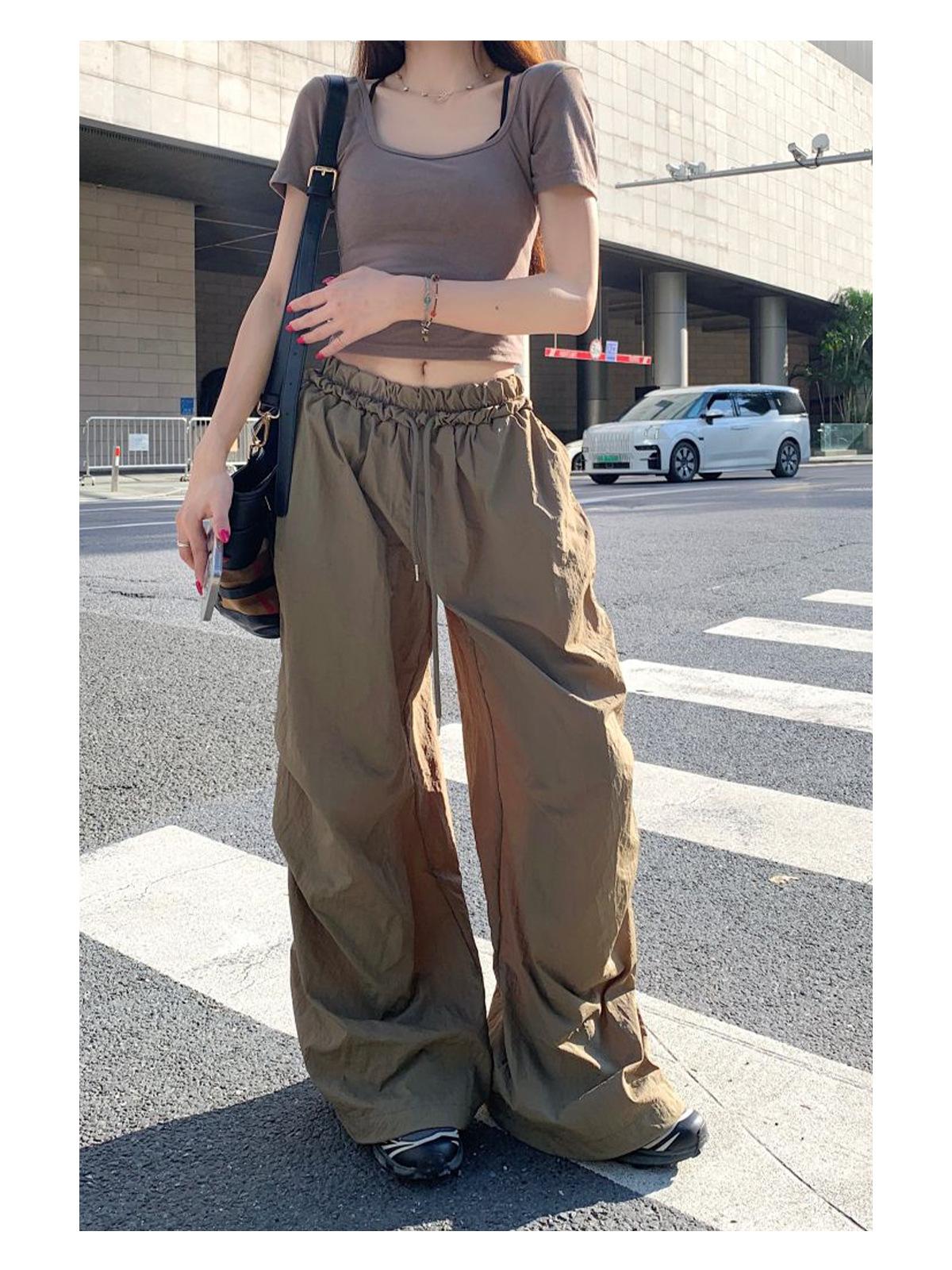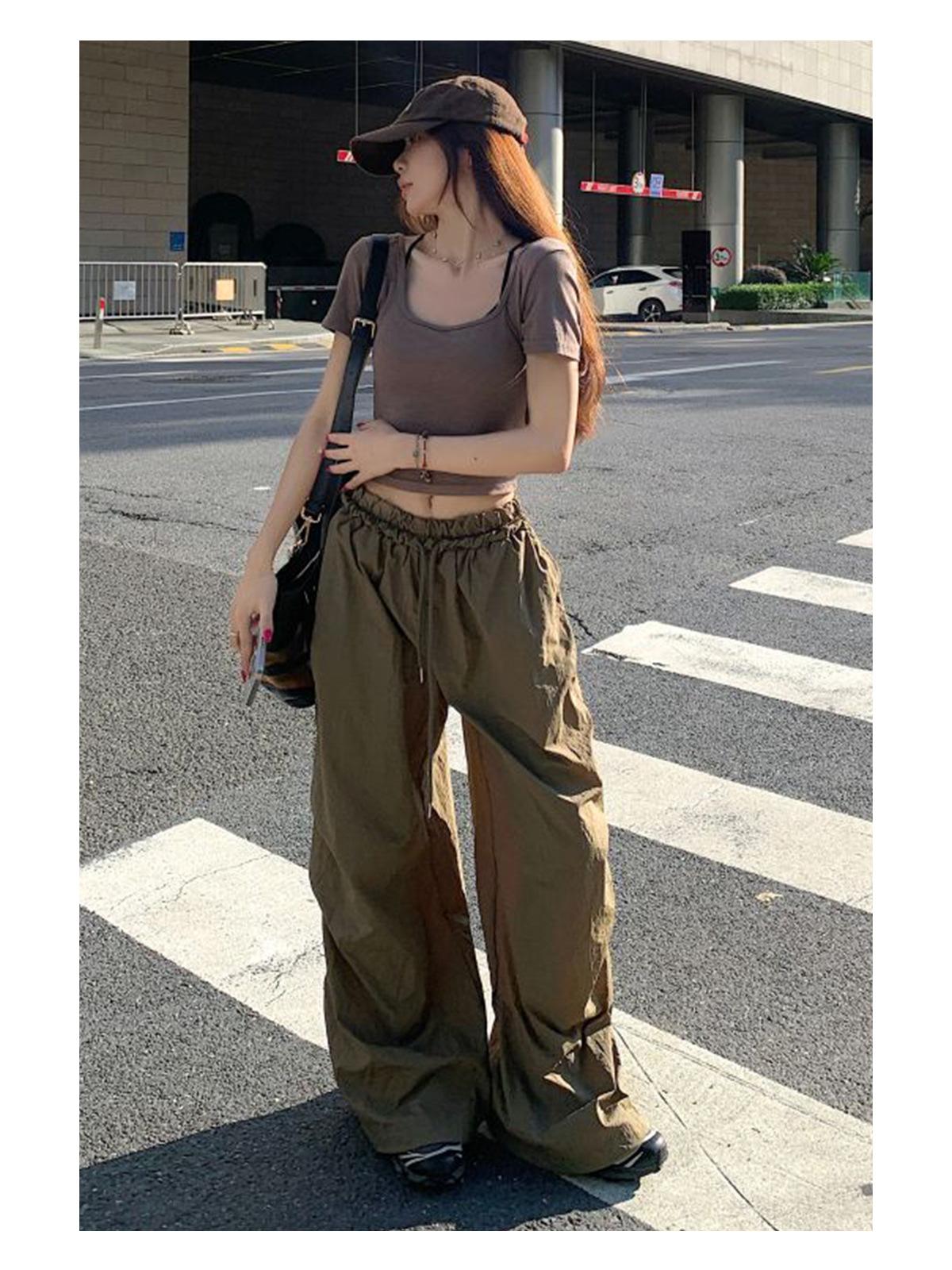Calças cargo paraquedas retrô americanas com cordão plissado de secagem rápida para mulheres, verão, finas, versáteis, esportivas, de perna larga
