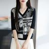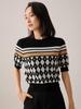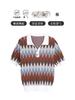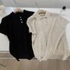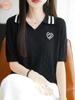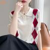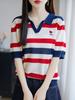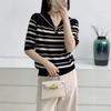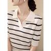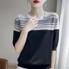 Verão 2025 Novo Tricô de Algodão Tencel com Capuz Manga Curta Feminino Listrado em Blocos de Cor Pulôver Camiseta para Usar por Baixo