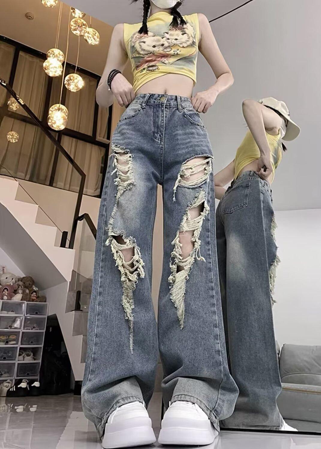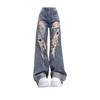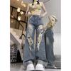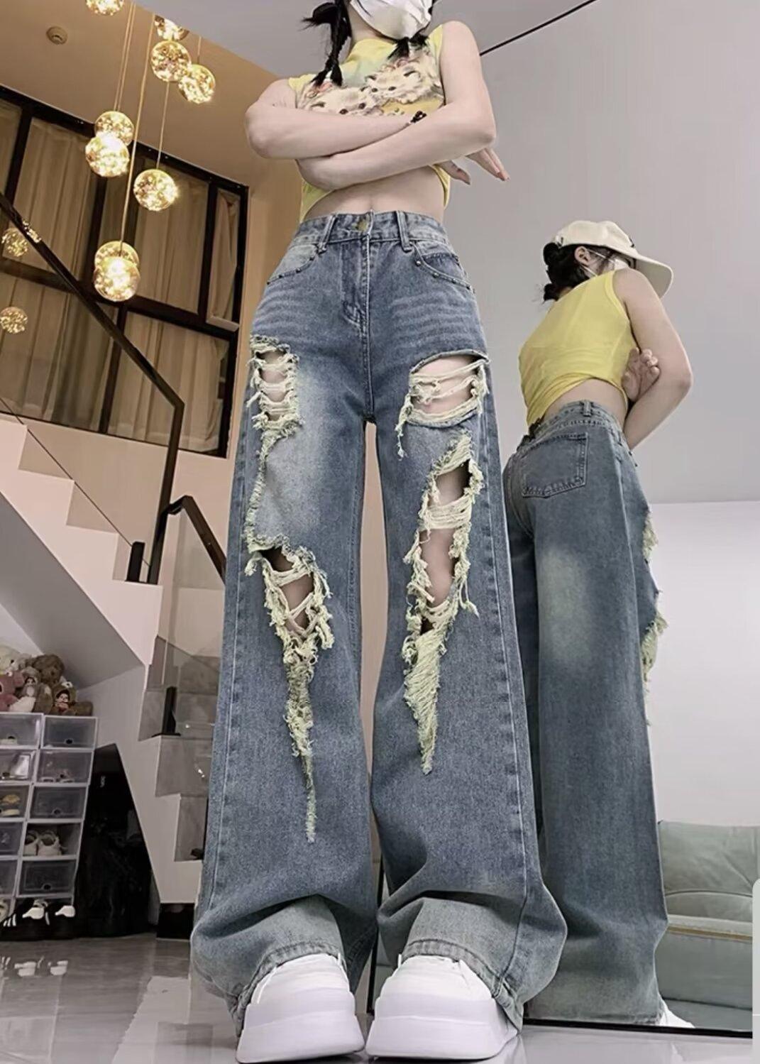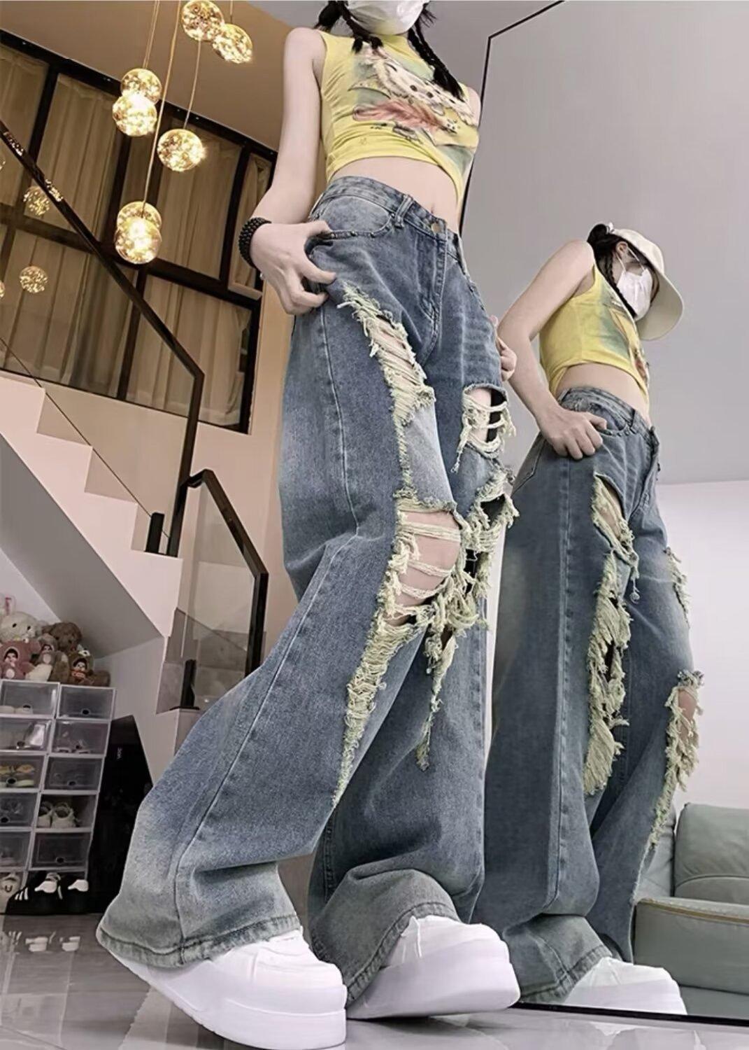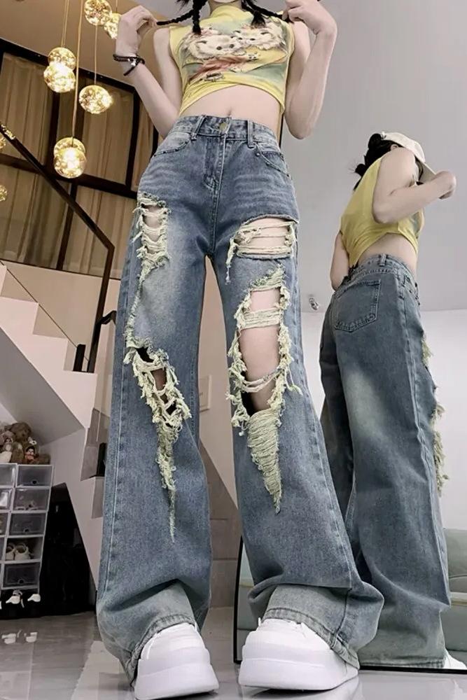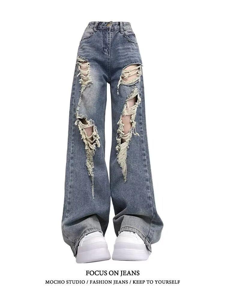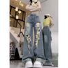 Jeans estilo americano retrô lavado rasgado feminino 2024 novo verão cintura alta solto emagrecimento perna reta perna larga calças