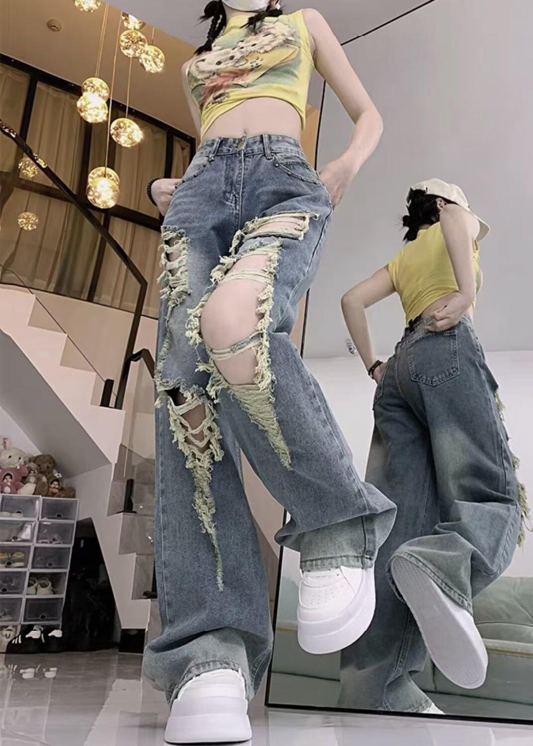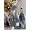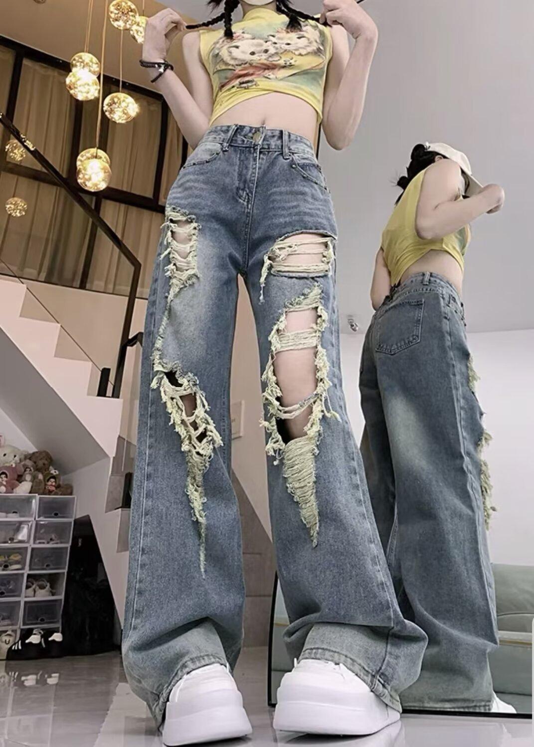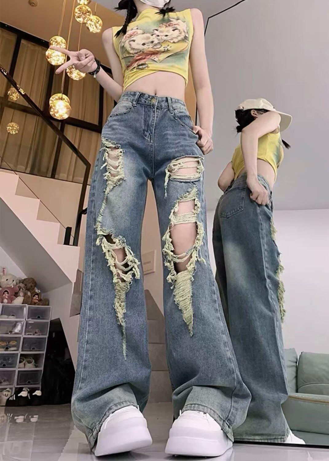 Jeans estilo americano retrô lavado rasgado feminino 2024 novo verão cintura alta solto emagrecimento perna reta perna larga calças