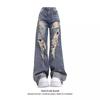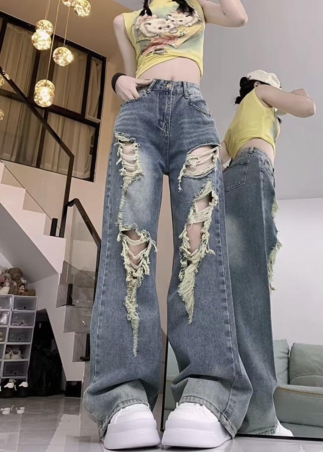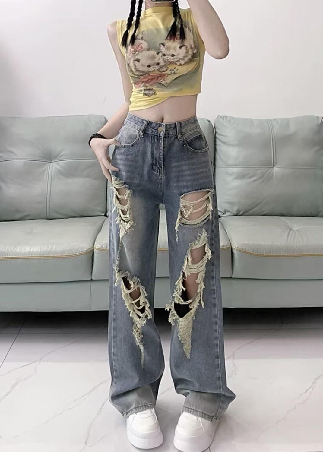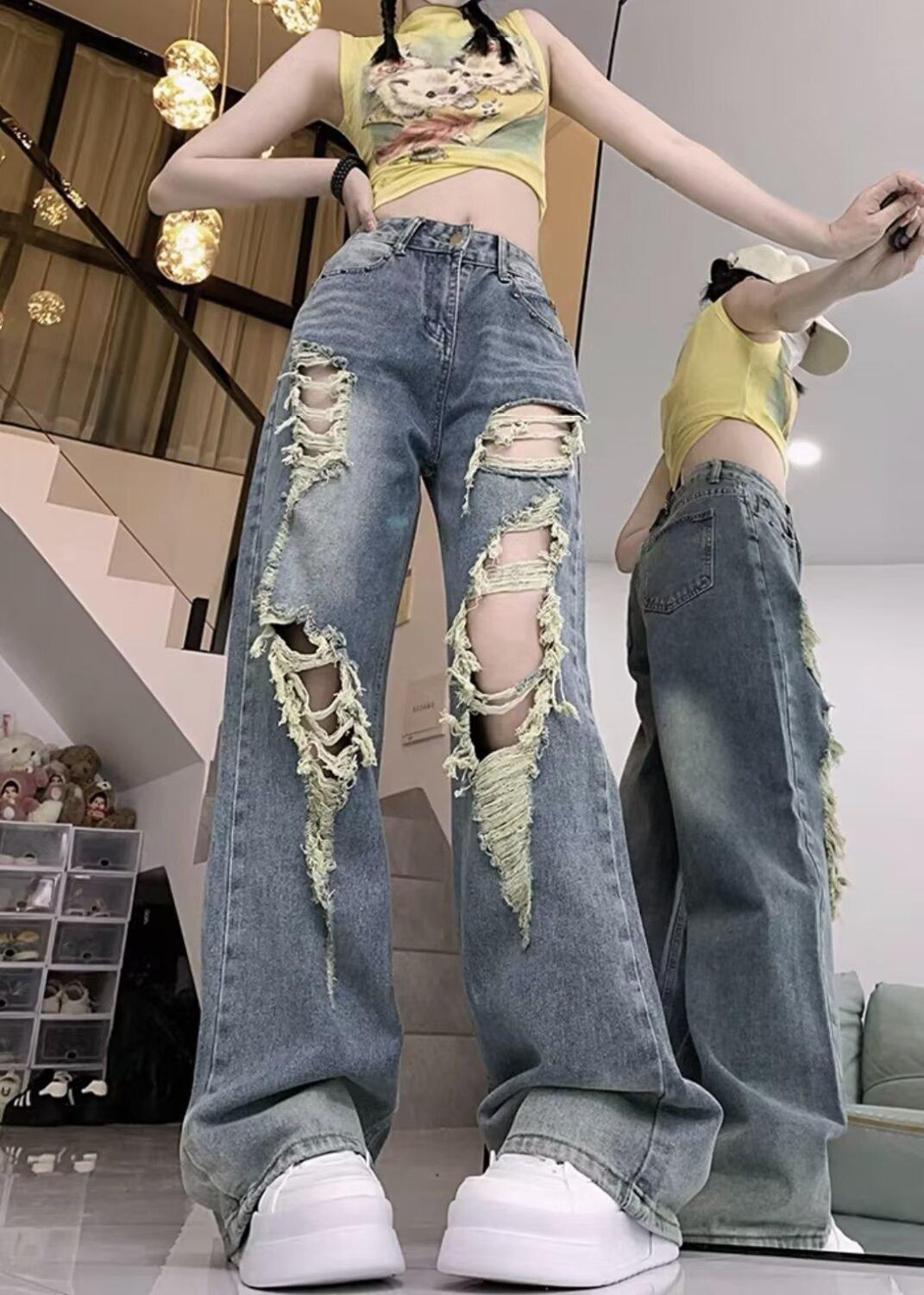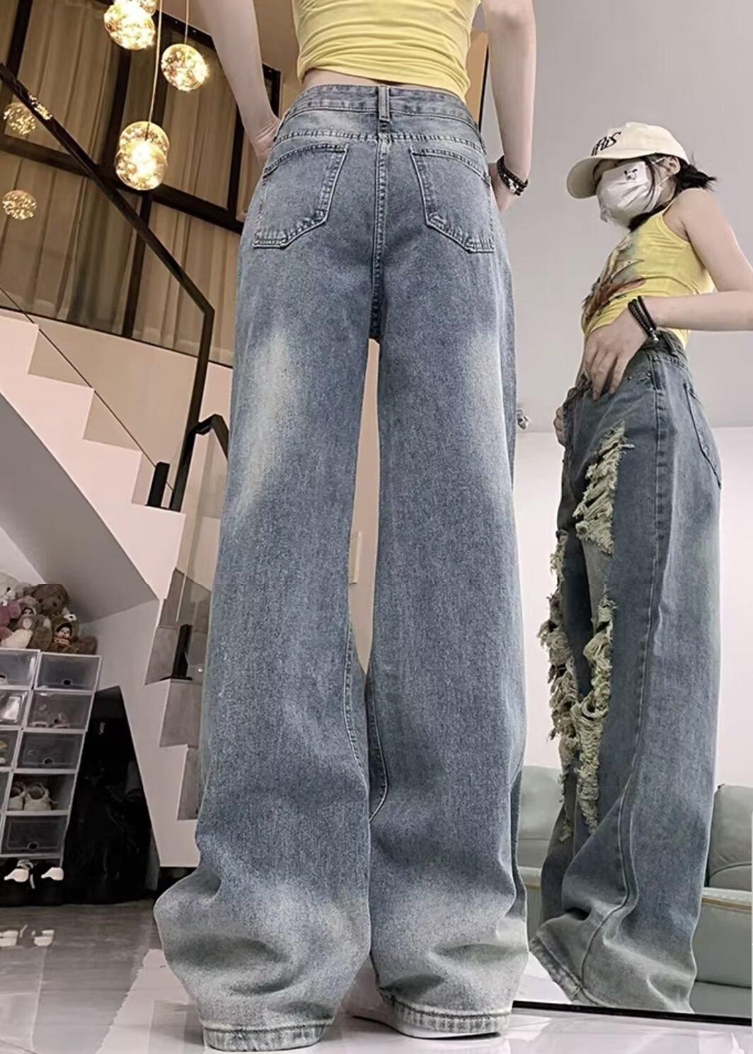 Jeans estilo americano retrô lavado rasgado feminino 2024 novo verão cintura alta solto emagrecimento perna reta perna larga calças